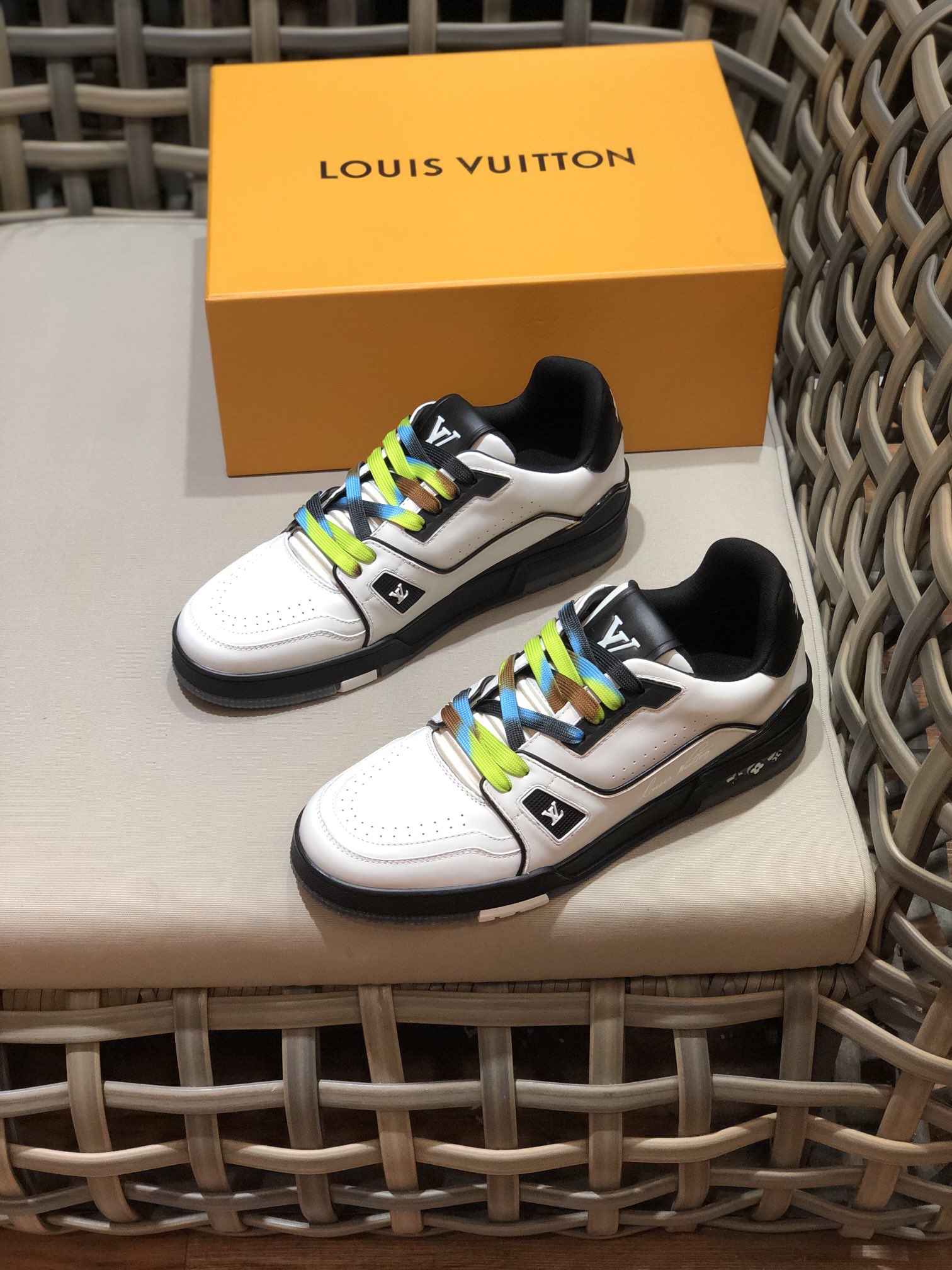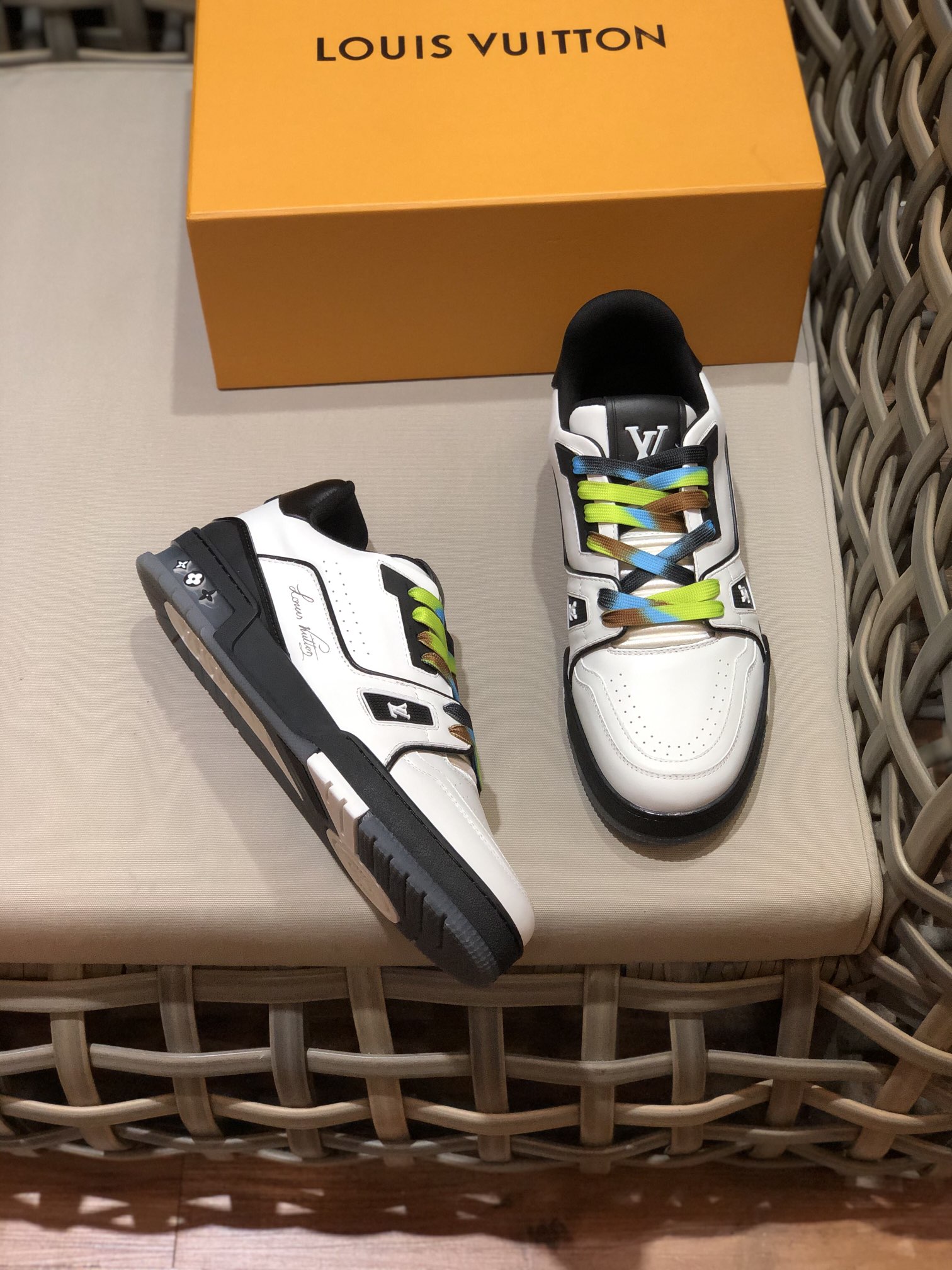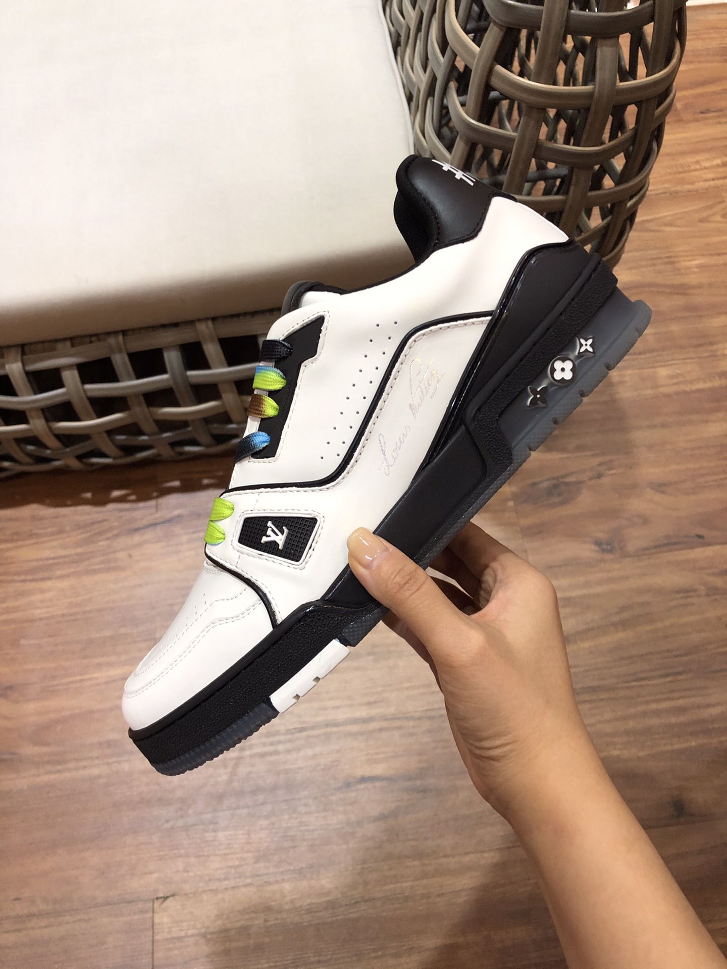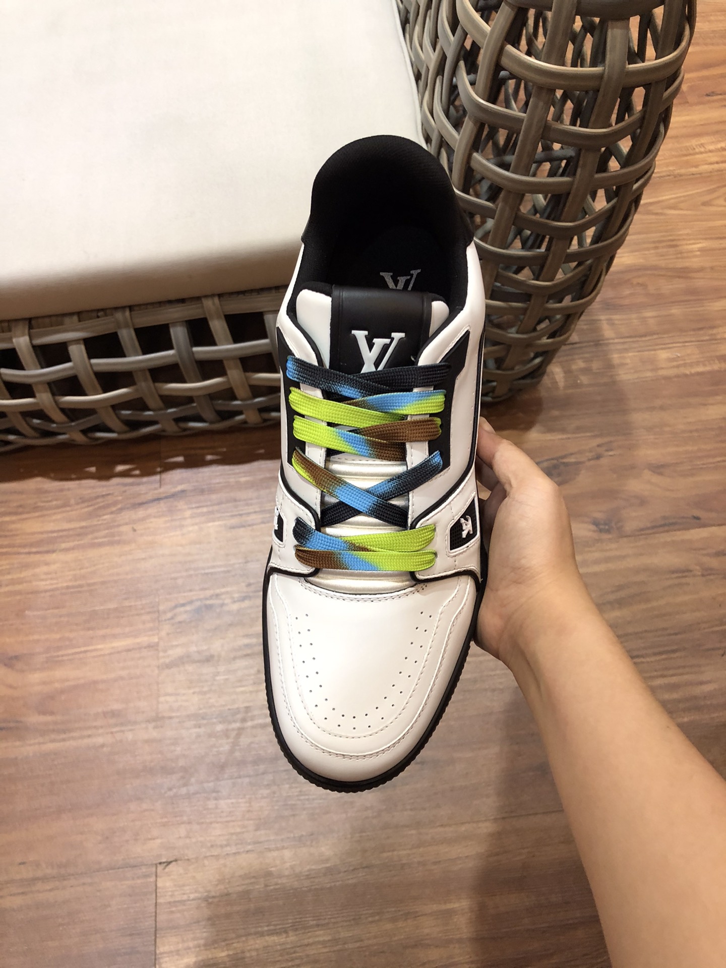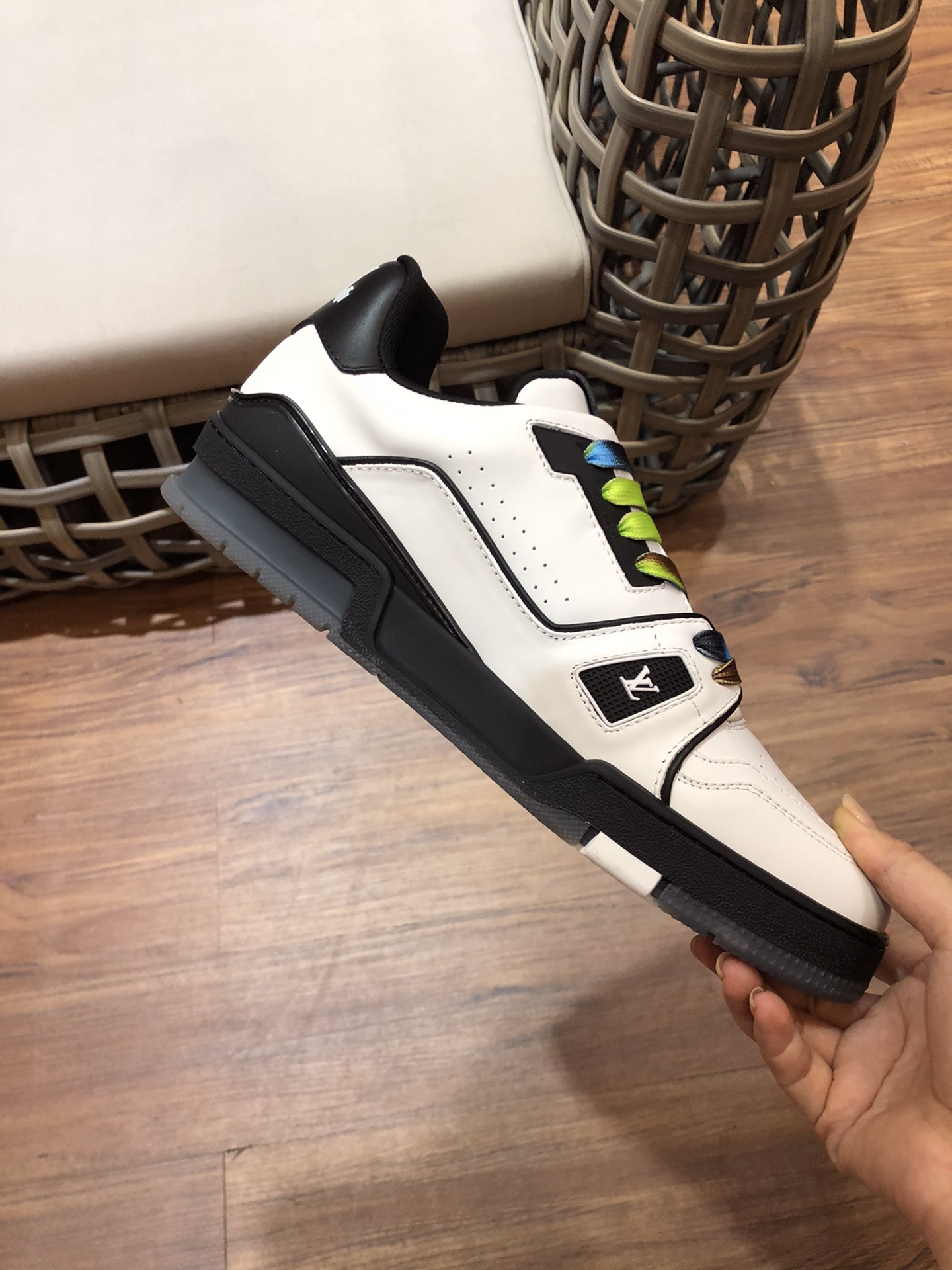 L 2021 new color scheme, men's Trainer sneakers, made with original embossed grained calfskin, tongue drip-glue logo decoration, rear #54 classic logo decoration, original contrasting outsole super good-looking, this L• Trainer sneaker appeared at the 2021 spring-summer men's fashion show, handwritten notes indicate the shoe structure, clear stitching can be cut by customers to complete the design, showing exquisite craftsmanship everywhere. The outsole is decorated with Monogram Flowers pattern. A classic basketball shoe style, 100% head-turning rate!