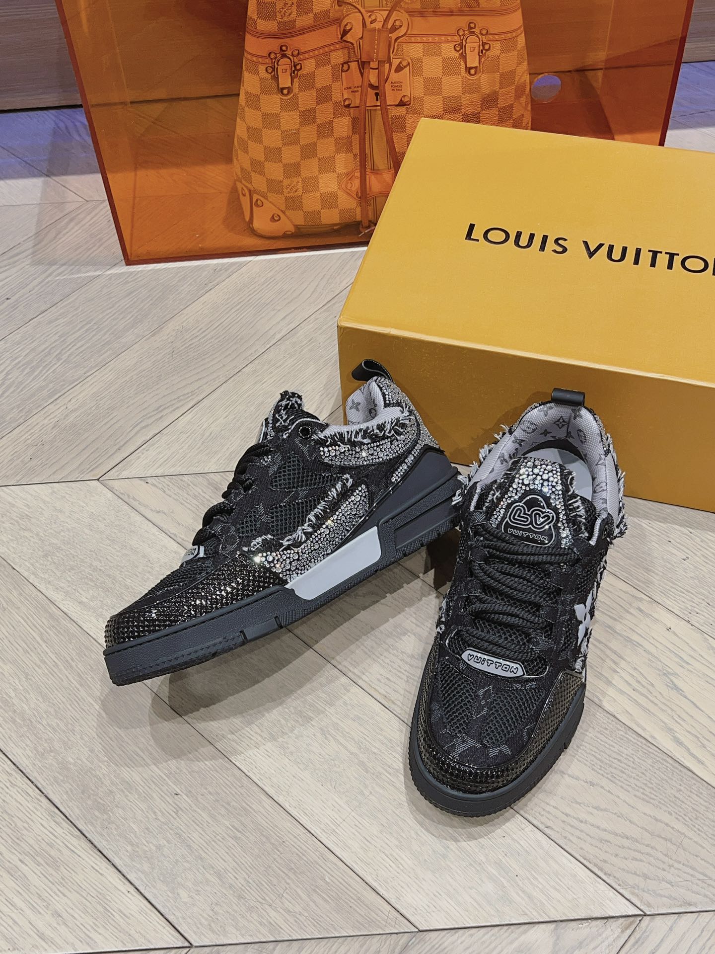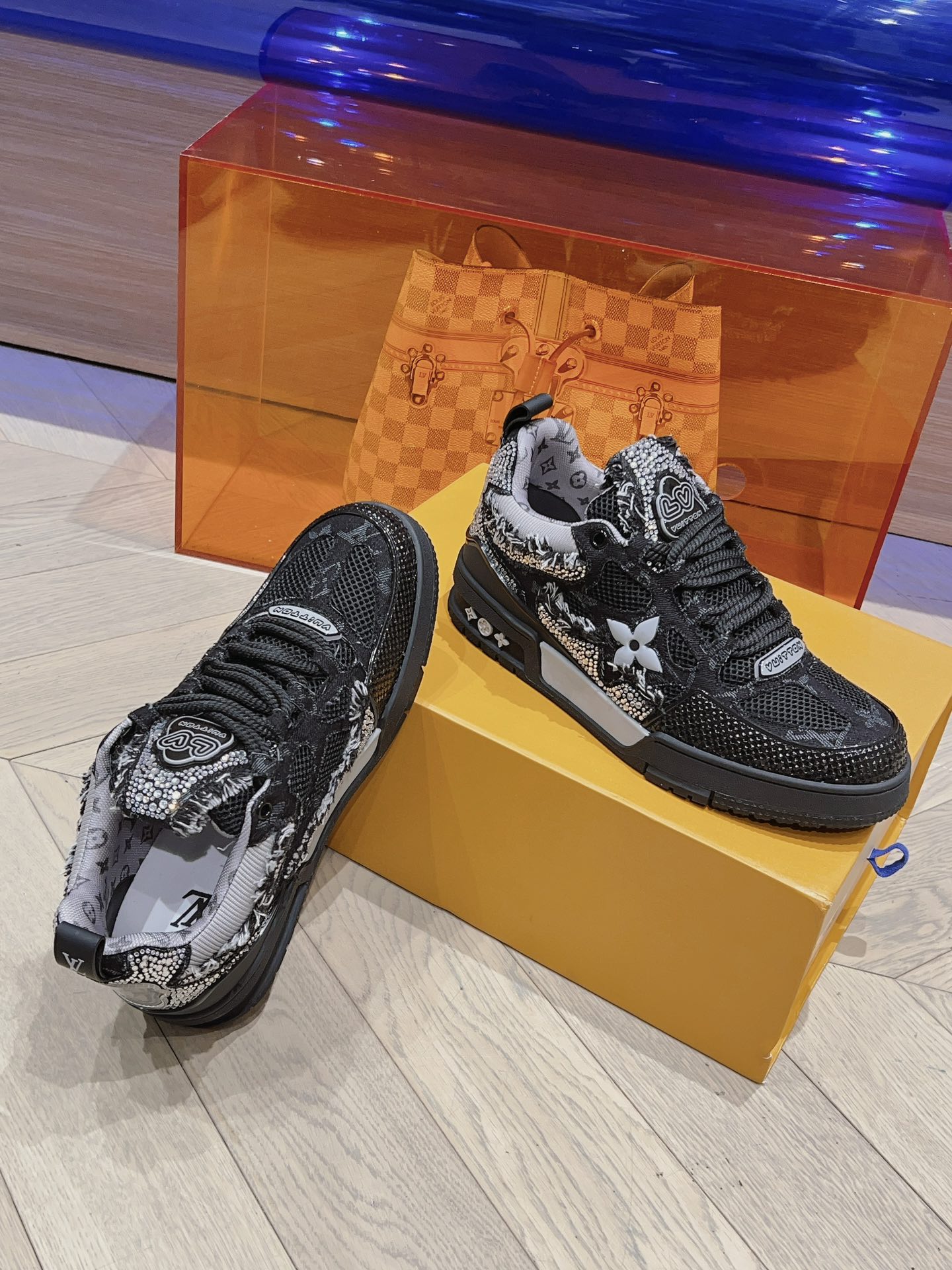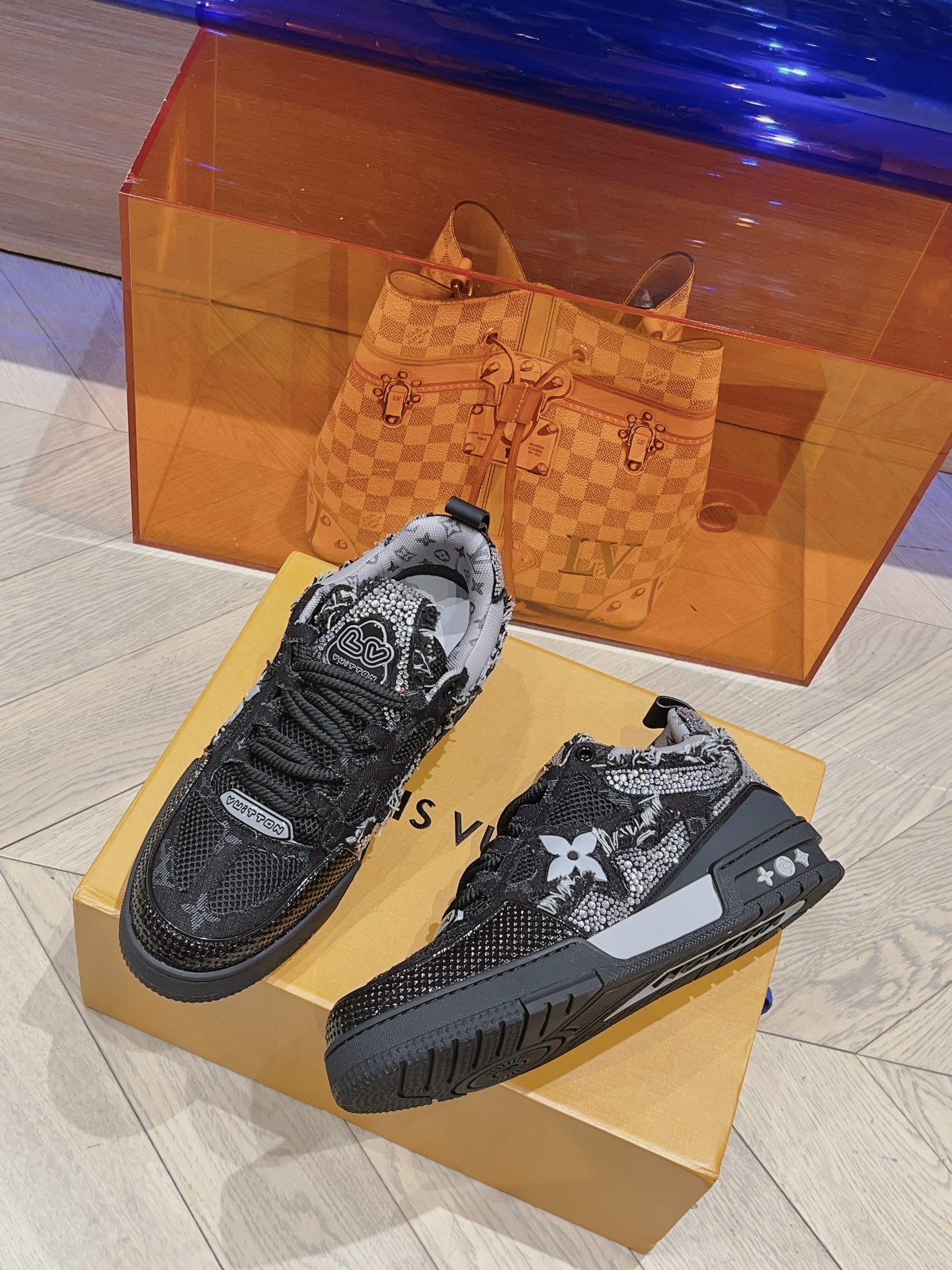 Featured mesh fabric and python texture embossed leather.. Double laces standard with rubber outsole... Tongue and back adorned with LV Since 54 logo... Sides and outsole decorated with Monogram flowers.