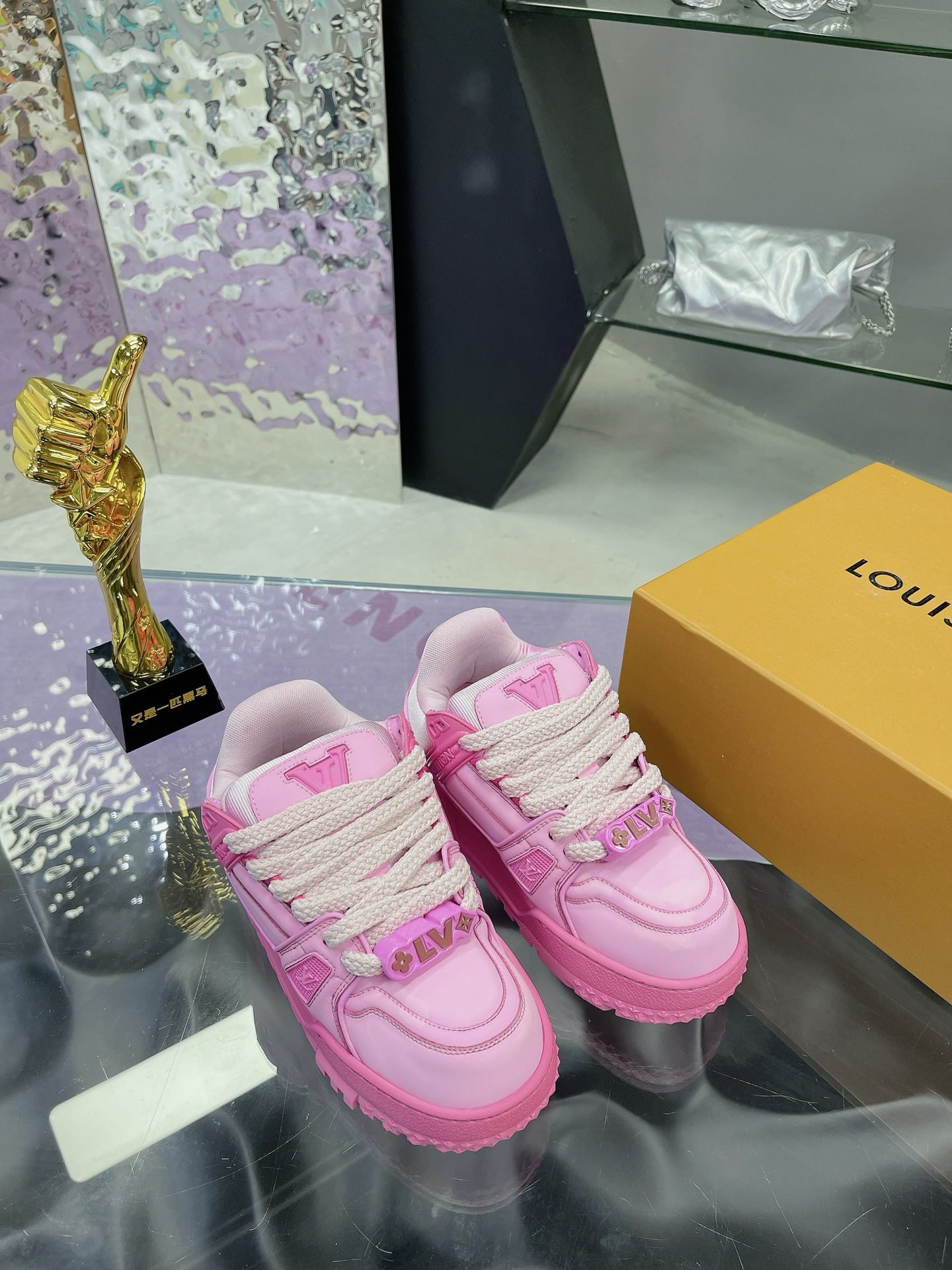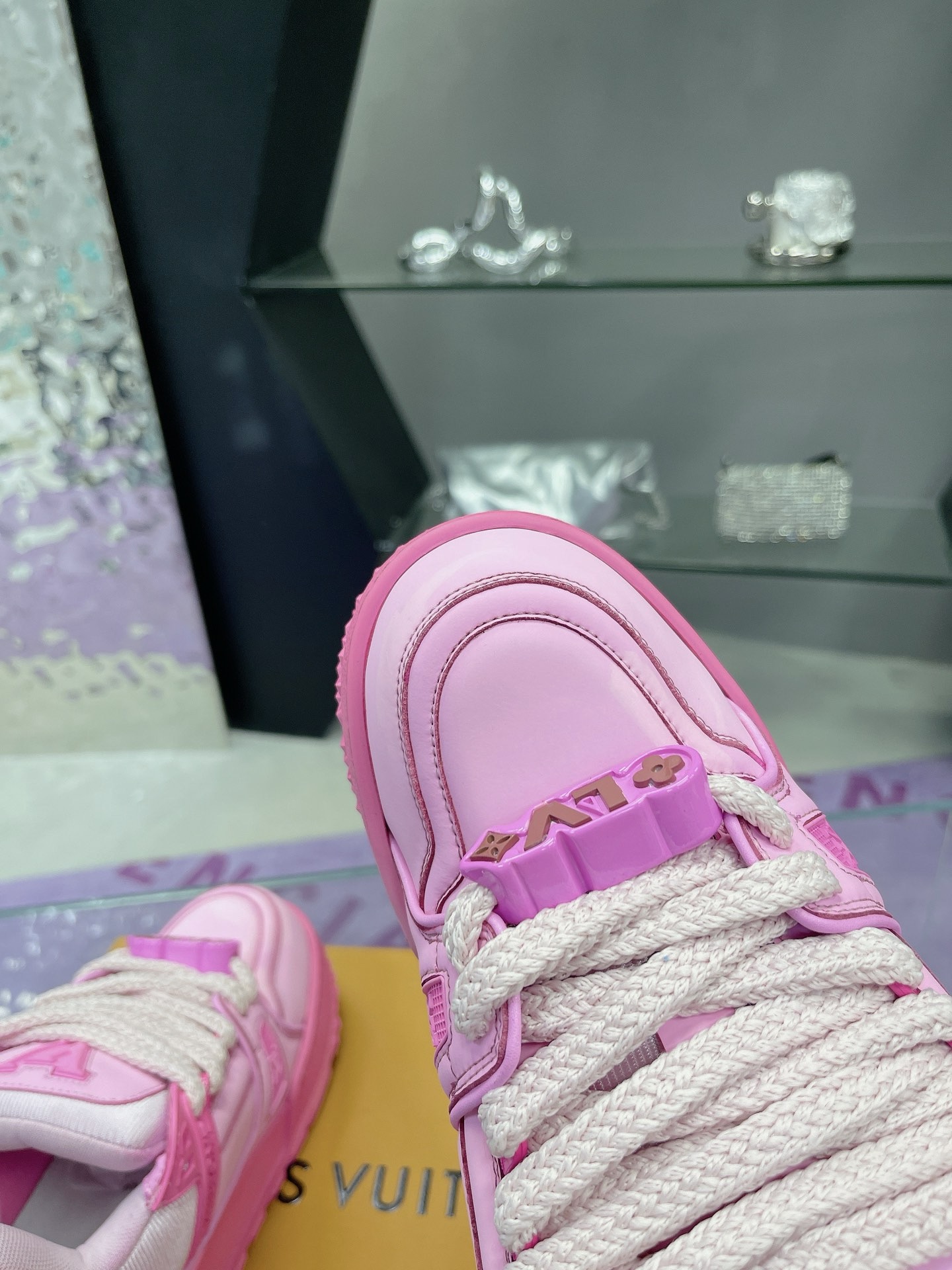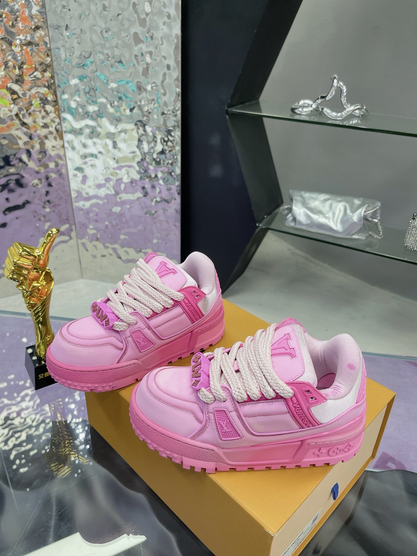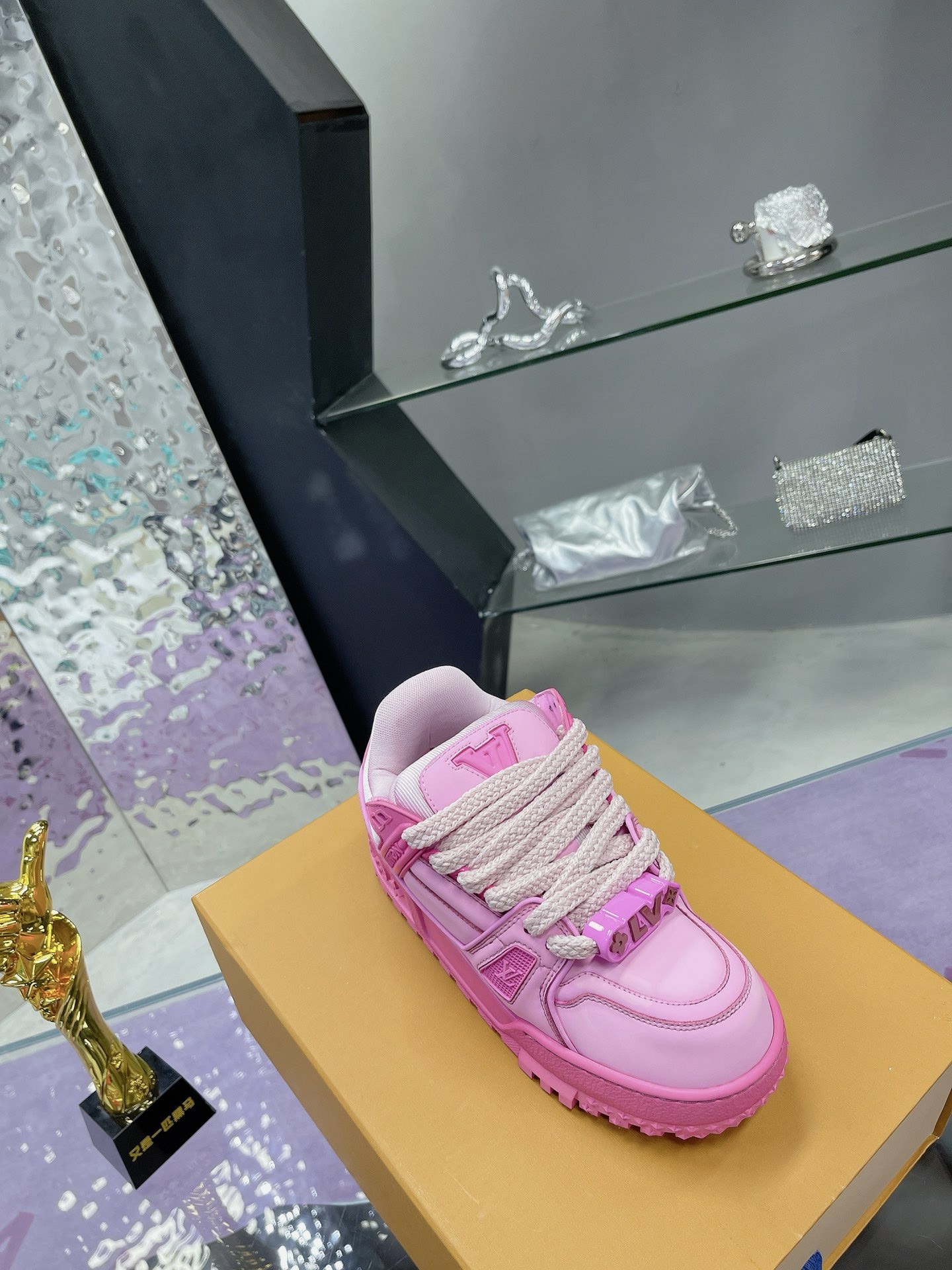 Original version purchased for development and production. This Trainer Maxi is made from soft cowhide leather, reinterpreting the original Trainer design with a large silhouette and textured outsole, drawing inspiration from retro basketball. Rubber lettering on the upper, Monogram flowers on the outsole.