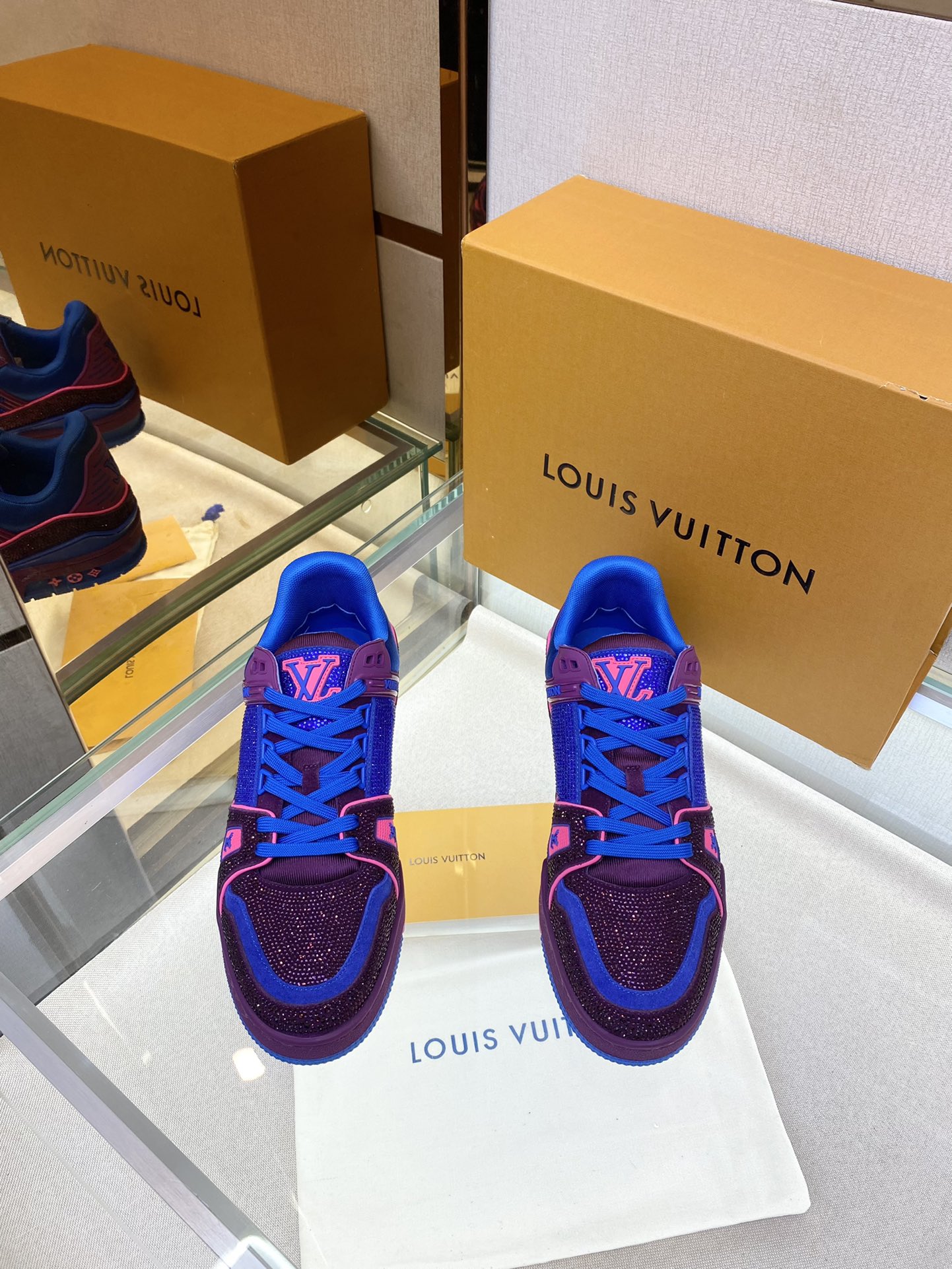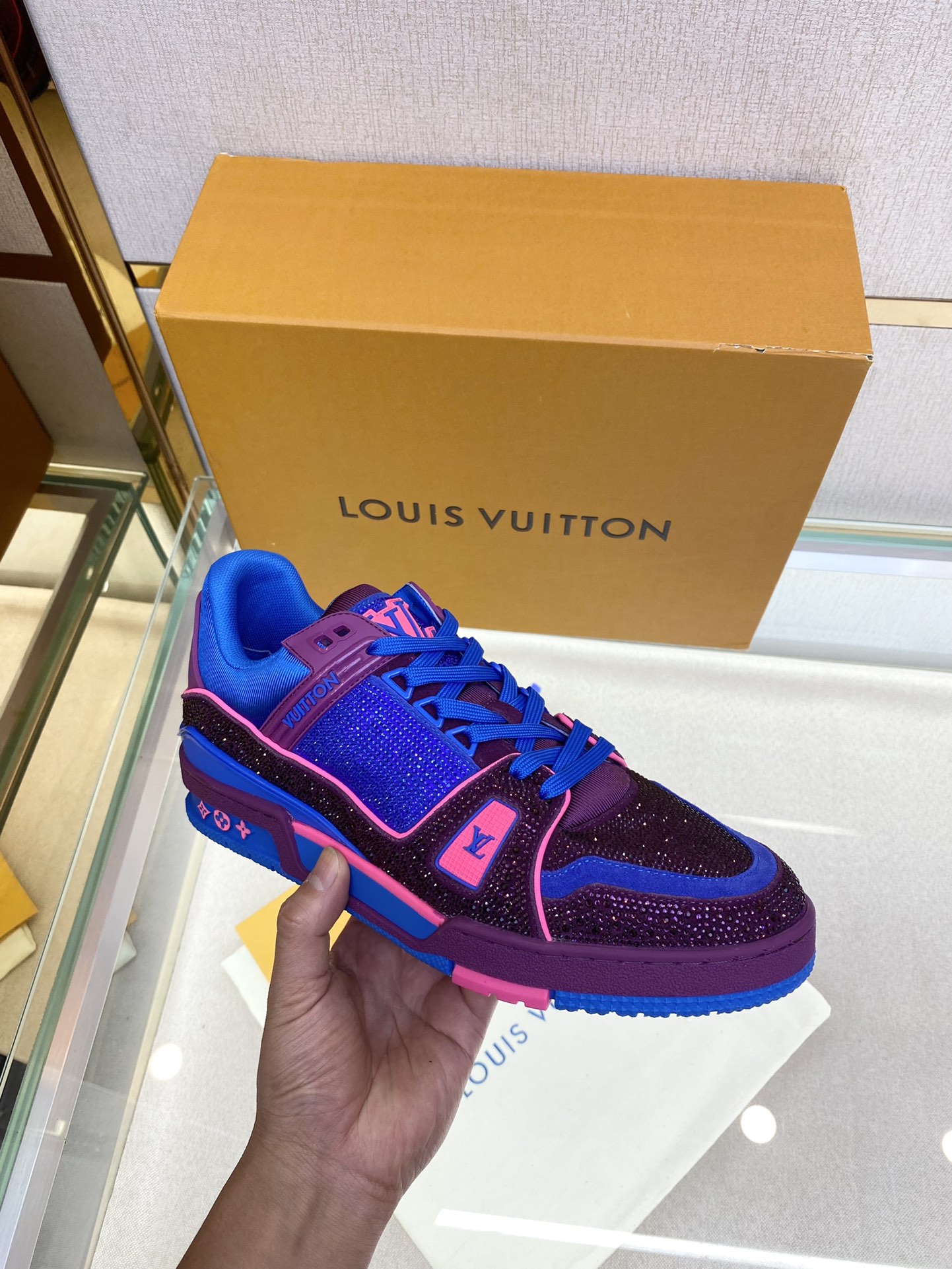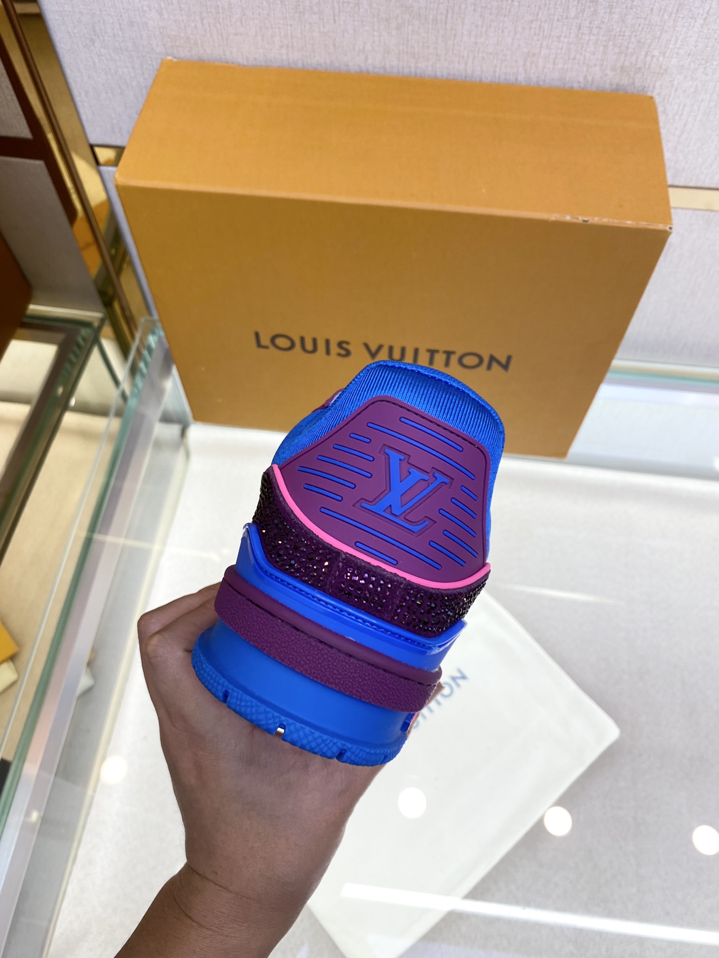The hot-drill series is shipped. L Louis' house 2022🆕 spring and summer new color scheme, men's Trainer sneakers, colored cowhide paired with colored diamonds, tongue drip glue logo decoration, rear LV classic logo decoration, black gradient transparent sole super good-looking. This L• Trainer sneaker appeared at the 2021 spring and summer men's fashion show. Handwritten notes indicate the shoe structure, and clear stitching can be cut by customers to complete the design, showcasing exquisite craftsmanship everywhere. The outsole is decorated with Monogram Flowers pattern. A classic basketball shoe style, with a 100% look-back rate! Size: 39-44