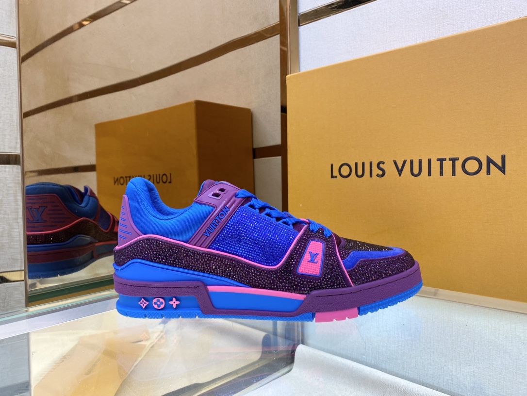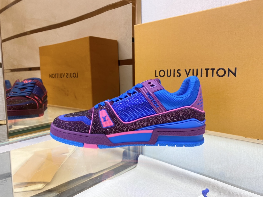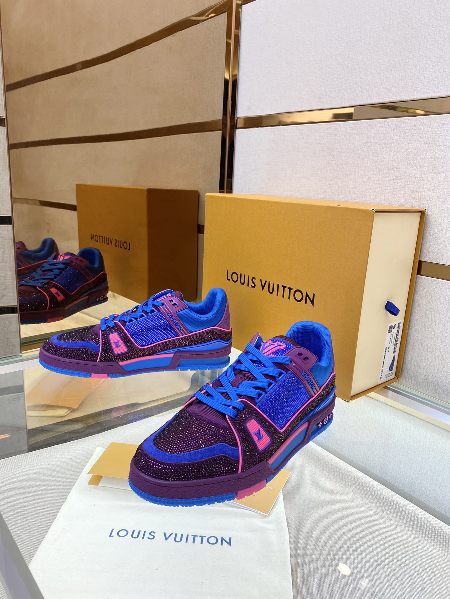The hot-drill series is shipped. L Louis' house 2022🆕 spring and summer new color scheme, men's Trainer sneakers, colored cowhide paired with colored diamonds, tongue drip glue logo decoration, rear LV classic logo decoration, black gradient transparent sole super good-looking. This L• Trainer sneaker appeared at the 2021 spring and summer men's fashion show. Handwritten notes indicate the shoe structure, and clear stitching can be cut by customers to complete the design, showcasing exquisite craftsmanship everywhere. The outsole is decorated with Monogram Flowers pattern. A classic basketball shoe style, with a 100% look-back rate! Size: 39-44