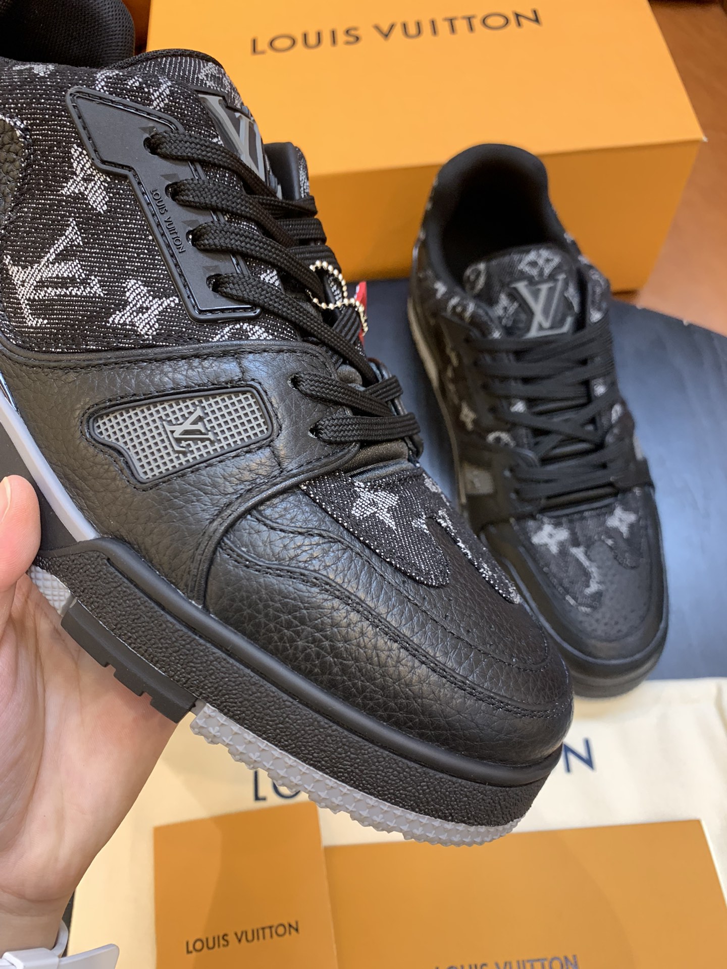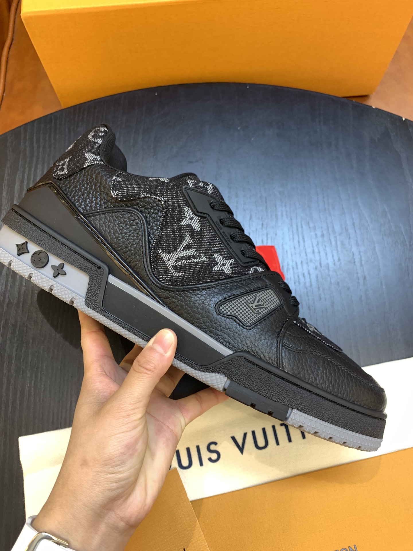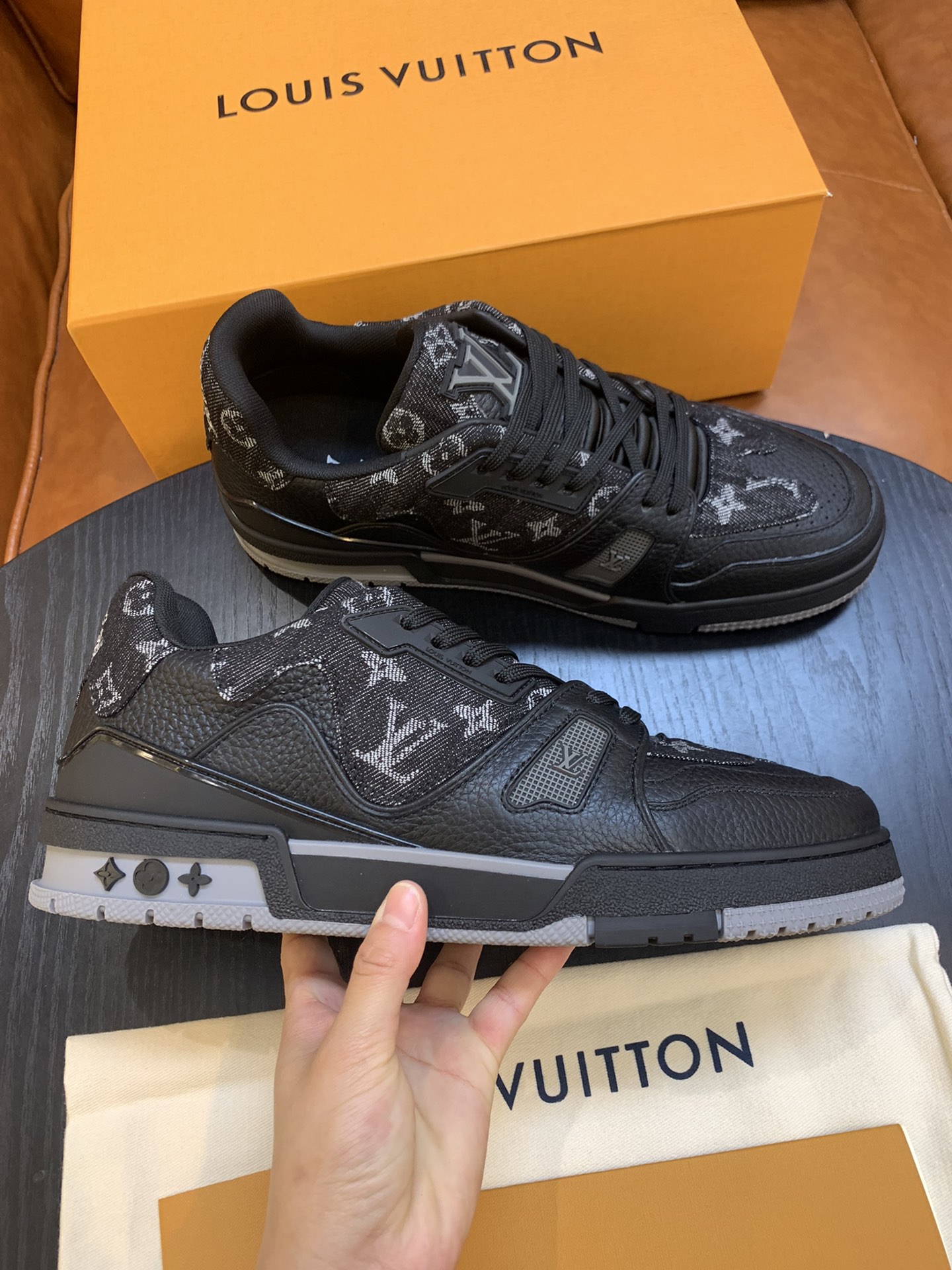 LouisVuitton 2021 Men's Trainer Sneakers, made of grained calfskin and denim material, with a technological rubber outsole and innovative gel insole for superior comfort. The outsole is decorated with Monogram Flowers pattern.