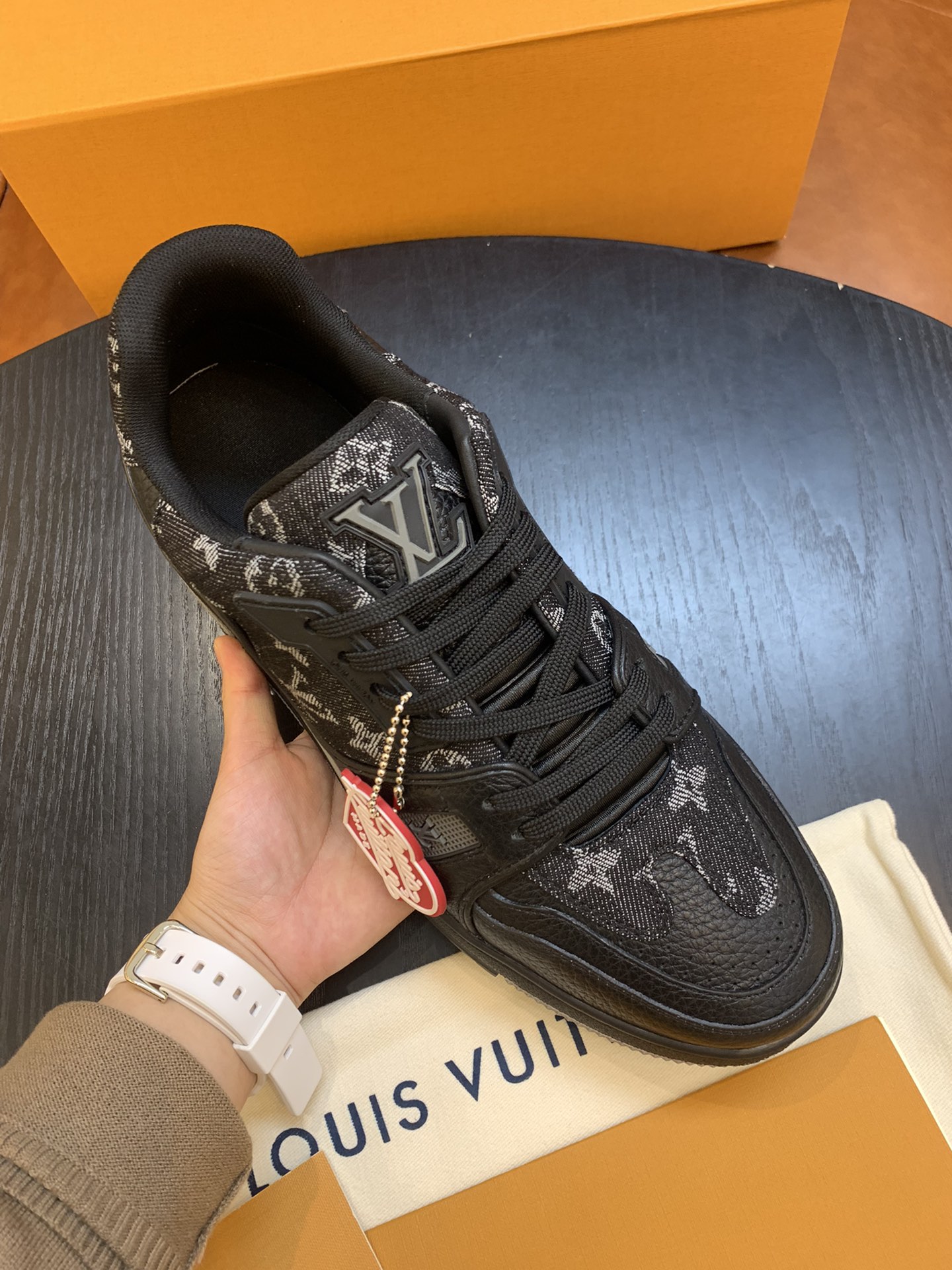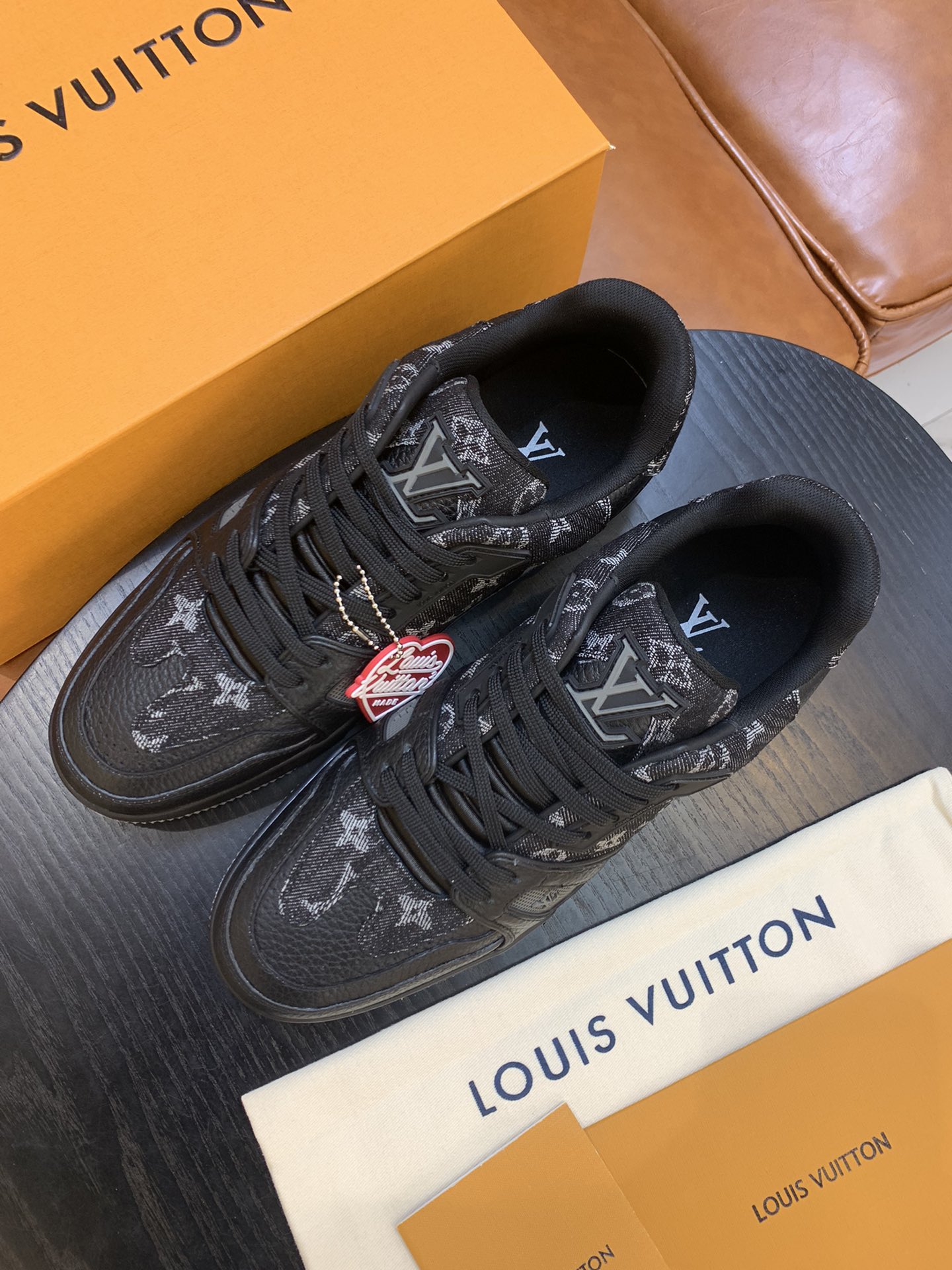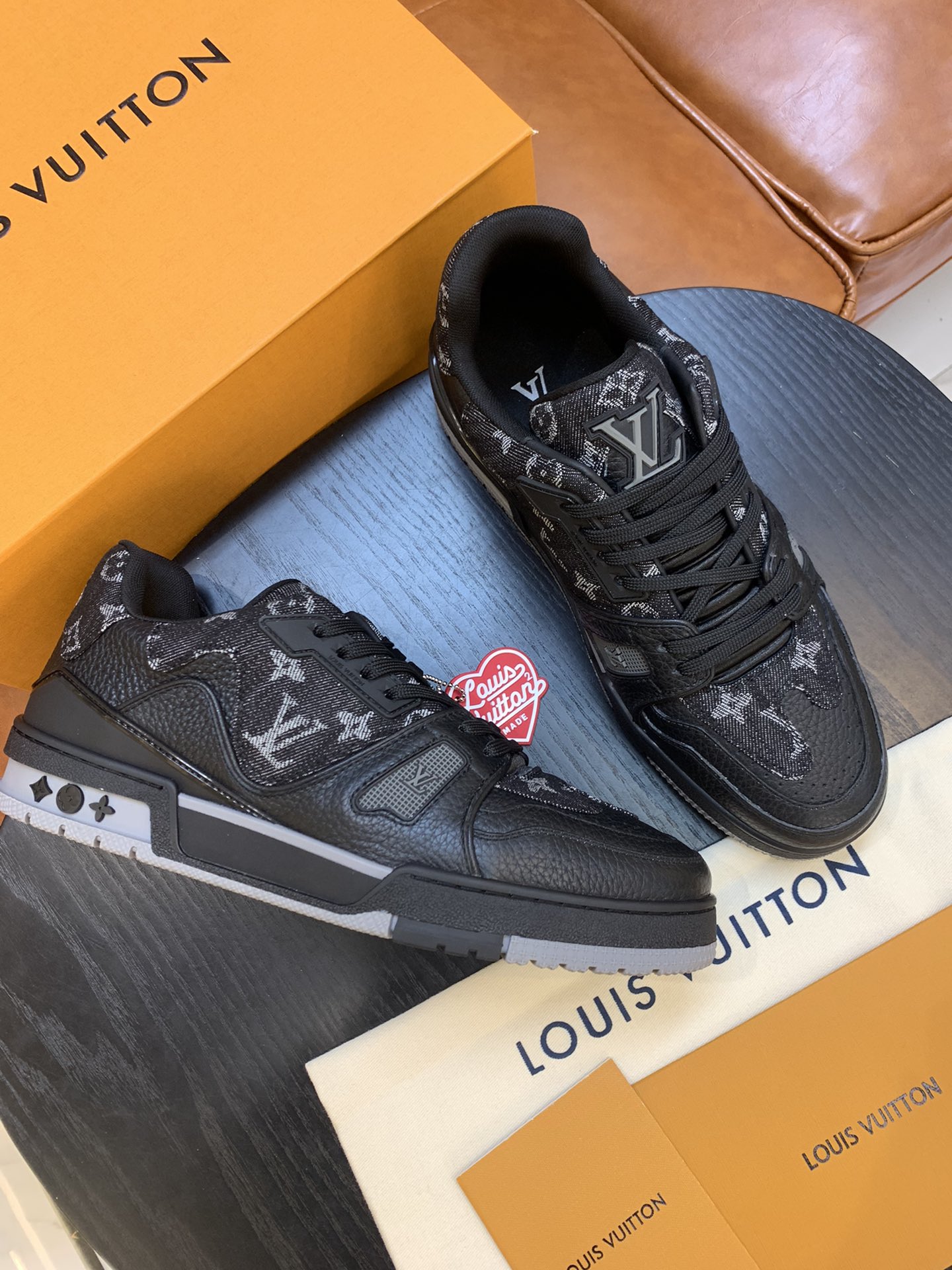 LouisVuitton 2021 Men's Trainer Sneakers, made of grained calfskin and denim material, with a technological rubber outsole and innovative gel insole for superior comfort. The outsole is decorated with Monogram Flowers pattern.