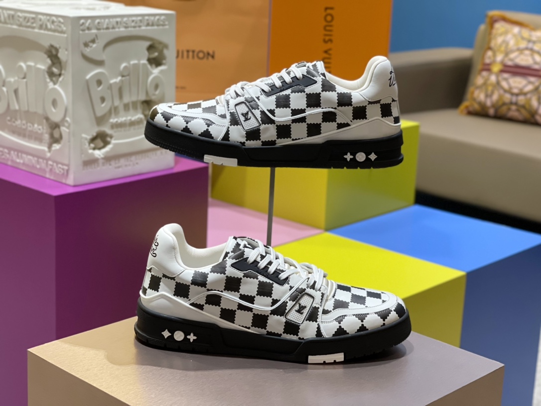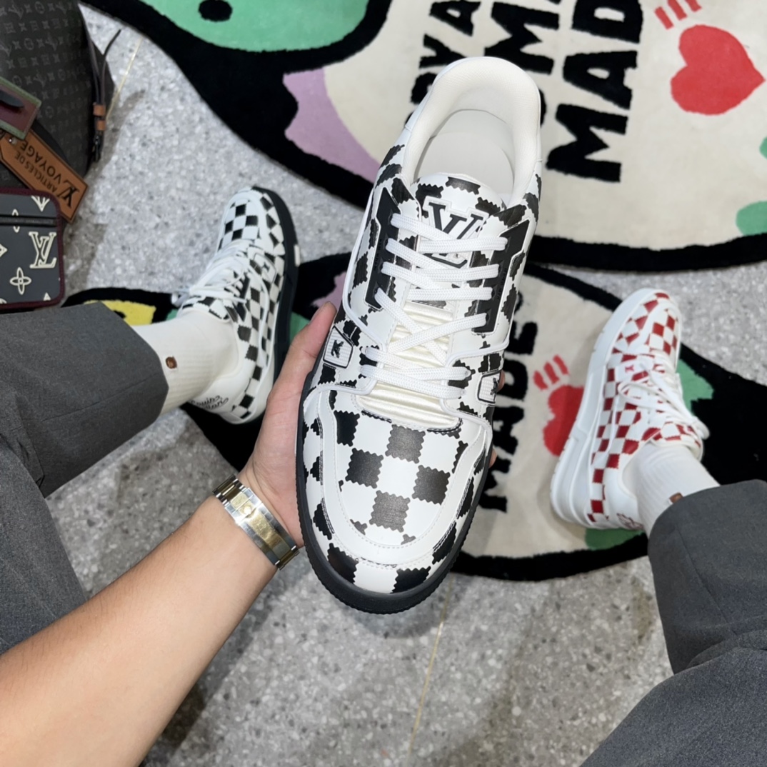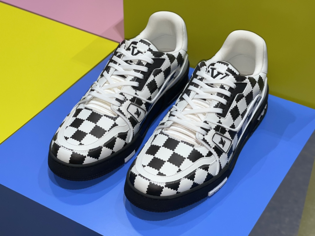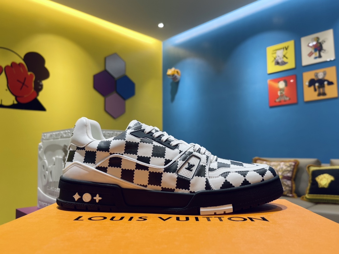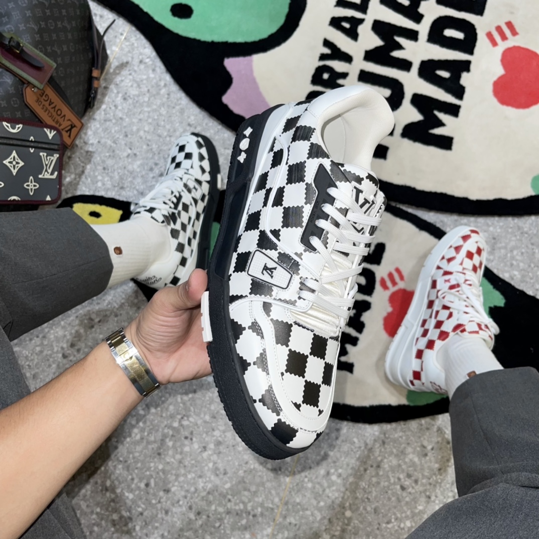 TRAINER SNEAKER sports shoes, crafted from calfskin patchwork, featuring NIGO black grid print, adorned with black LV Initials logo and Louis Vuitton handwritten logo, tongue decorated with LV letters, outsole with Monogram floral pattern, black and white sole.
