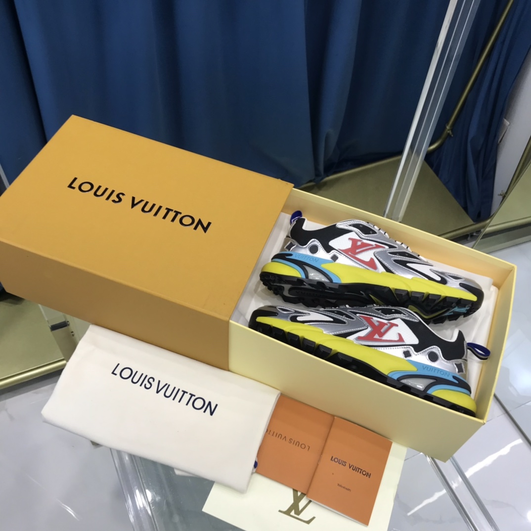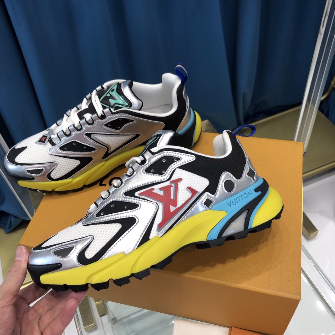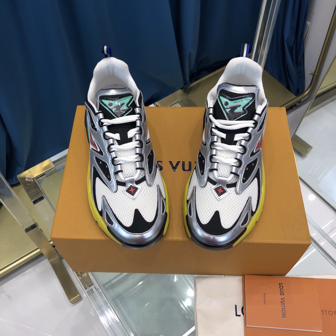 New 2022 Spring/Summer runway launch LV Runner Tactic sneakers: Mesh fabric mixed with metallic textured calfskin, interpreting the design essence of running shoes; LV initials and Monogram flowers adorn the sides, with padded collars and technical lining for added comfort, lightweight rubber outsole completes the whole. Sizes 38-46