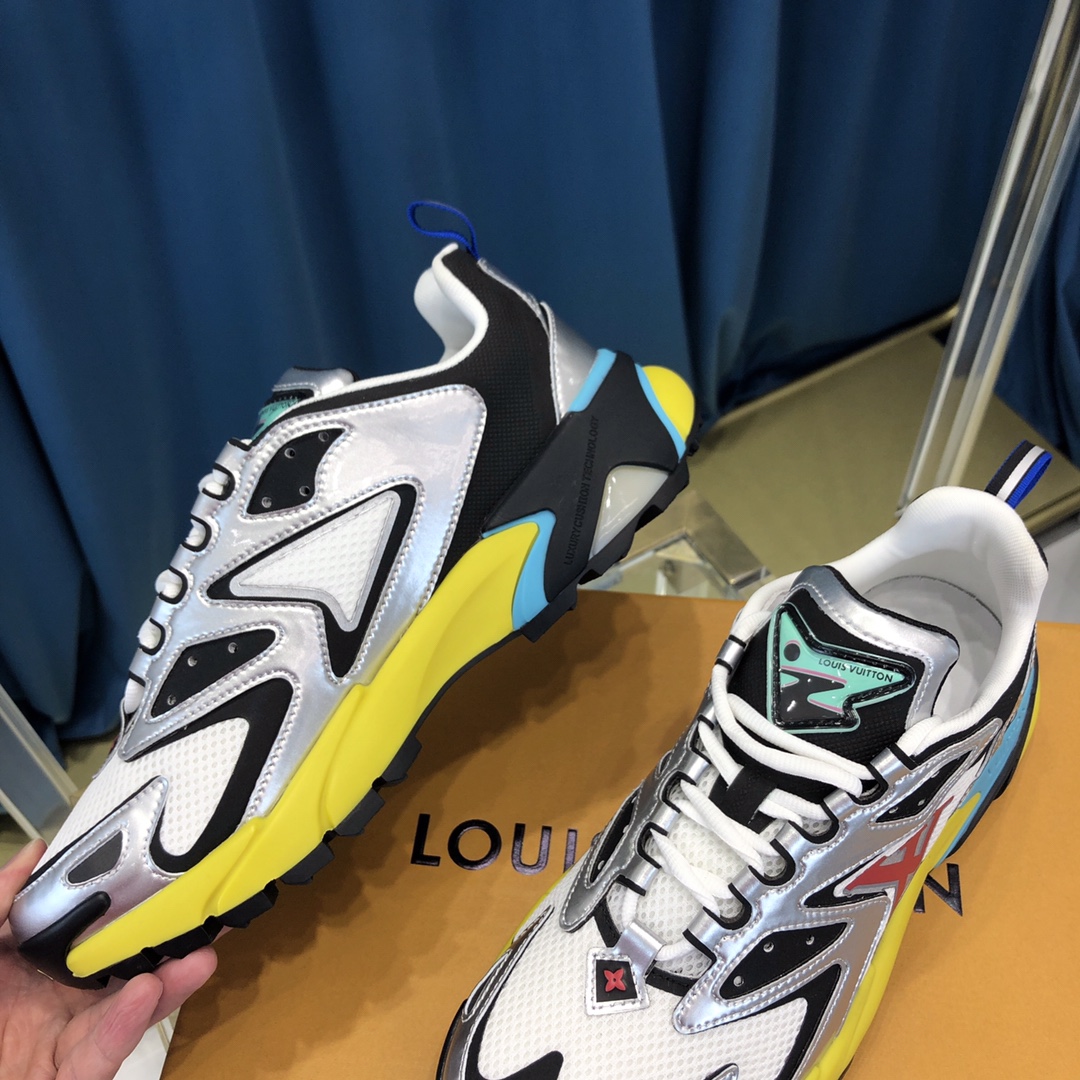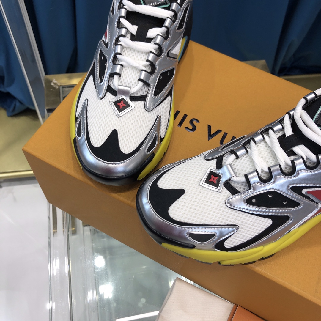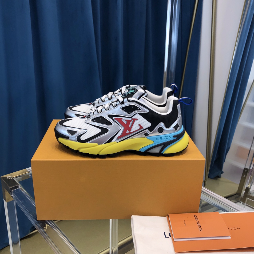 New 2022 Spring/Summer runway launch LV Runner Tactic sneakers: Mesh fabric mixed with metallic textured calfskin, interpreting the design essence of running shoes; LV initials and Monogram flowers adorn the sides, with padded collars and technical lining for added comfort, lightweight rubber outsole completes the whole. Sizes 38-46