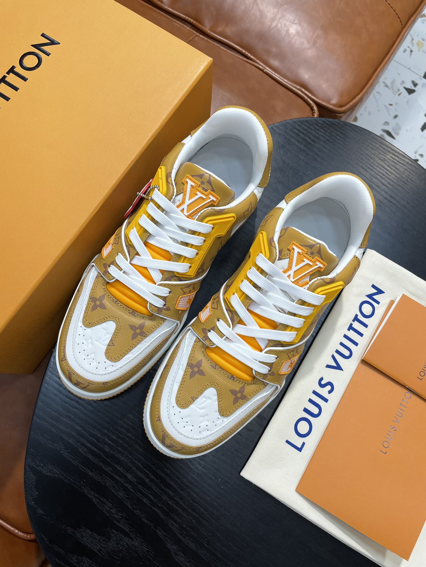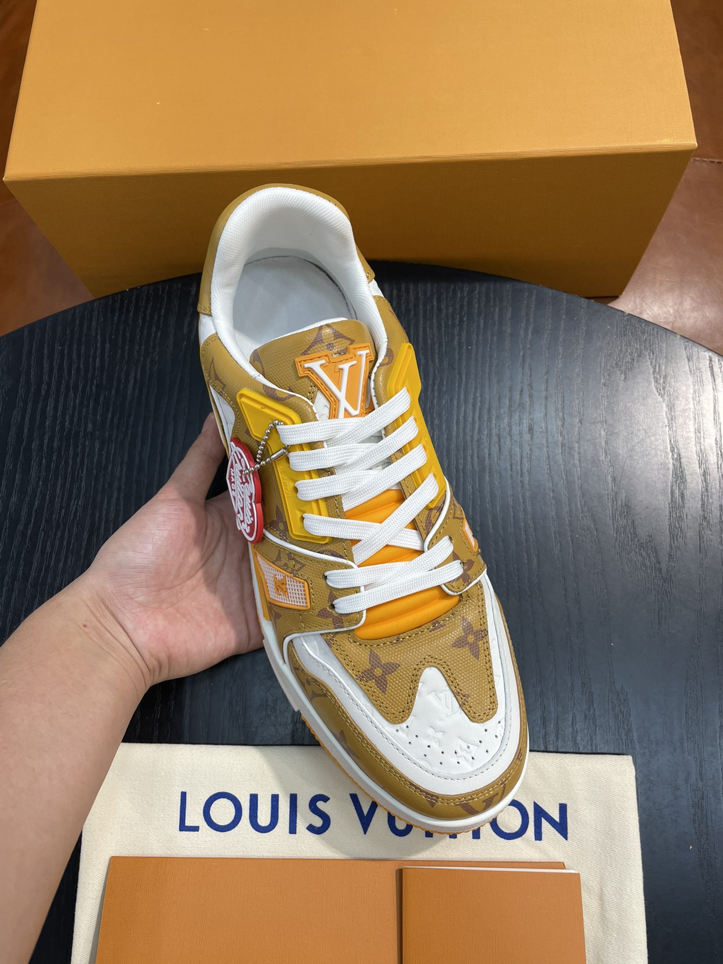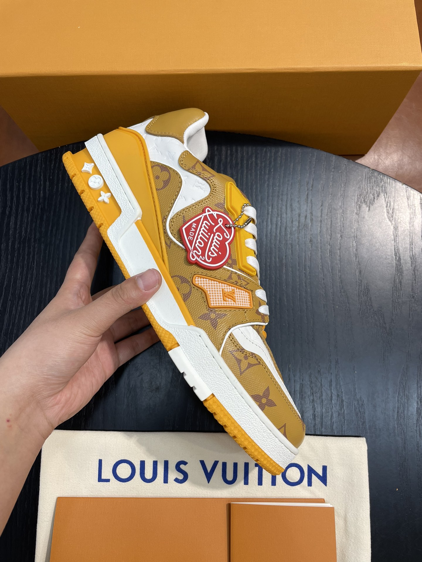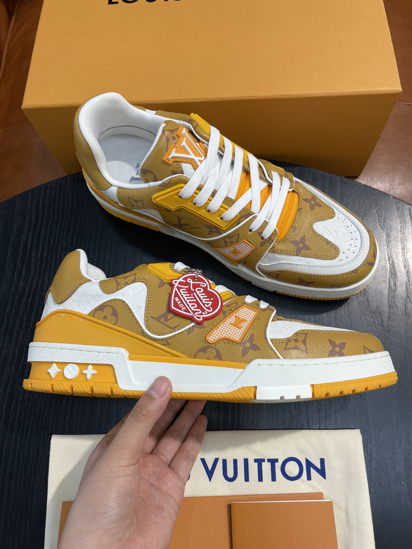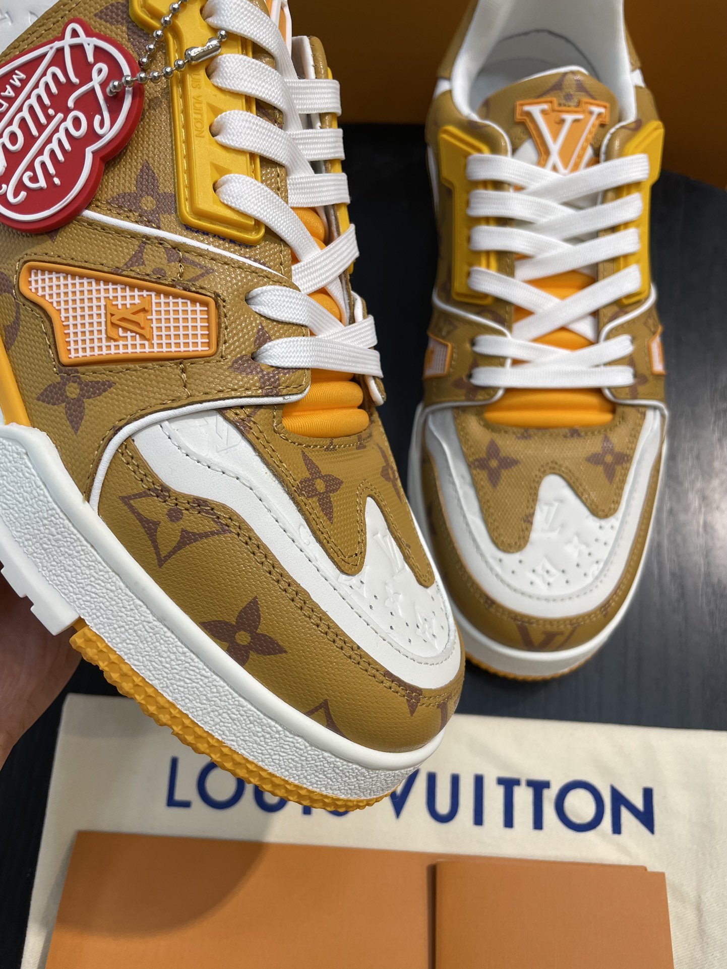 Men's Artistic Director Virgil Abloh drew inspiration from retro basketball shoes to launch the LV Trainer sneakers. This version uses Monogram canvas and calfskin to create the iconic design. The #54 rubber mark on the back indicates the year 1854 when the Louis Vuitton brand was born. Features a rubber outsole, LV letters on the tongue and sides, #54 logo on the back, and Monogram flowers on the outsole. Sizes 38-44 (45 custom-made).