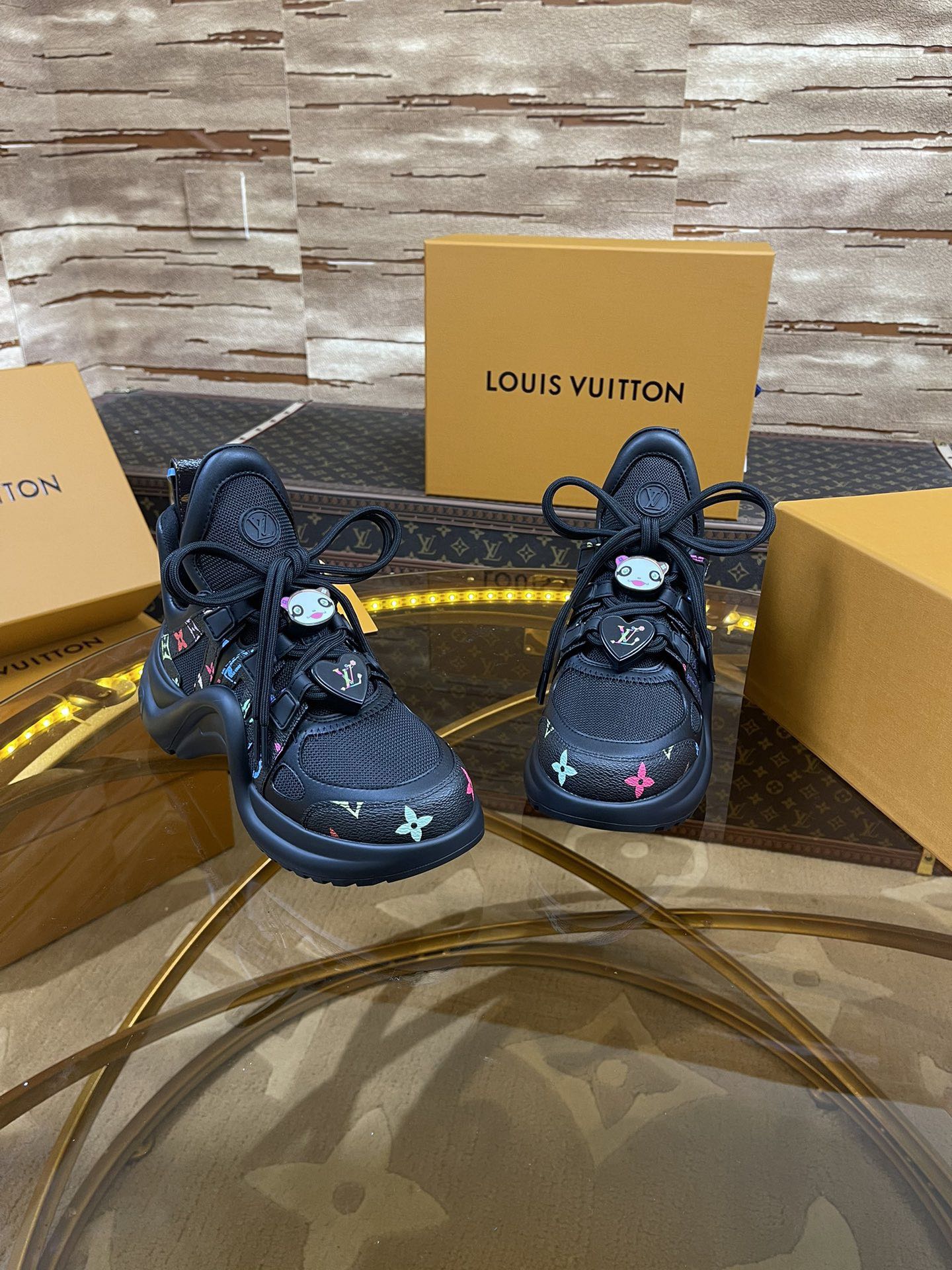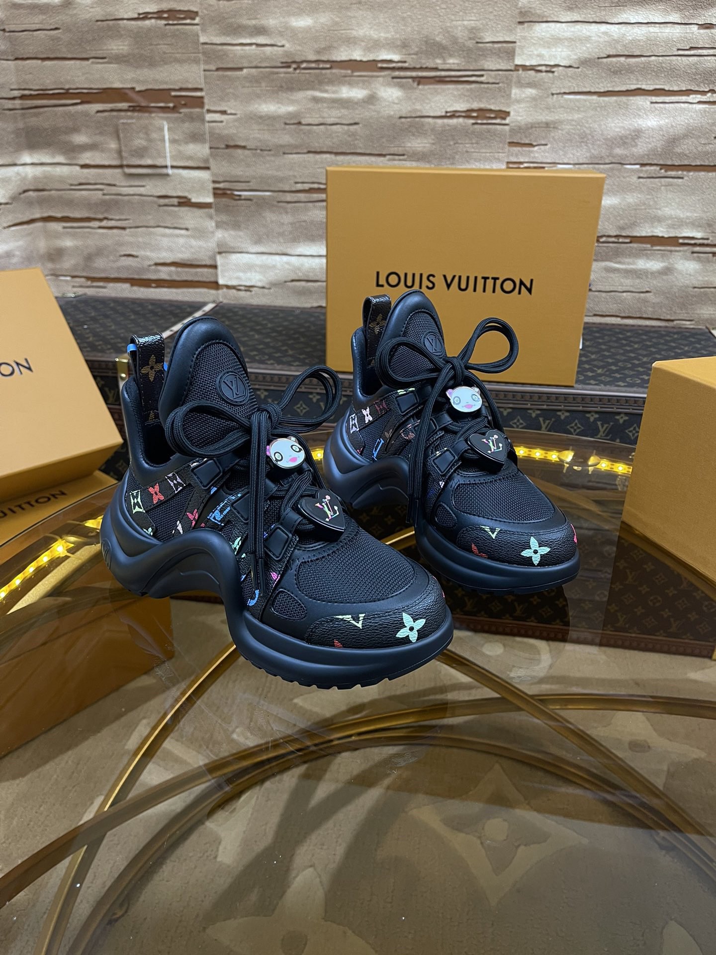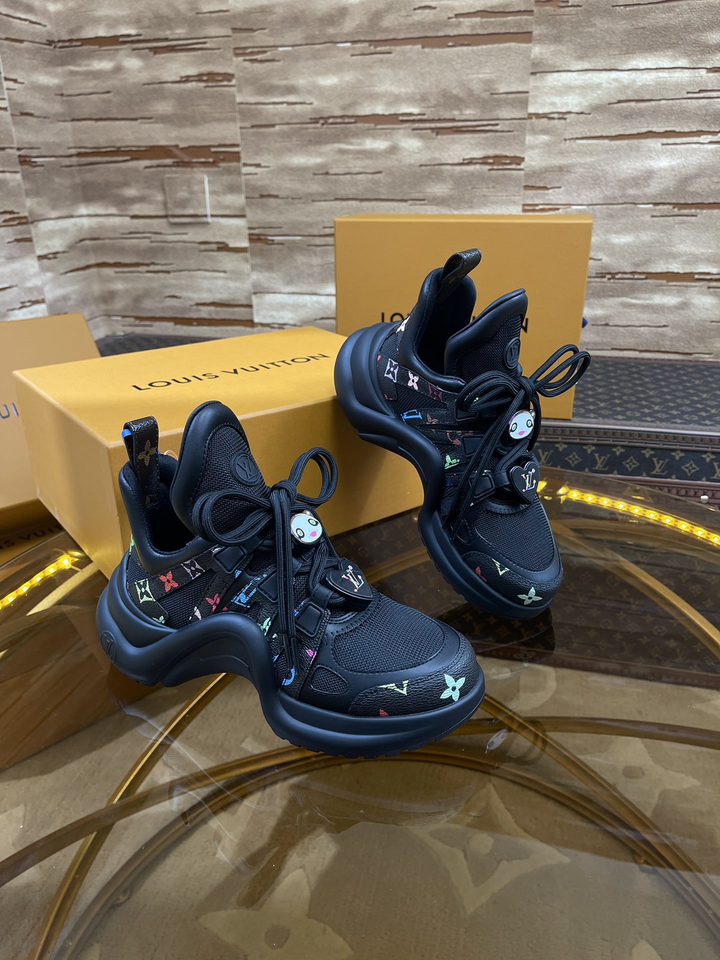 LV arc Top Version 2025 New Murakami Collaboration Black and White Multicolor LV Fancy Panda Buckle Style Archlight Donkey Brand Hardware Casual Sports Dad Shoes Rear Added Heel Height Approximately 5.5cm, Sole Maximum Thickness Approximately 8mm