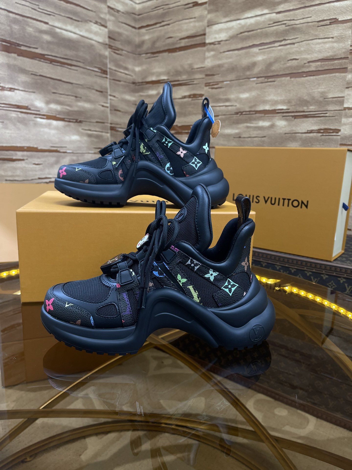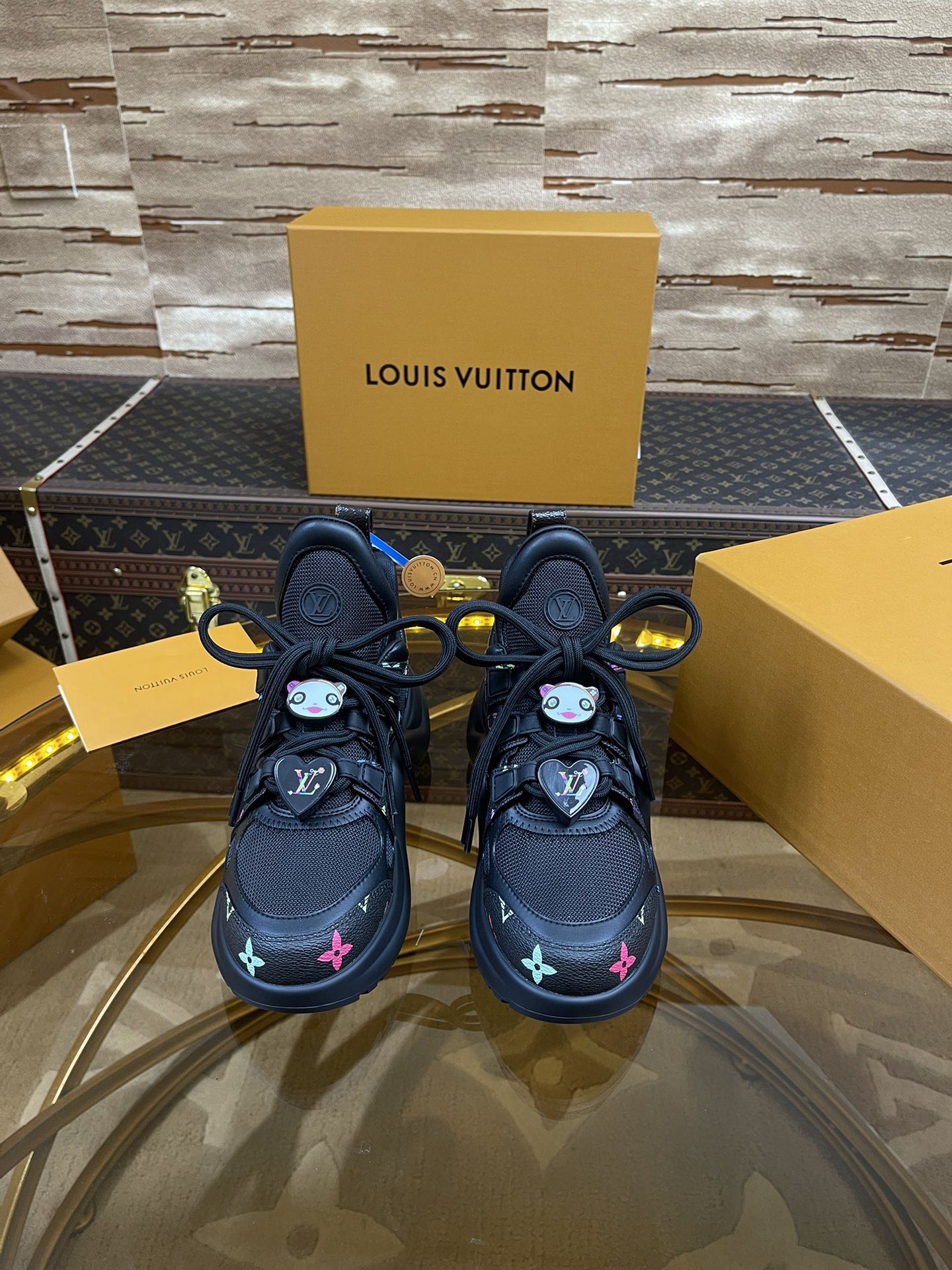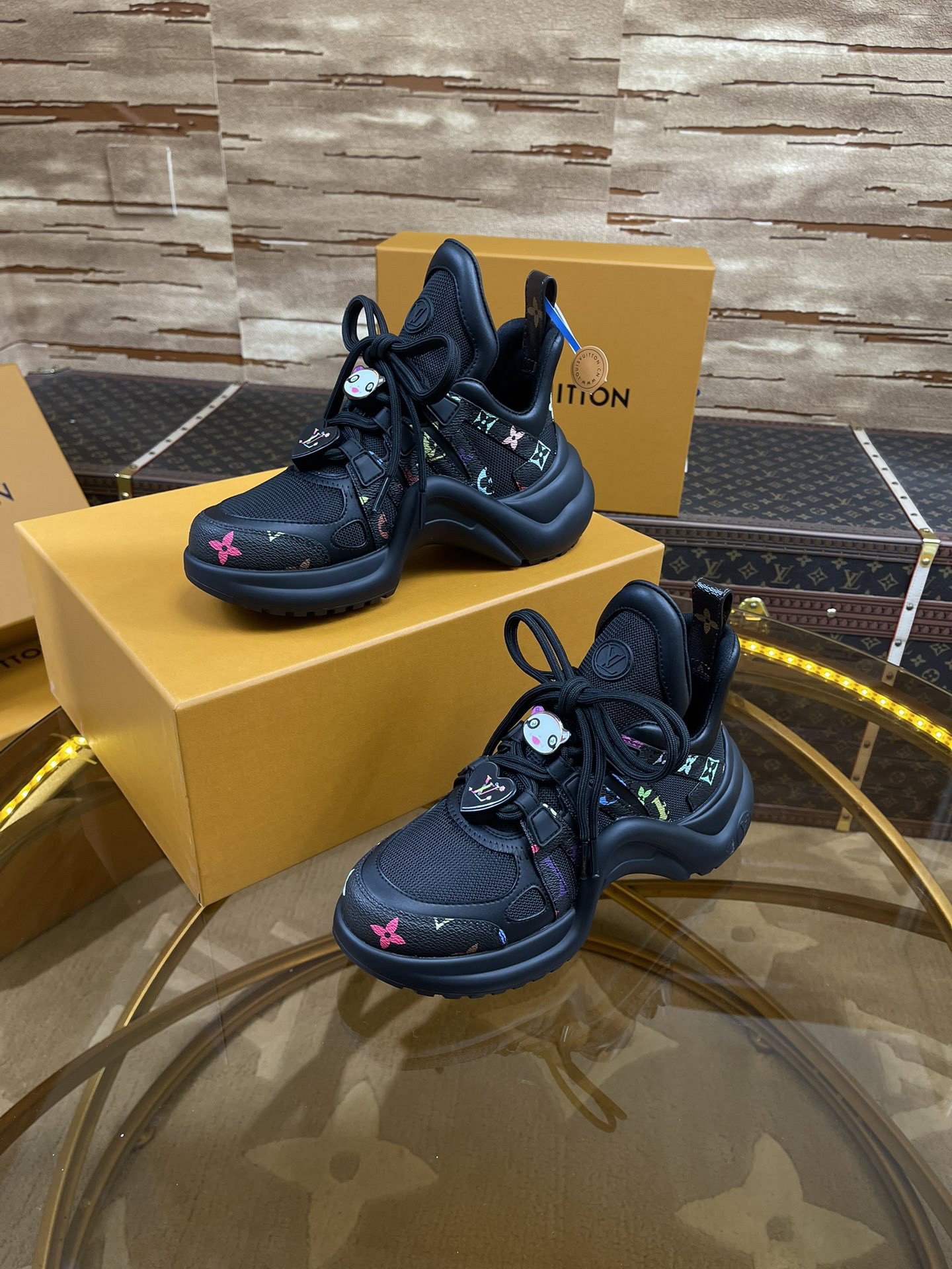 LV arc Top Version 2025 New Murakami Collaboration Black and White Multicolor LV Fancy Panda Buckle Style Archlight Donkey Brand Hardware Casual Sports Dad Shoes Rear Added Heel Height Approximately 5.5cm, Sole Maximum Thickness Approximately 8mm