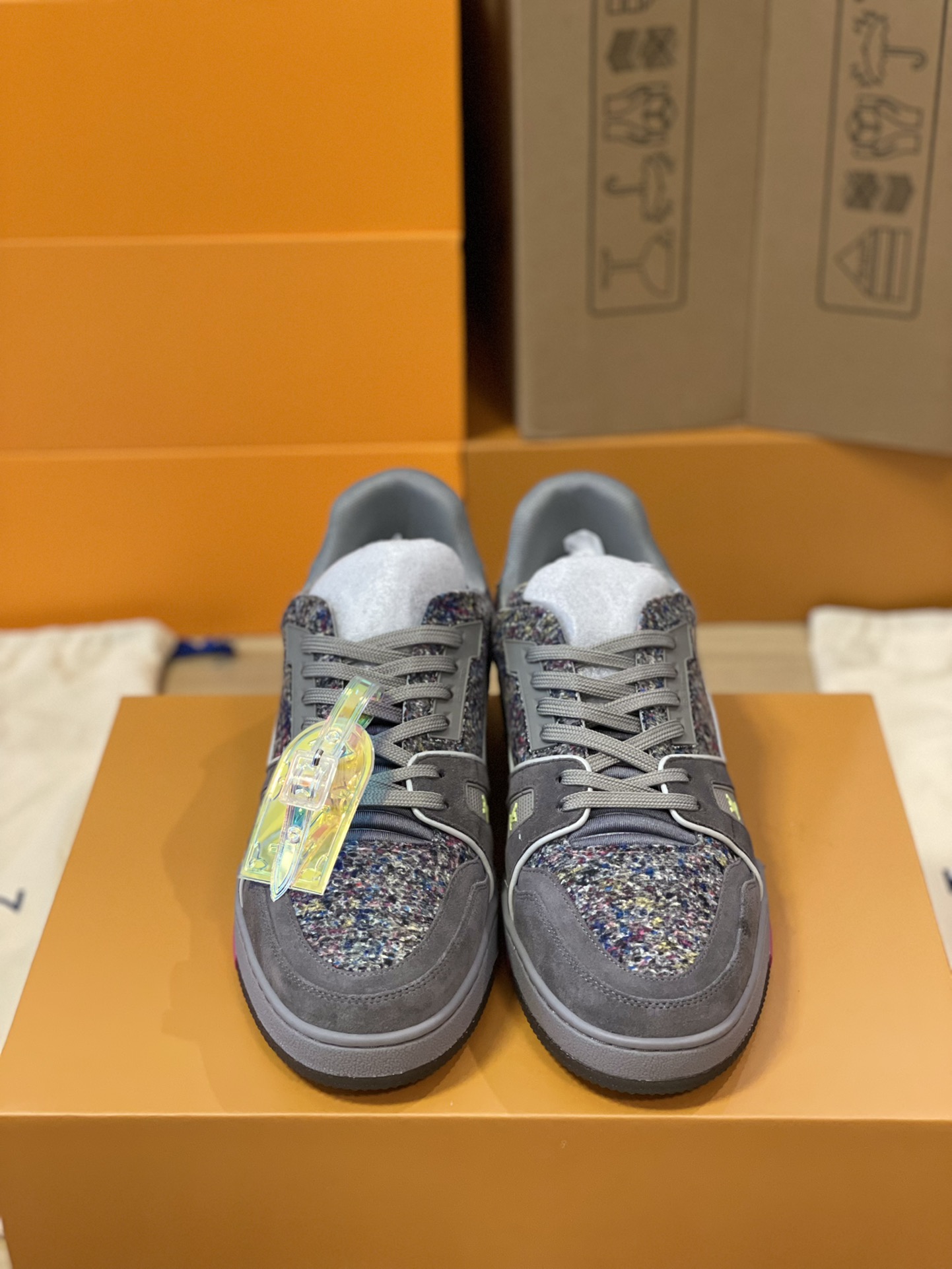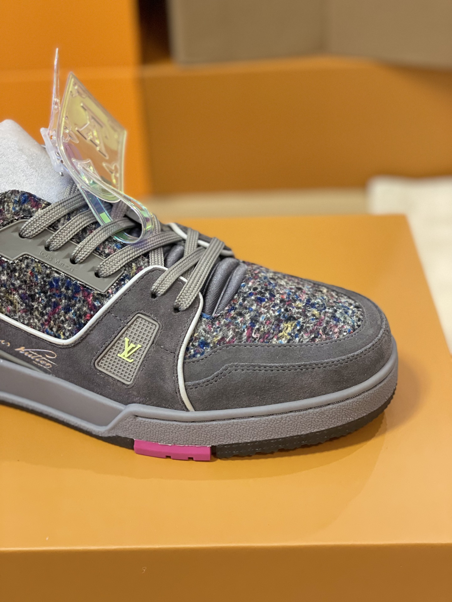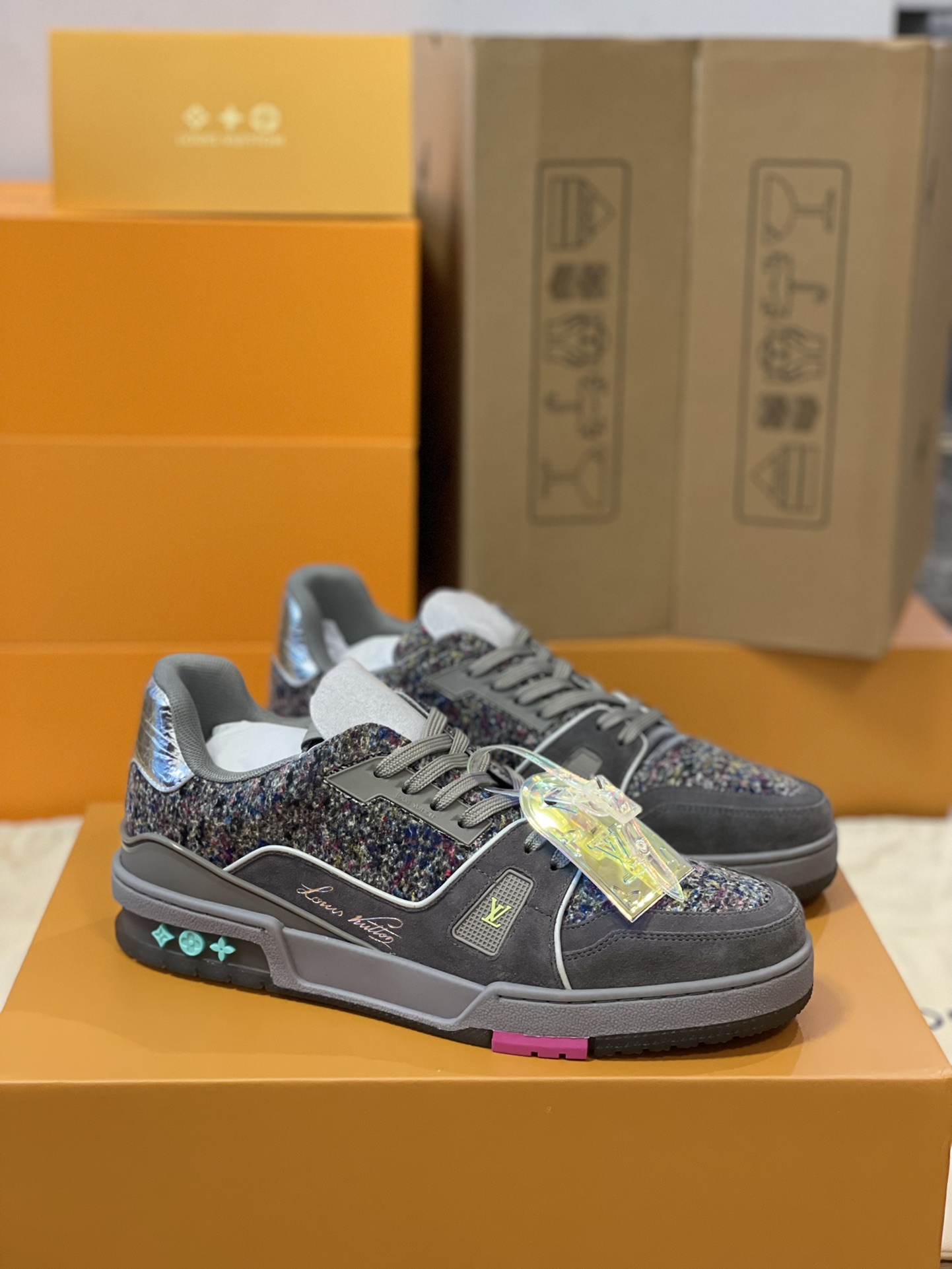 Louis Vuitton 2021-2022 Autumn/Winter couple collection showcase. Model number 1A998B, further evolution of the LV Trainer sneaker. Calfskin suede highlights the new season's material concept, rubber elements inject bright colors, and metallic leather trims adorn the back.
