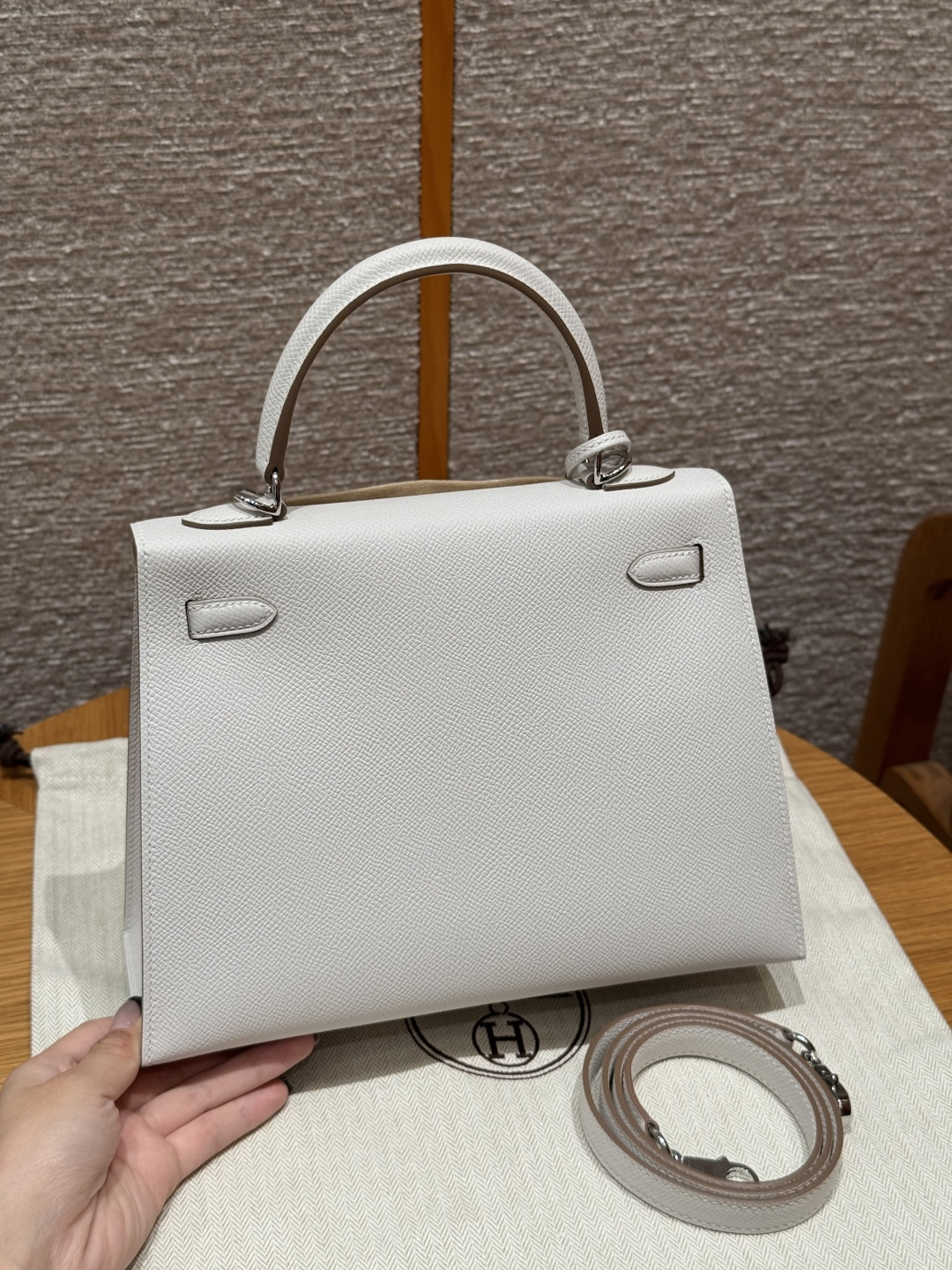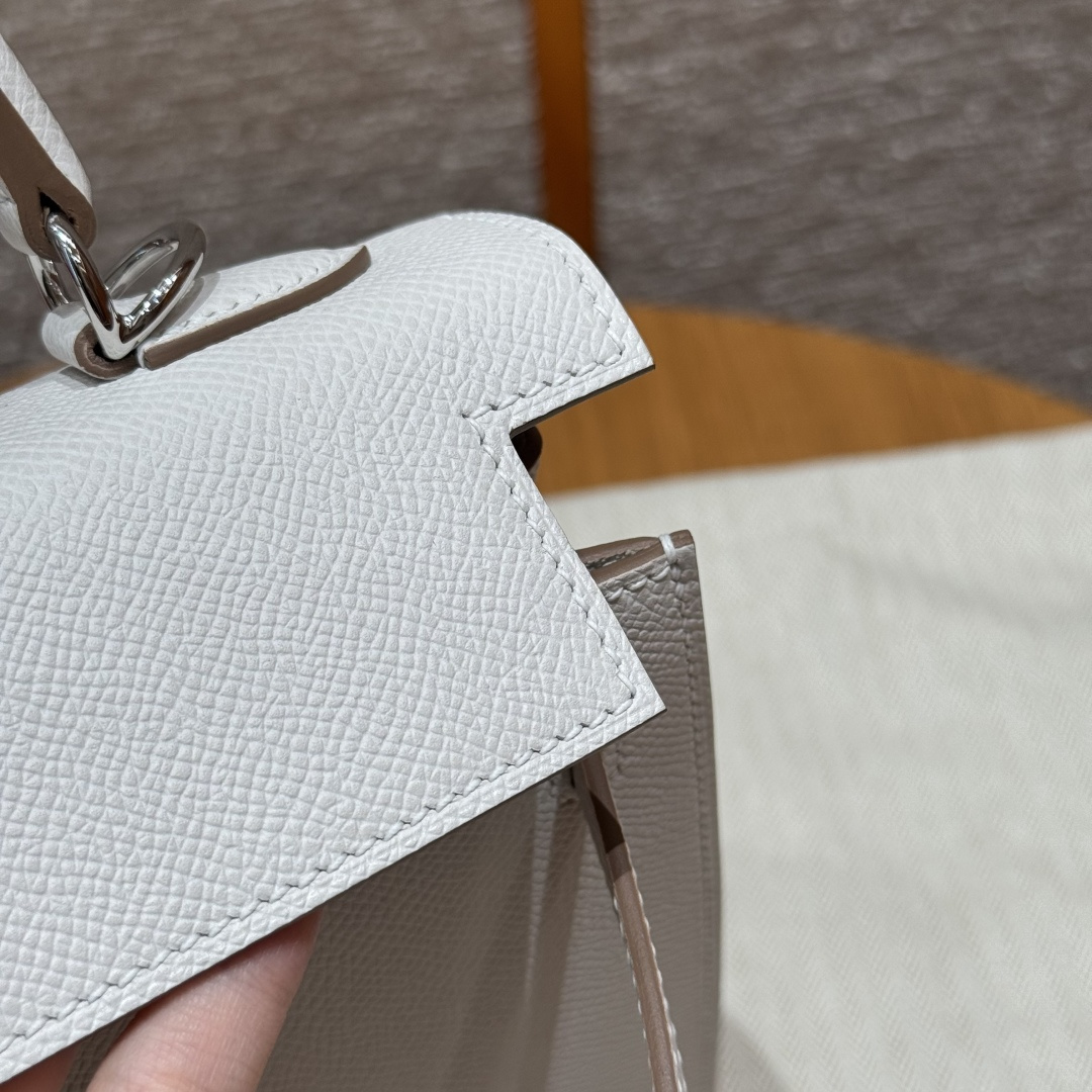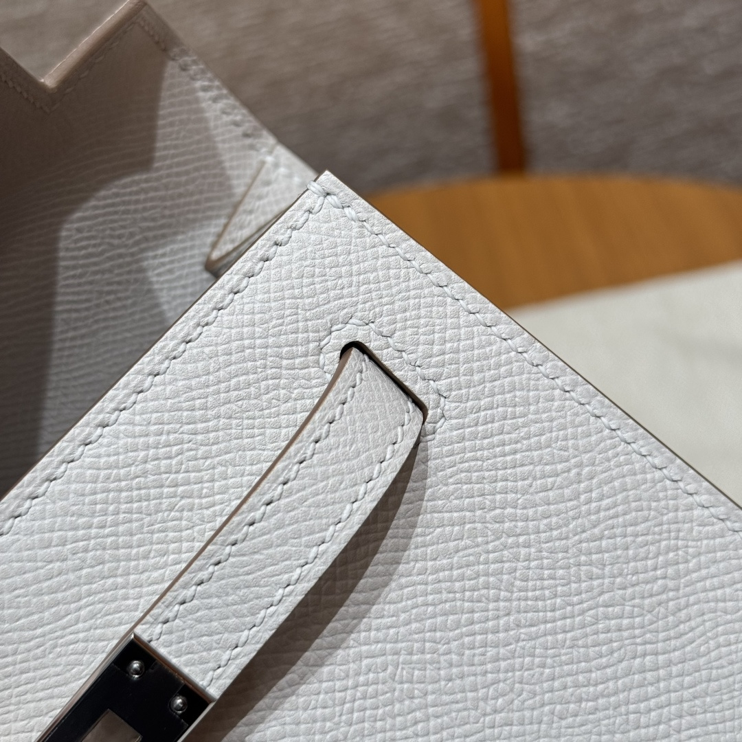 Kelly 25, milky grey, French imported vealer calfskin, silver buckle, advanced fully handcrafted exclusive customization.