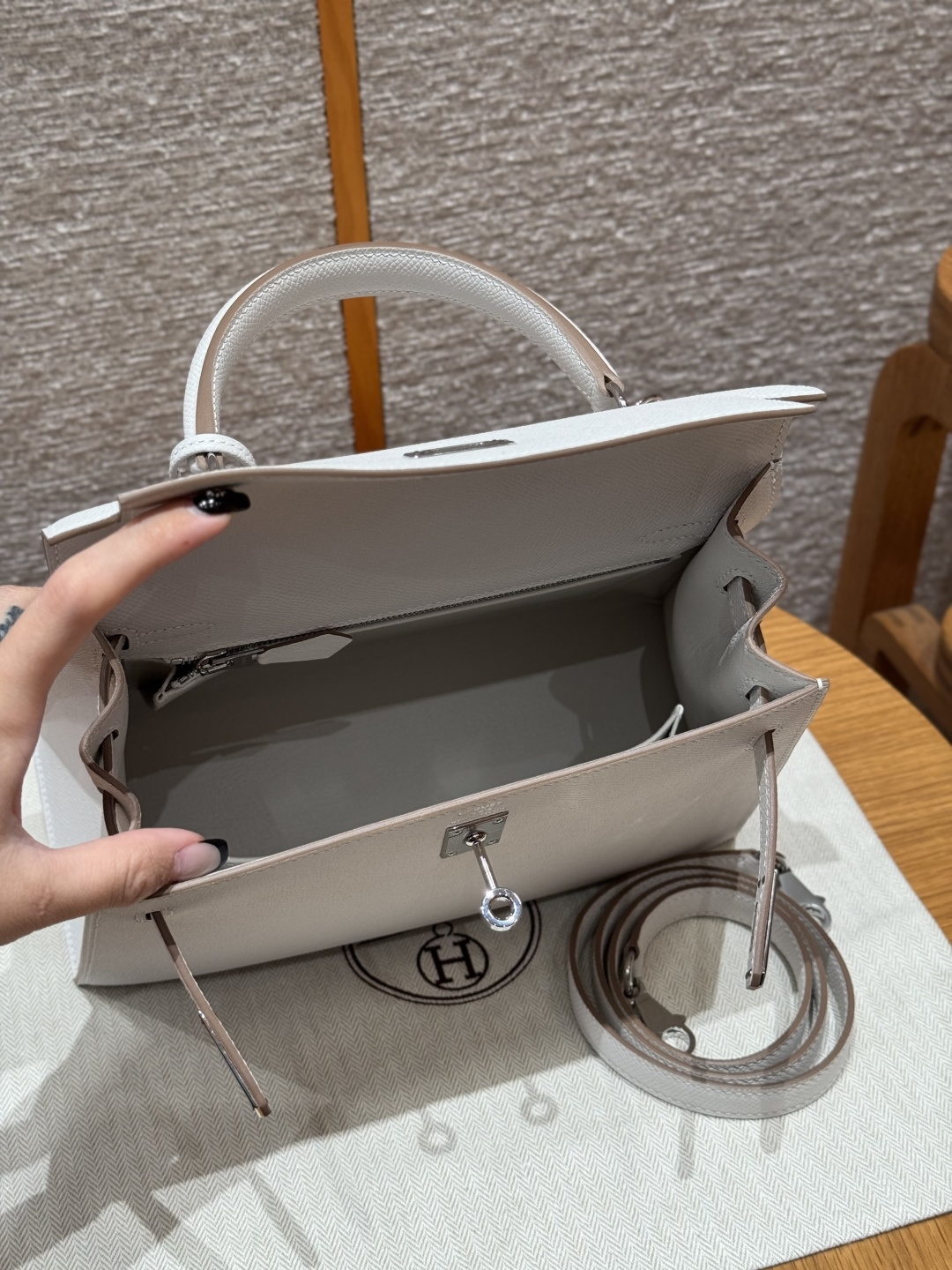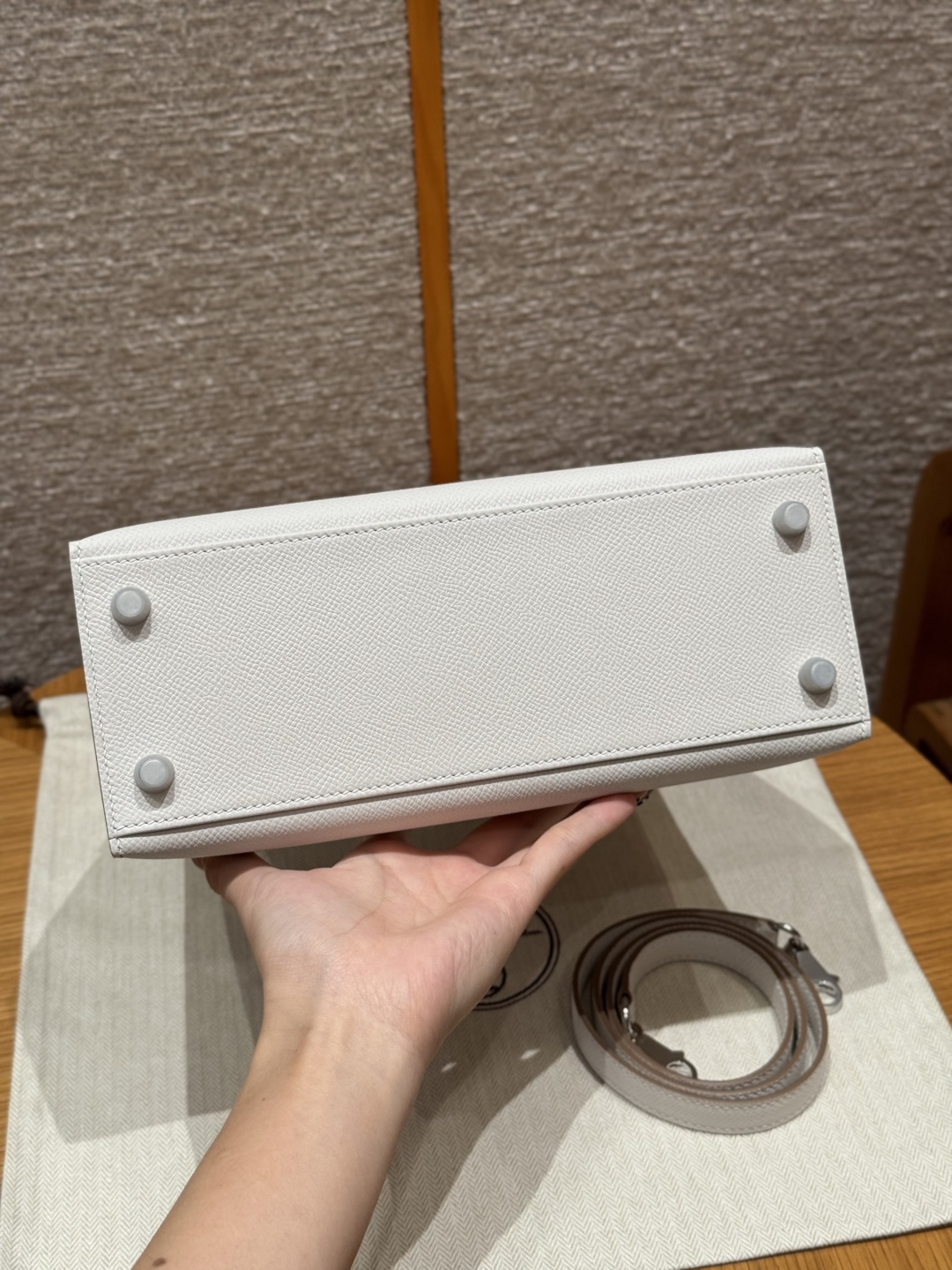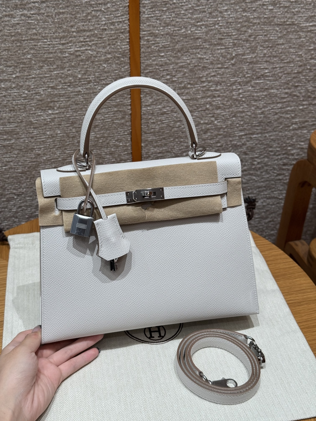 Kelly 25, milky grey, French imported vealer calfskin, silver buckle, advanced fully handcrafted exclusive customization.