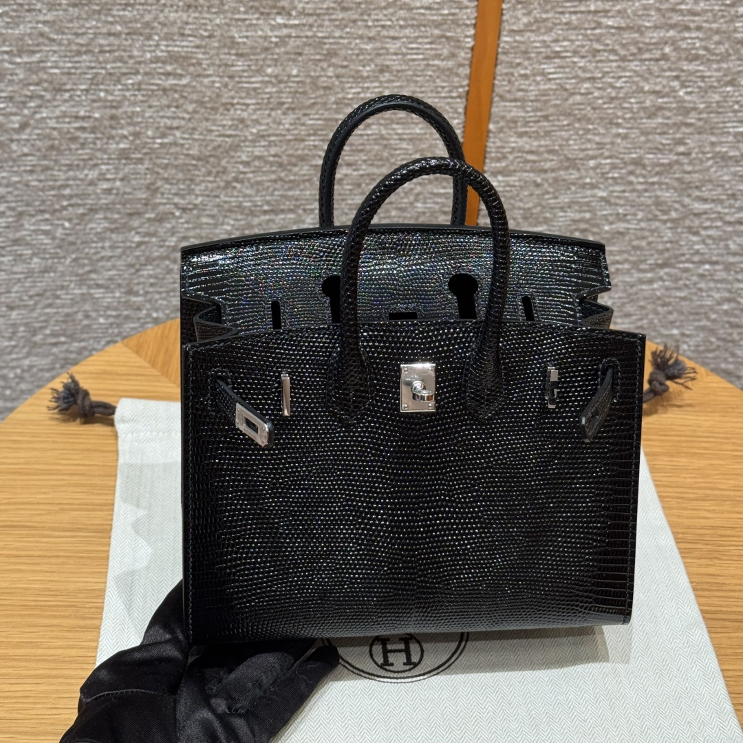 Birkin 20cm, black, lizard skin, French imported lizard skin, originally from South Africa, silver hardware, high-end fully handcrafted exclusive custom!