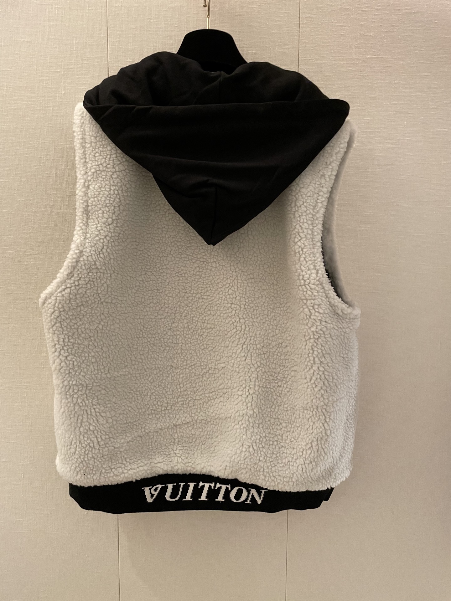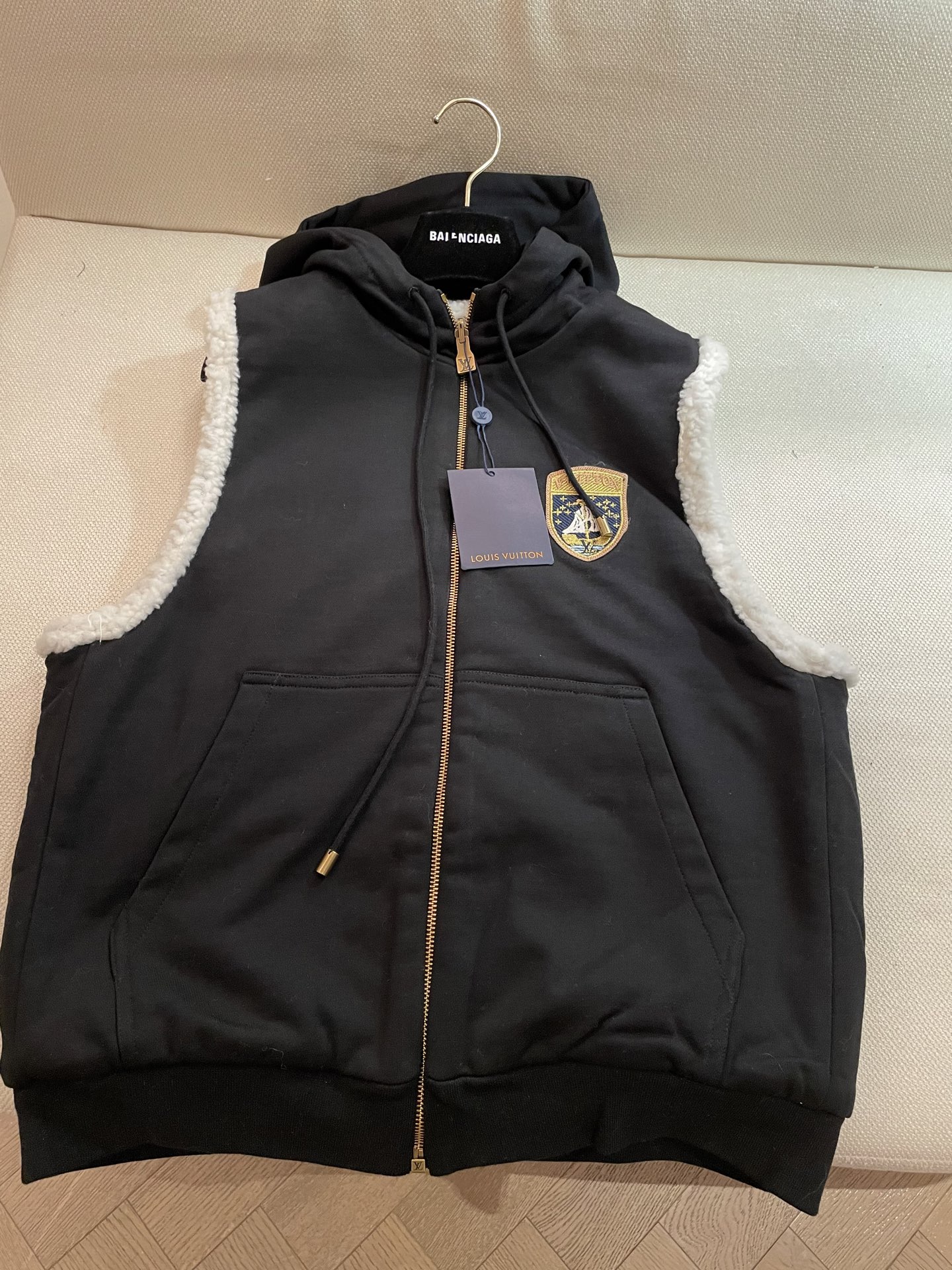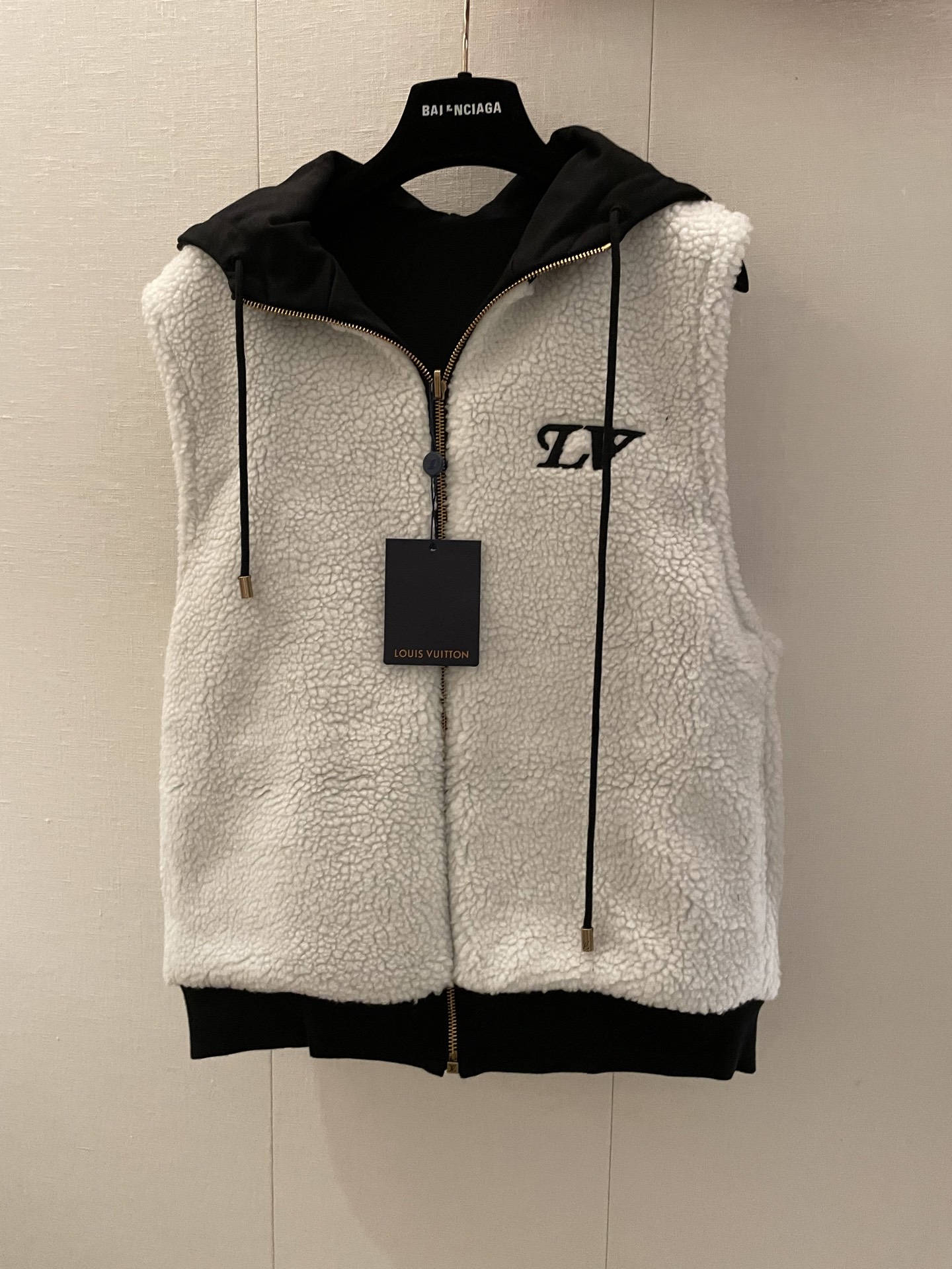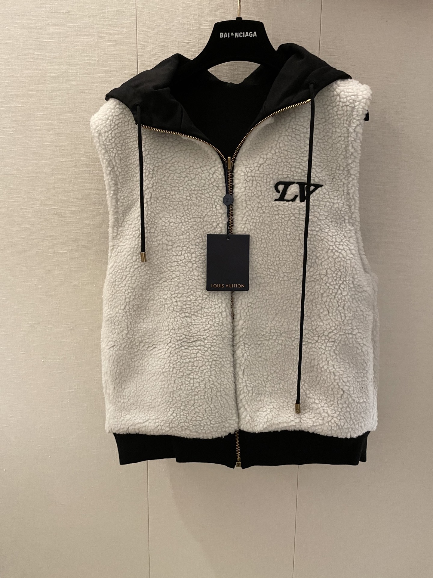Made of cotton and wool material, windproof and cold-resistant, easy to wear and take off, hooded vest jacket cut. Double-sided design, one side is soft and skin-friendly teddy lambswool, with fashionable and versatile letter logos, showcasing a cute and charming千金气质. The other side is smooth pure black, matching the chest letter shield emblem, highlighting the brand's style and adding a fashionable touch. Drawstring adjustment for a better fit in various occasions and personal styles. Slim fit, slimming and包容, a versatile must-have for autumn and winter, with high-quality texture, allowing for endless styling through layering. Sizes ML
