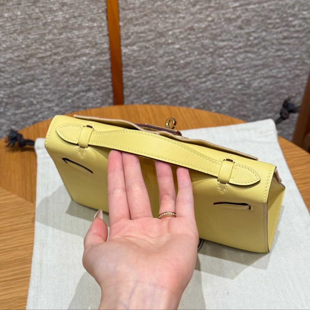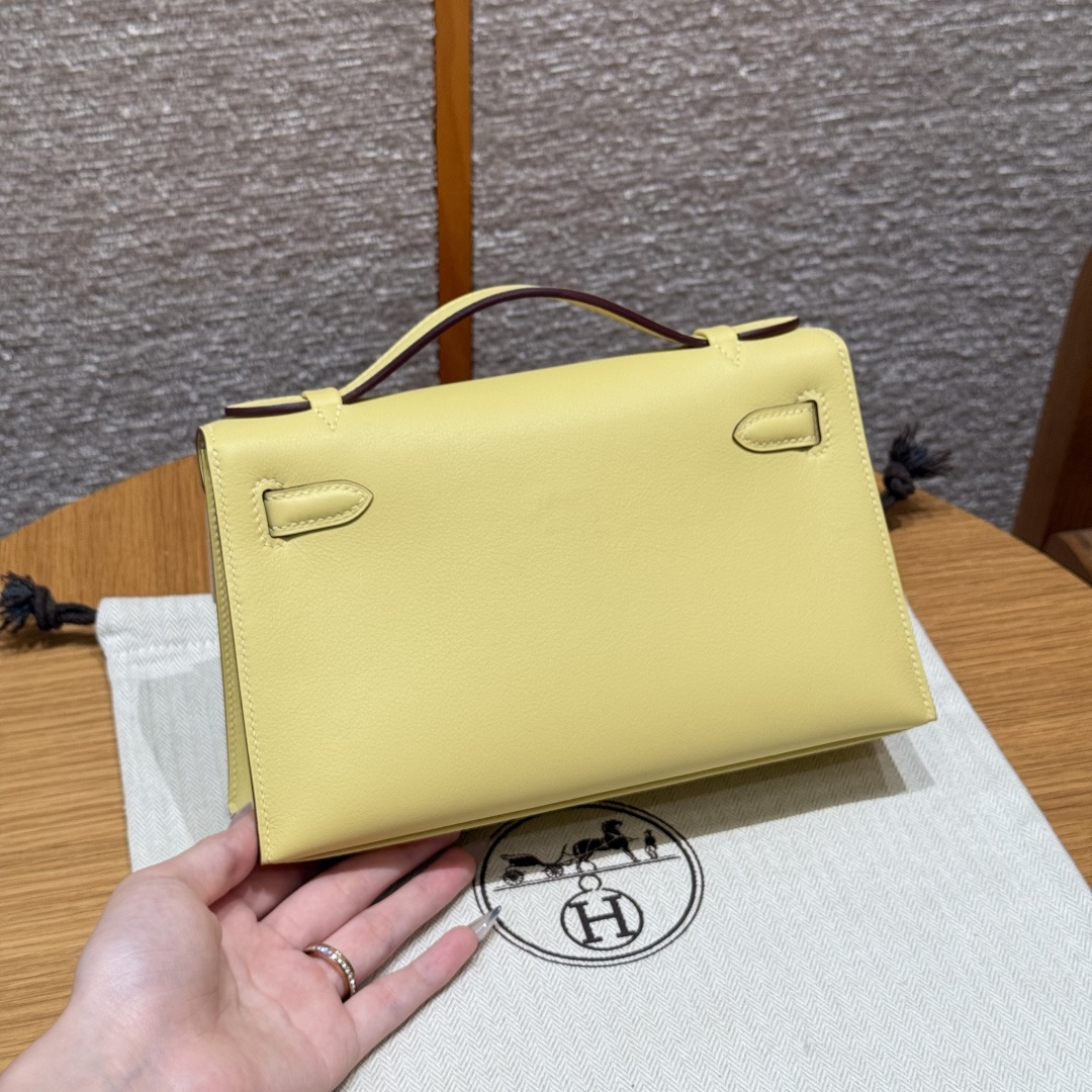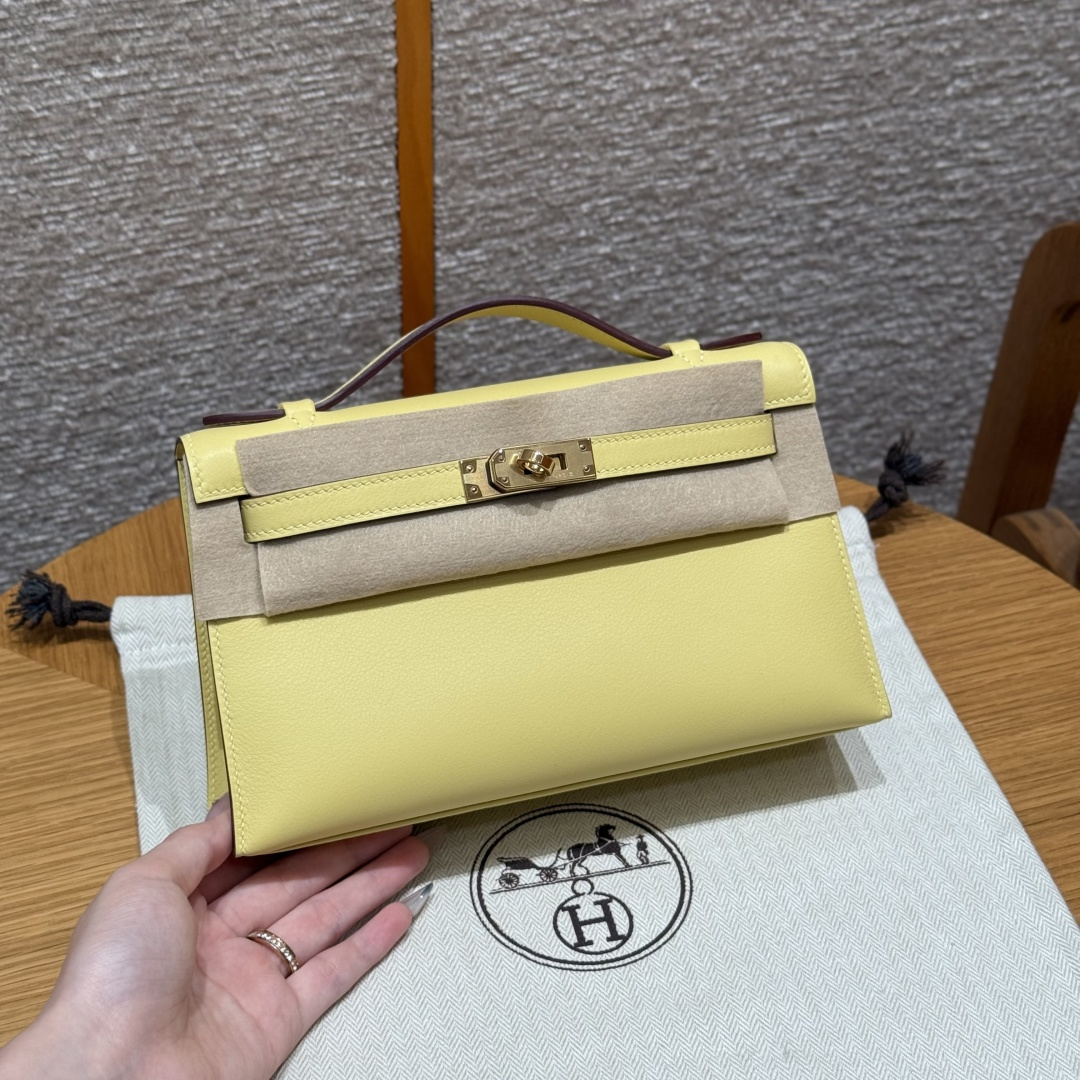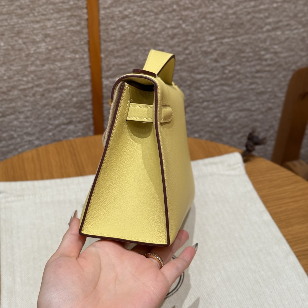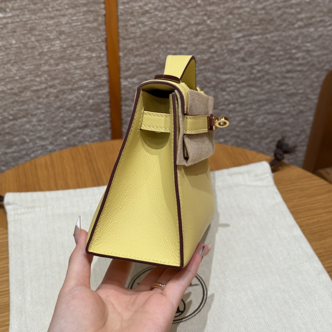 Mini Kelly first generation, chick yellow, plain grain leather, imported original French cowhide, gold clasp, high-end fully handcrafted exclusive customization.