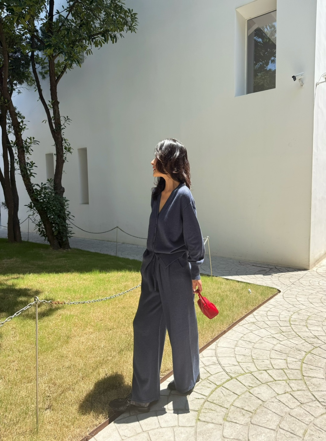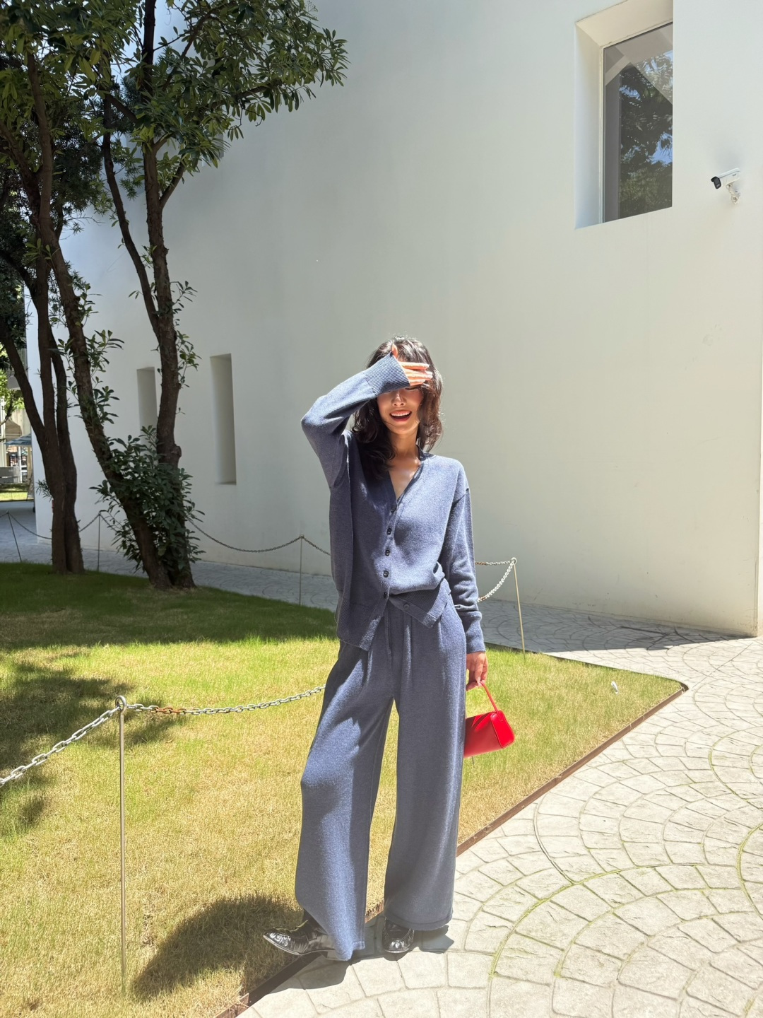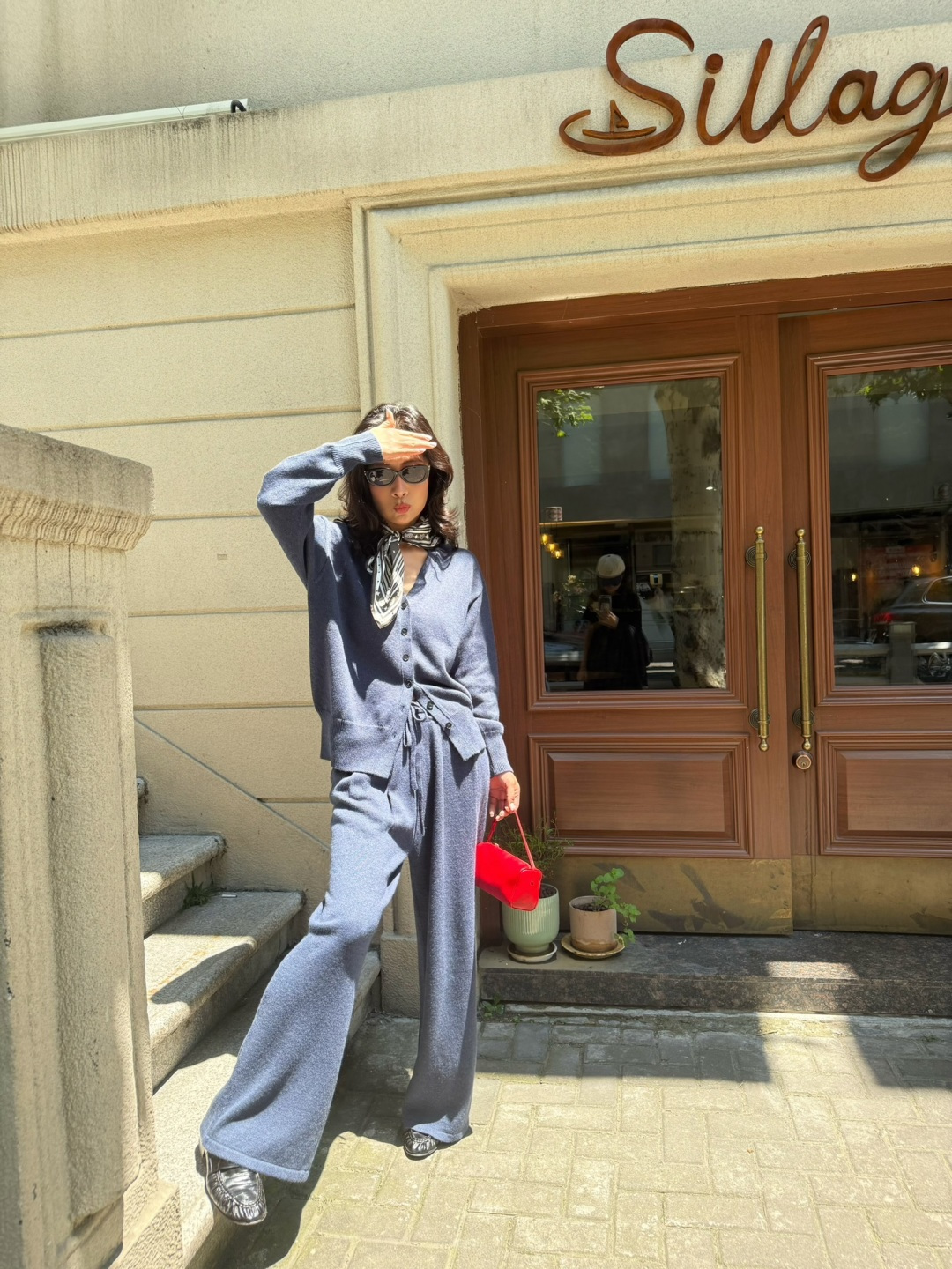 Hazy blue V-neck cardigan paired with drawstring wide-leg pants, mastering a relaxed and sophisticated look in one set!