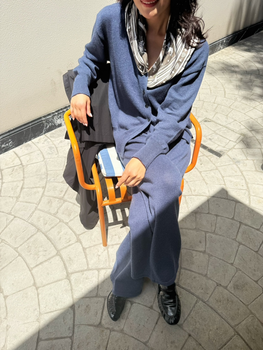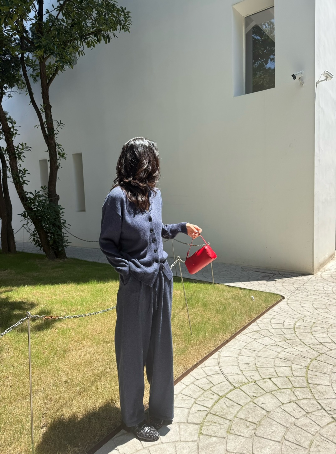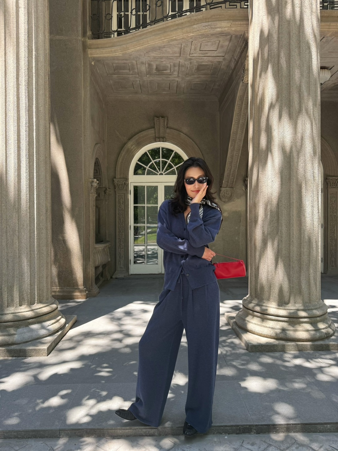 Hazy blue V-neck cardigan paired with drawstring wide-leg pants, mastering a relaxed and sophisticated look in one set!