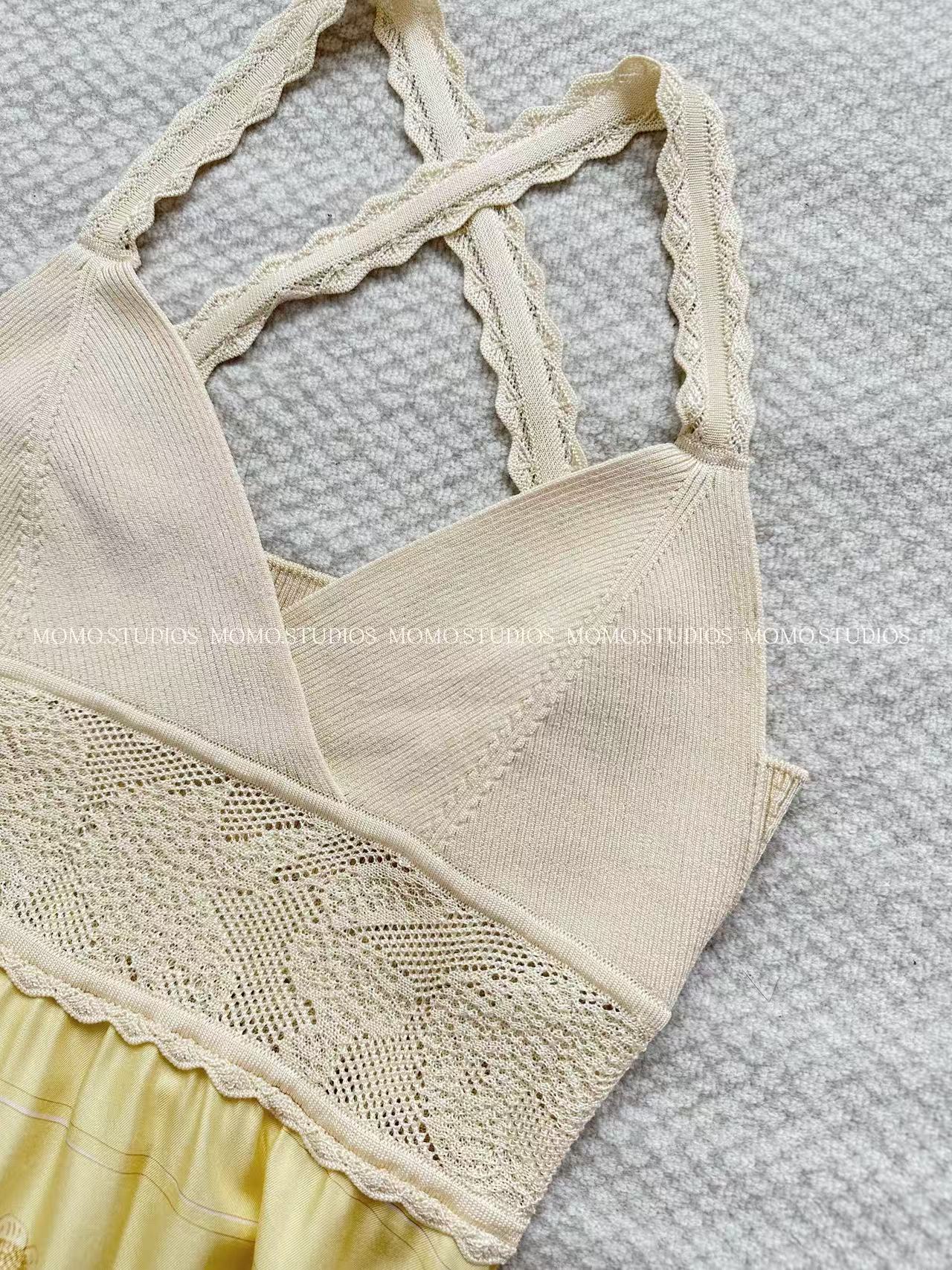 V-neck with cross strap design enhances the neckline, showcasing feminine elegance and sensuality. The ribbed top part uses 16-needle glossy yarn and raised stripe jacquart process, creating a refined and delicate texture. The front and back drape like a scarf, swaying gracefully with movement. Mesh and lace elements are subtly revealed.