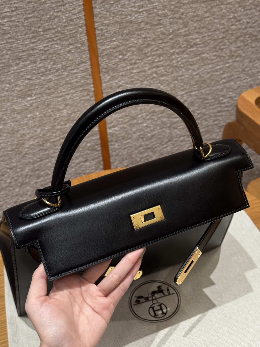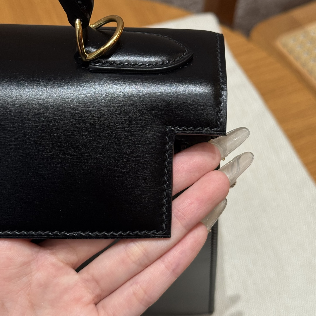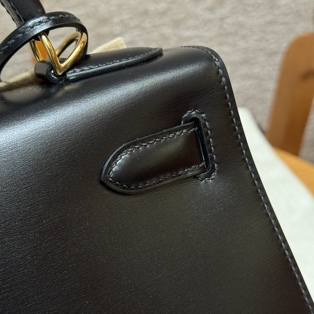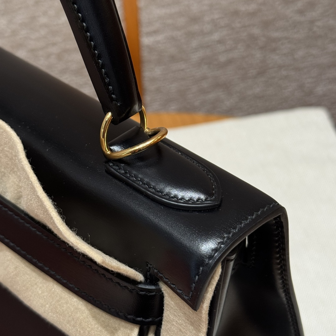 Kelly 32cm, Black, Box leather, French imported original factory cowhide, external stitching, gold clasp, high-end fully handcrafted exclusive customization.