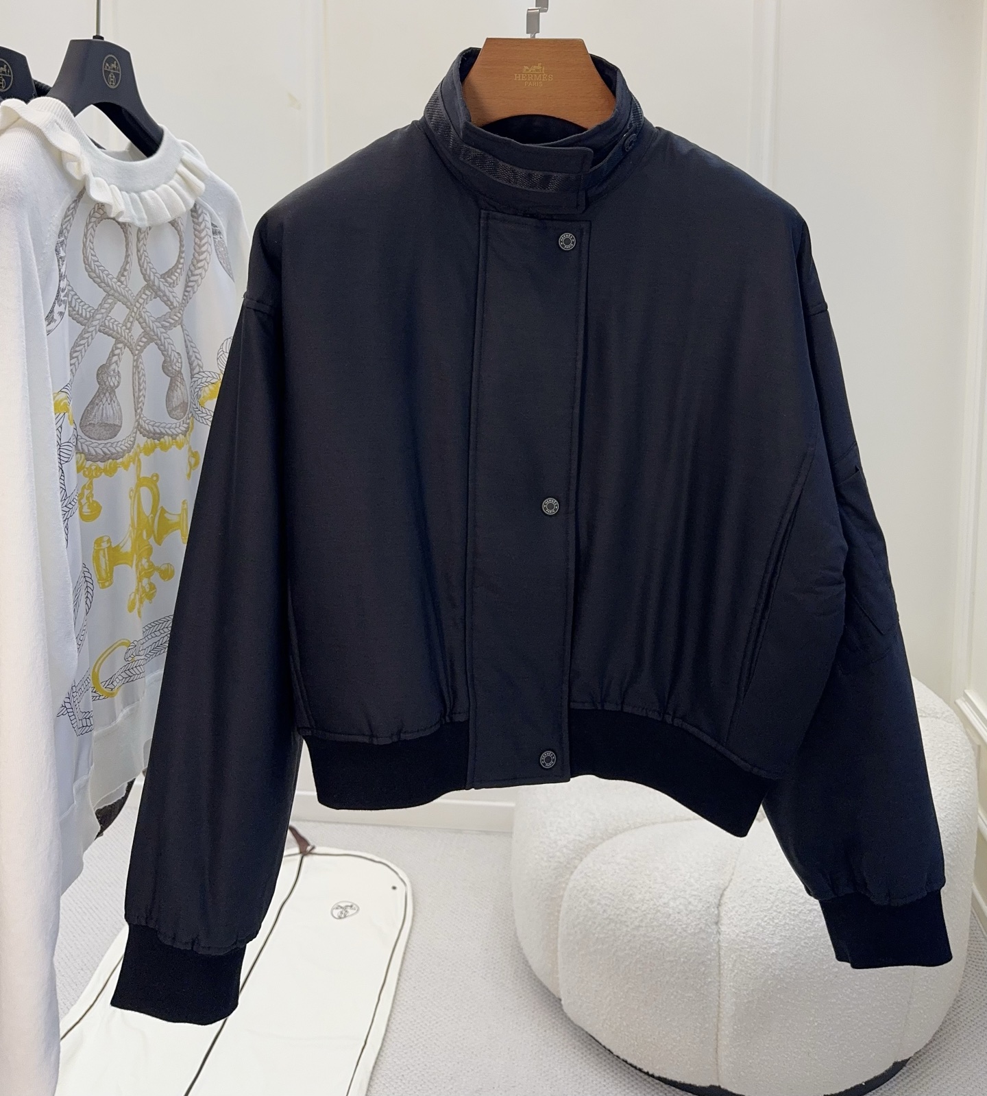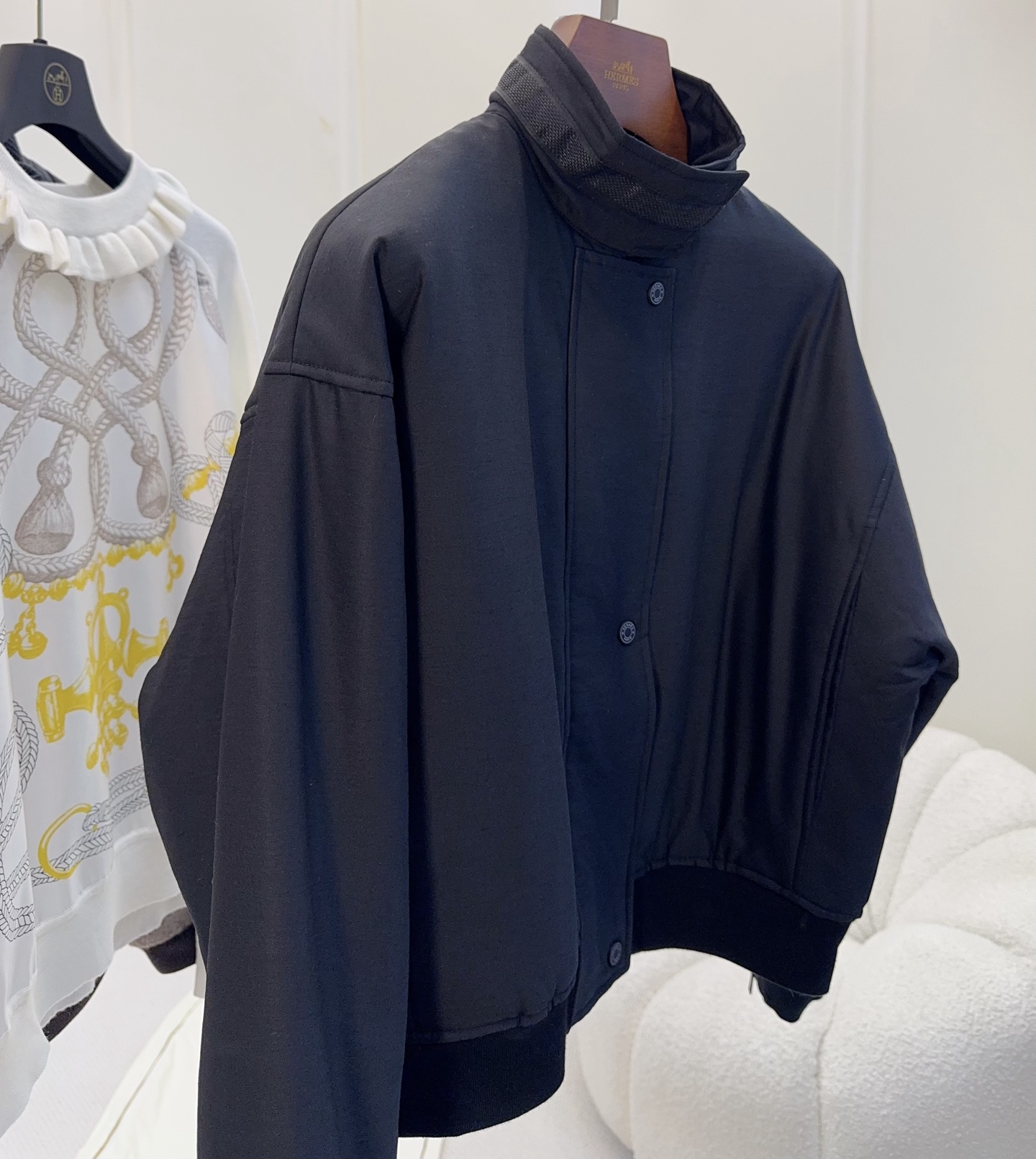 🆕🆕 Hermes 2025 autumn-winter new jacket cotton coat, custom wool blend fabric, focusing on simple and neat minimalist style, black main tone + neat cutting, low-key and textured design, high collar design for warmth, cuff and hem splicing details enhance the sense of layering. Cuff and hem elastic closure, warm and windproof, suitable for commuting, dating, and casual wear, black versatile, paired with wide-leg pants or cargo pants, cool and chic or relaxed style can be switched at will~ American痞帅 style!