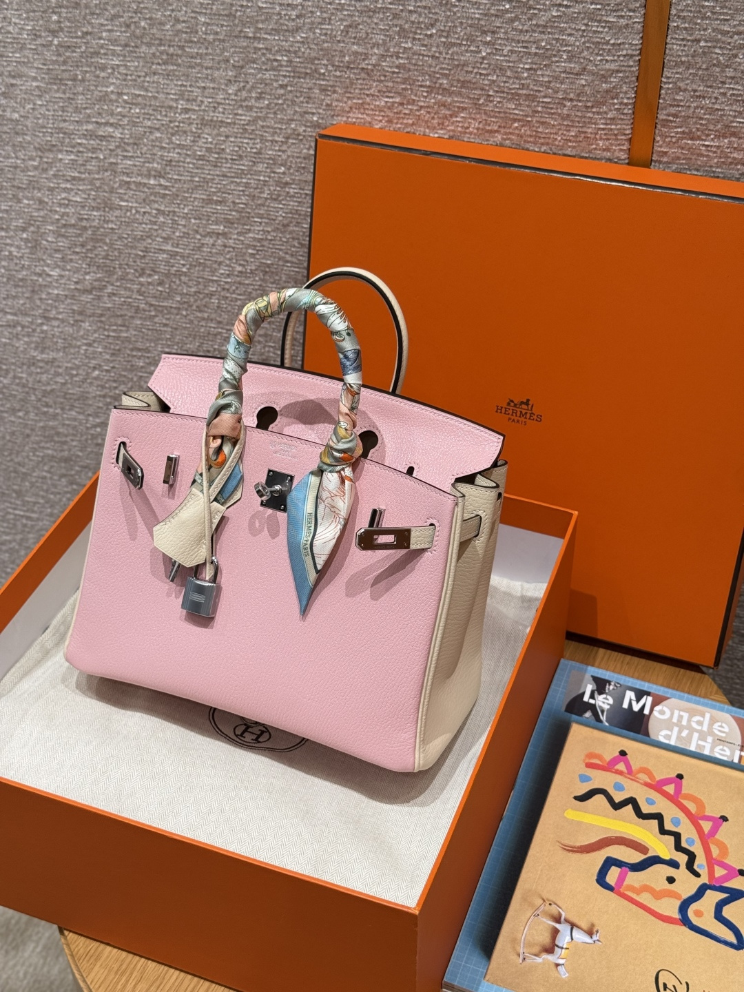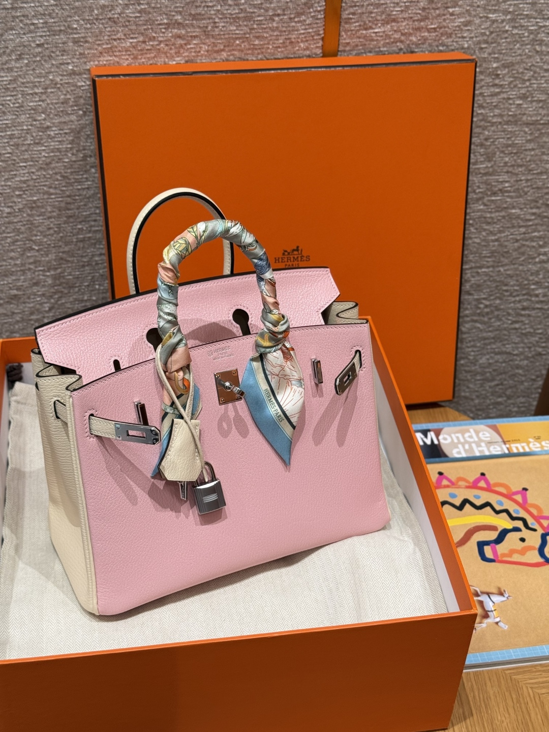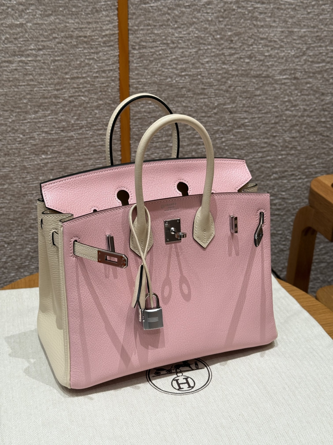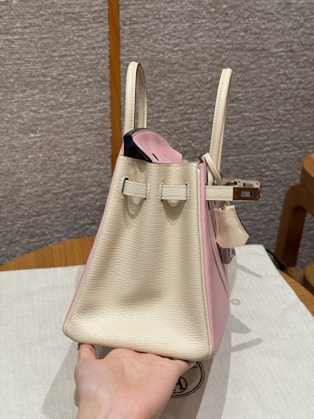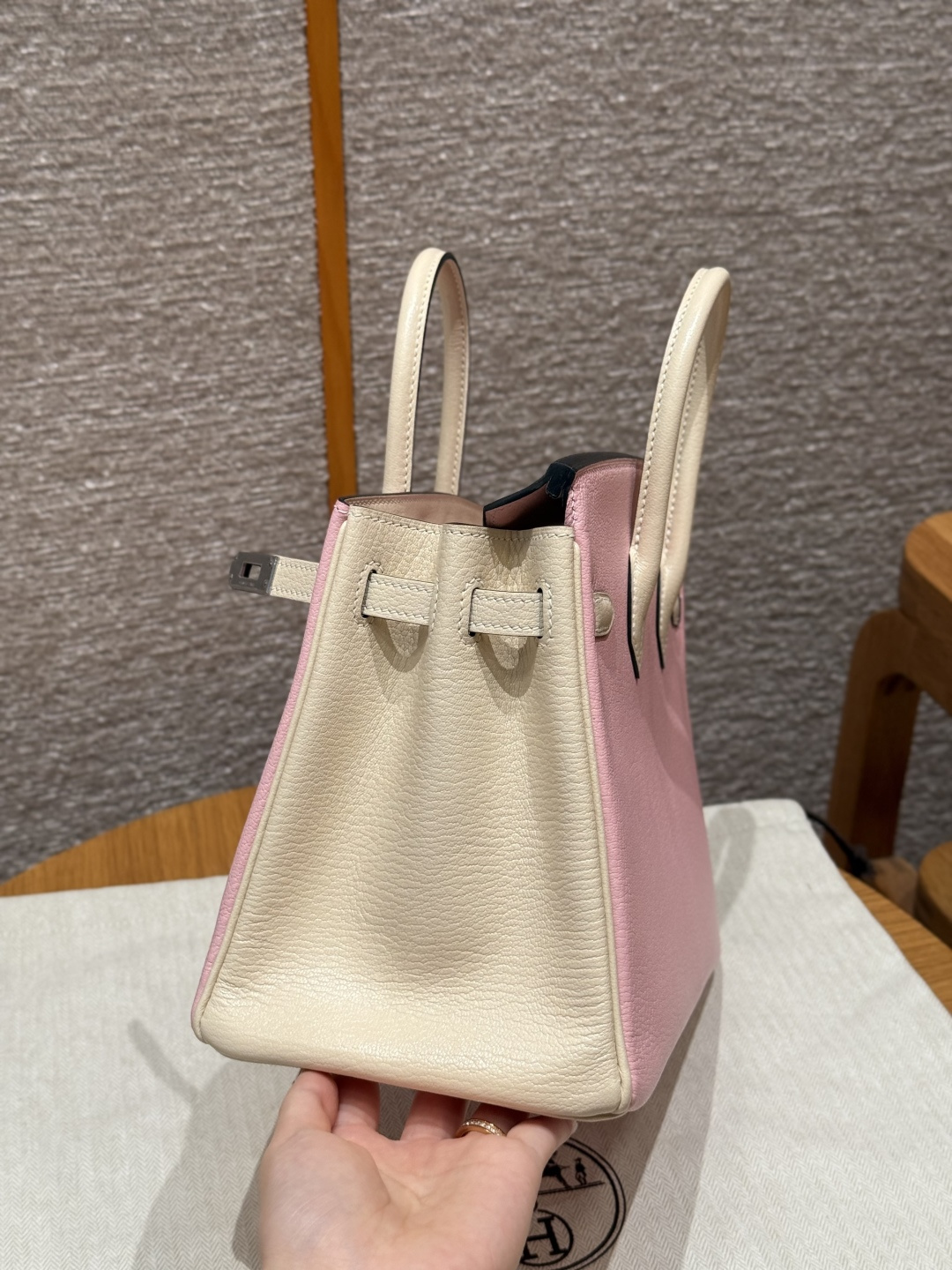 Platinum 25, 3Q pink/cream white, goat leather, imported original factory leather, silver clasp high-end fully handcrafted exclusive customization.