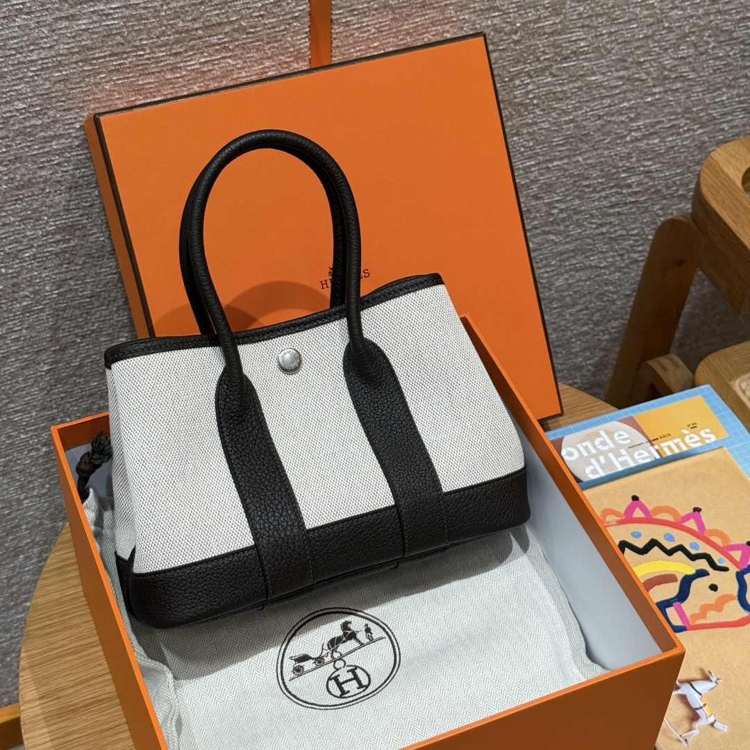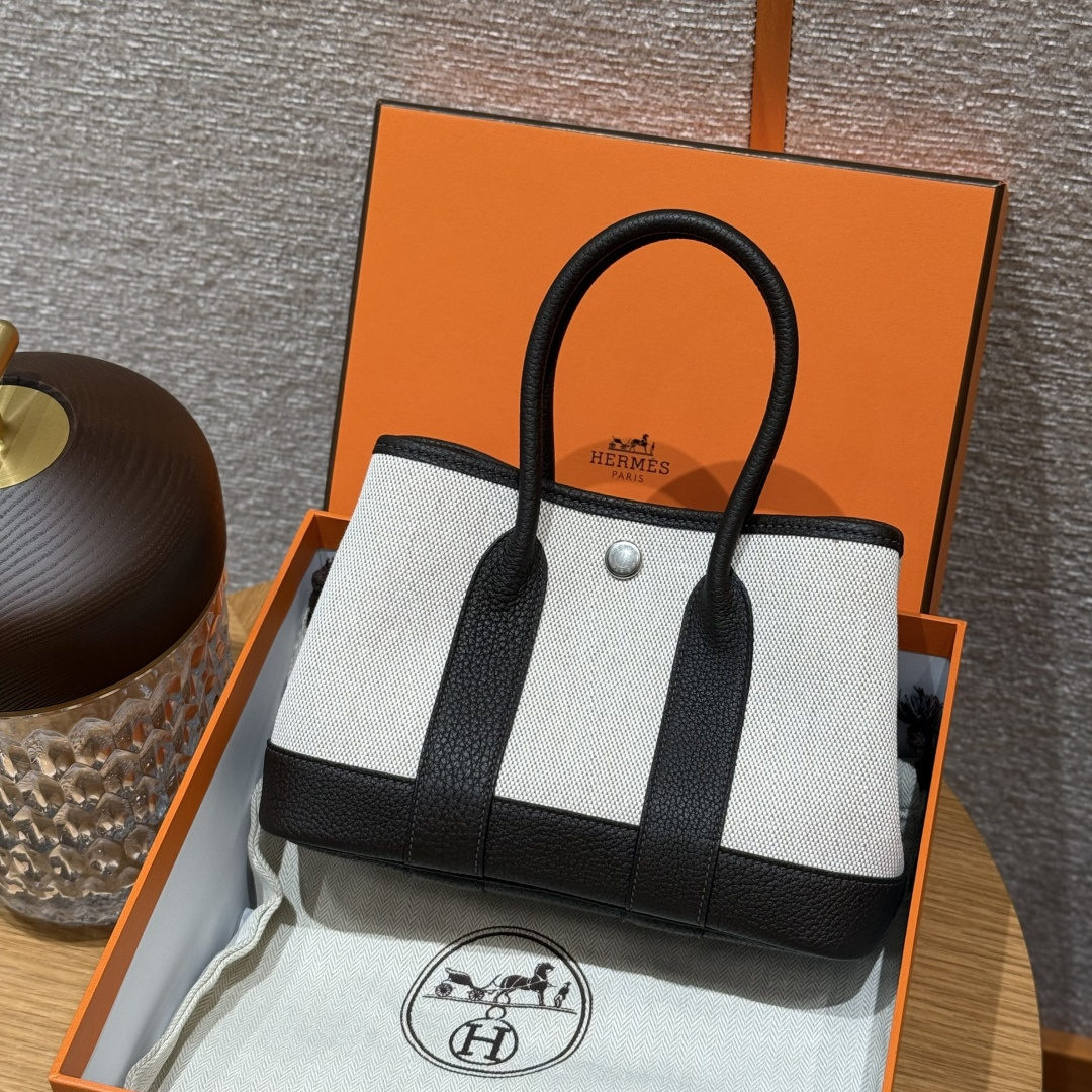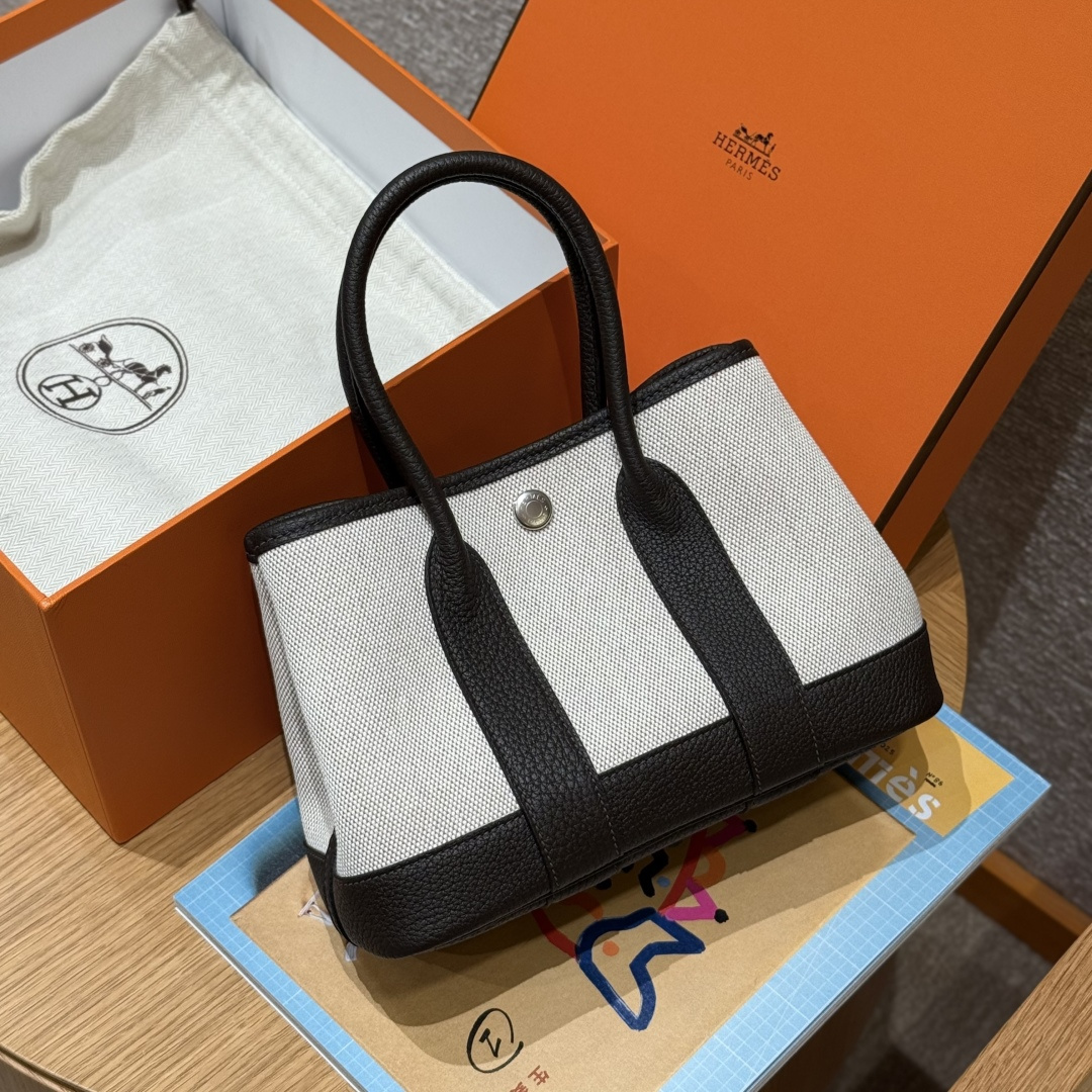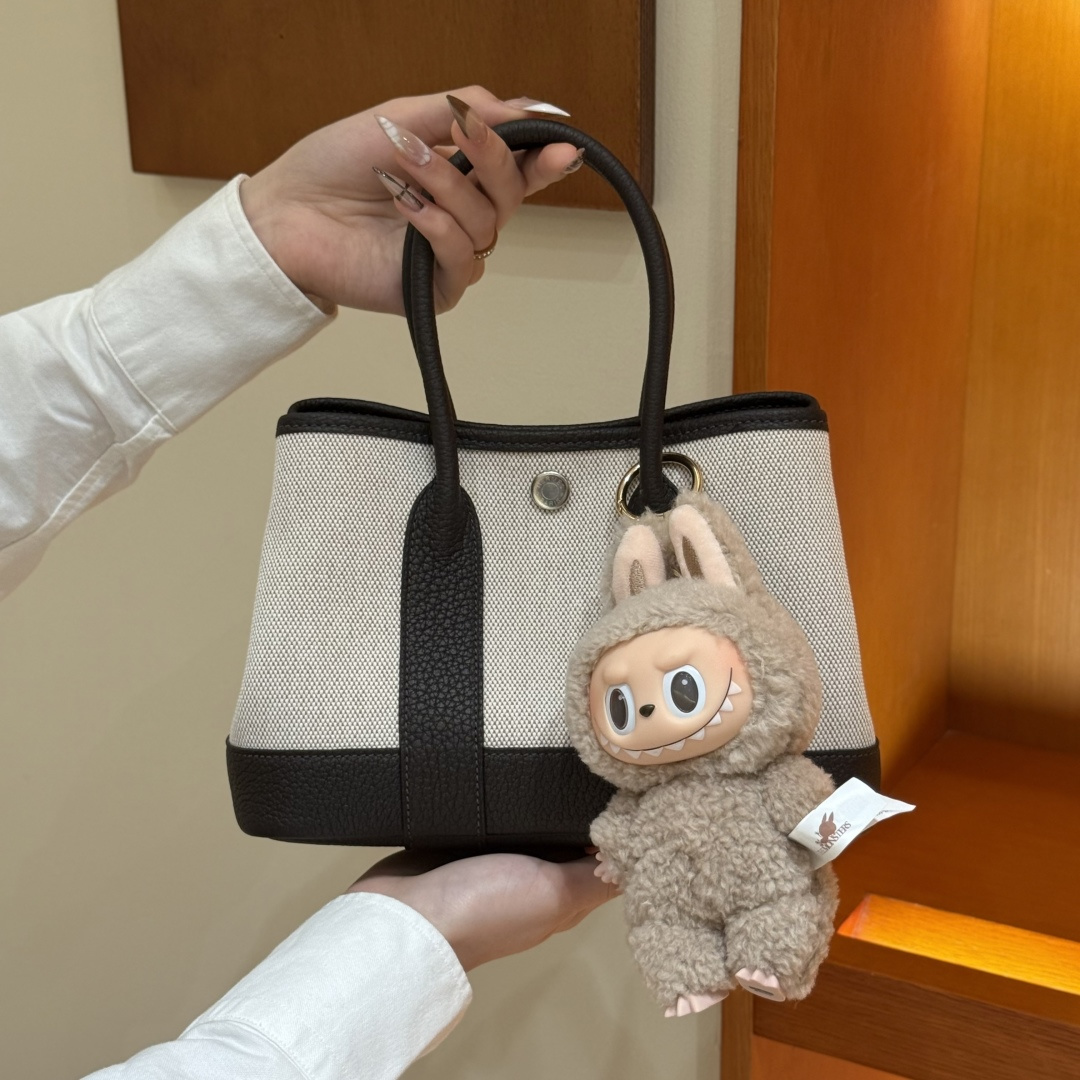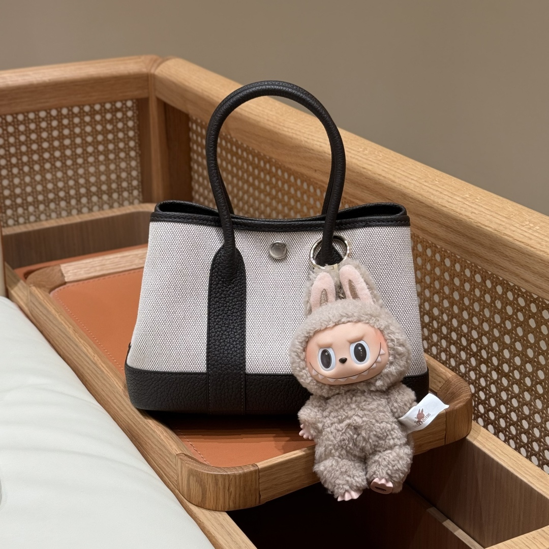 Garden bag 23cm, light beige/beige/ebony, canvas with Ntogo, original French imported cowhide, silver clasp, fully hand-stitched, handcrafted high-end custom.