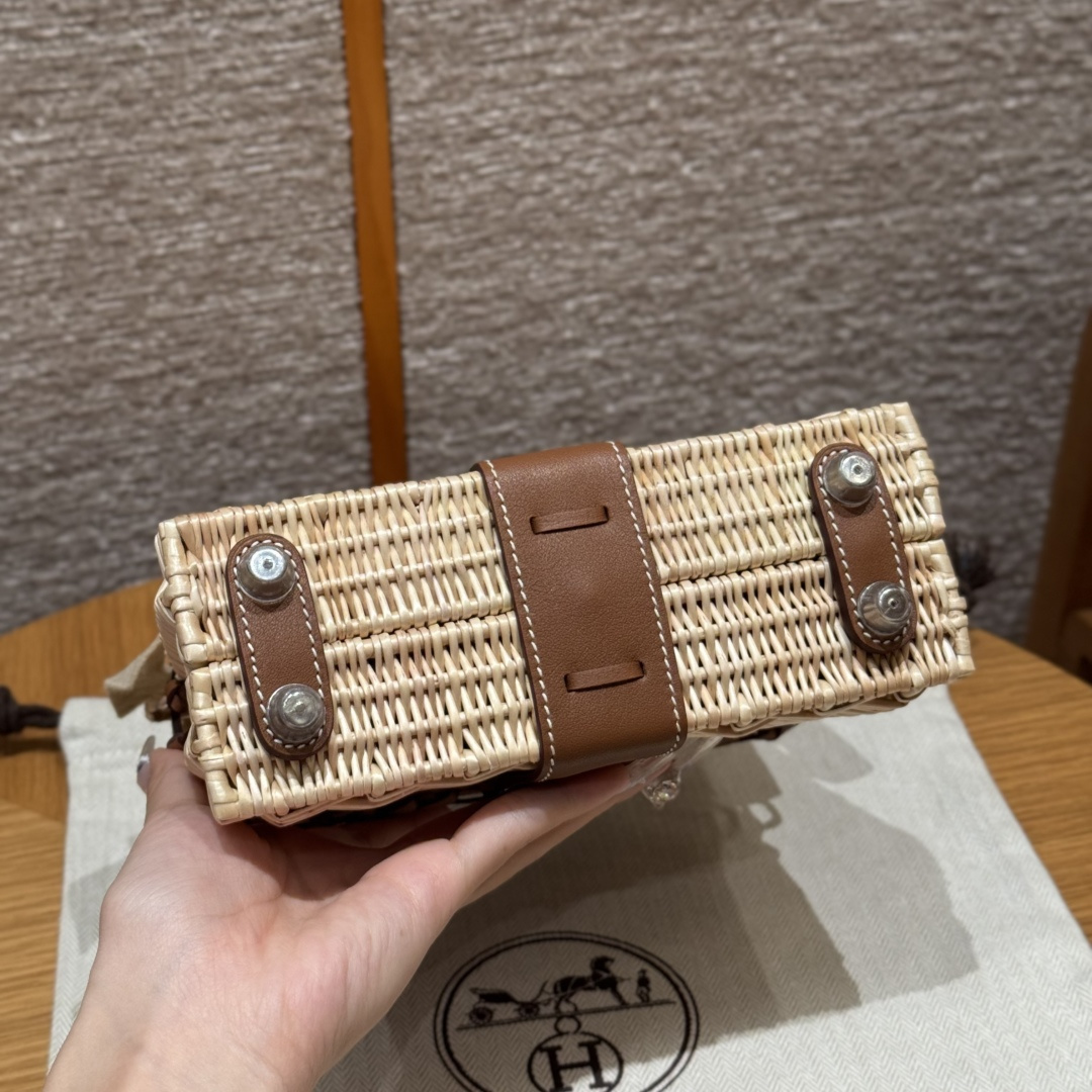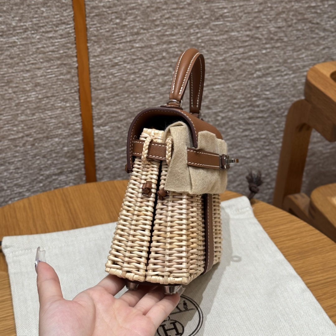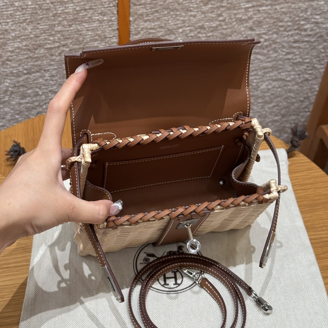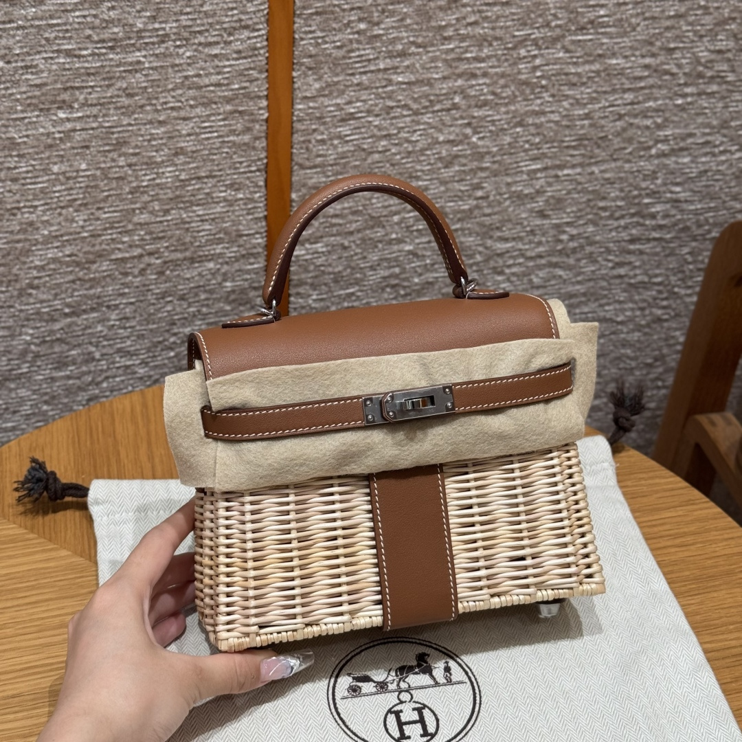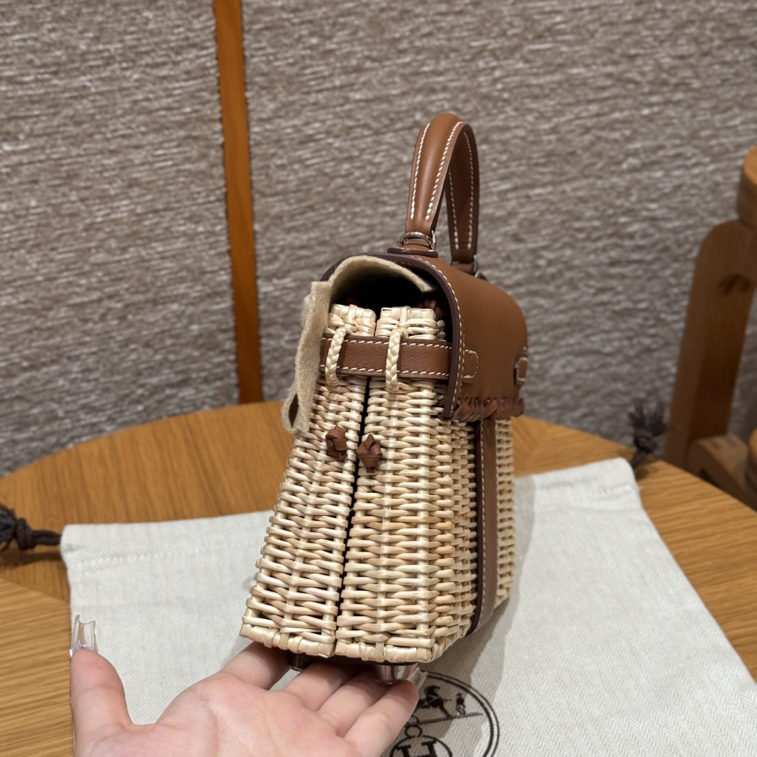Kelly picnic bag, golden brown, plain leather, original French imported cowhide, French imported bamboo woven frame, silver buckle, high-end fully handcrafted exclusive customization.