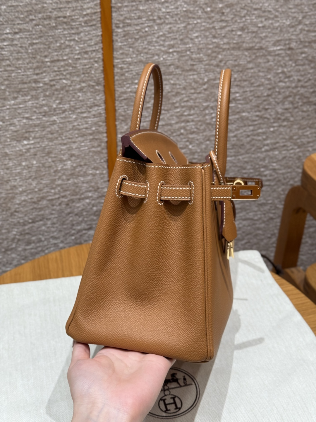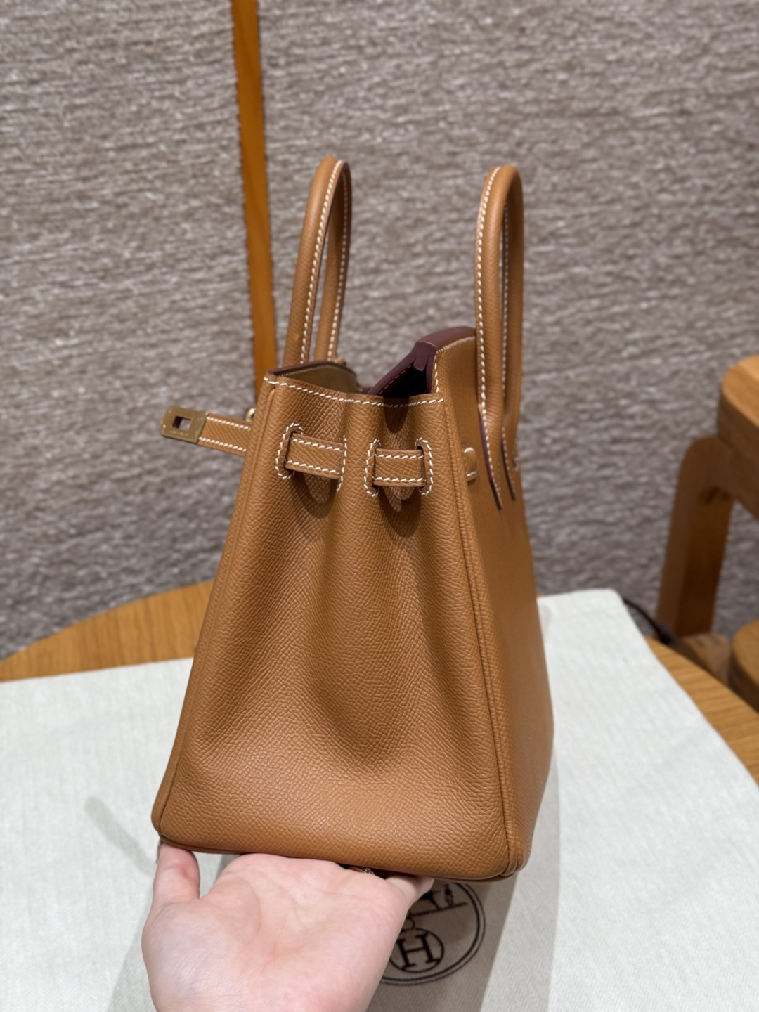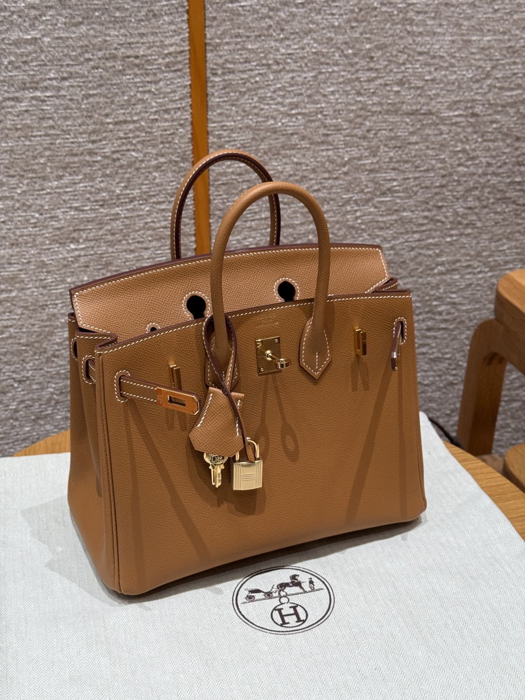 Birkin 25, Golden Brown, Palm-grained leather interior stitching, French imported original cowhide, gold clasp, premium fully handmade exclusive customization.
