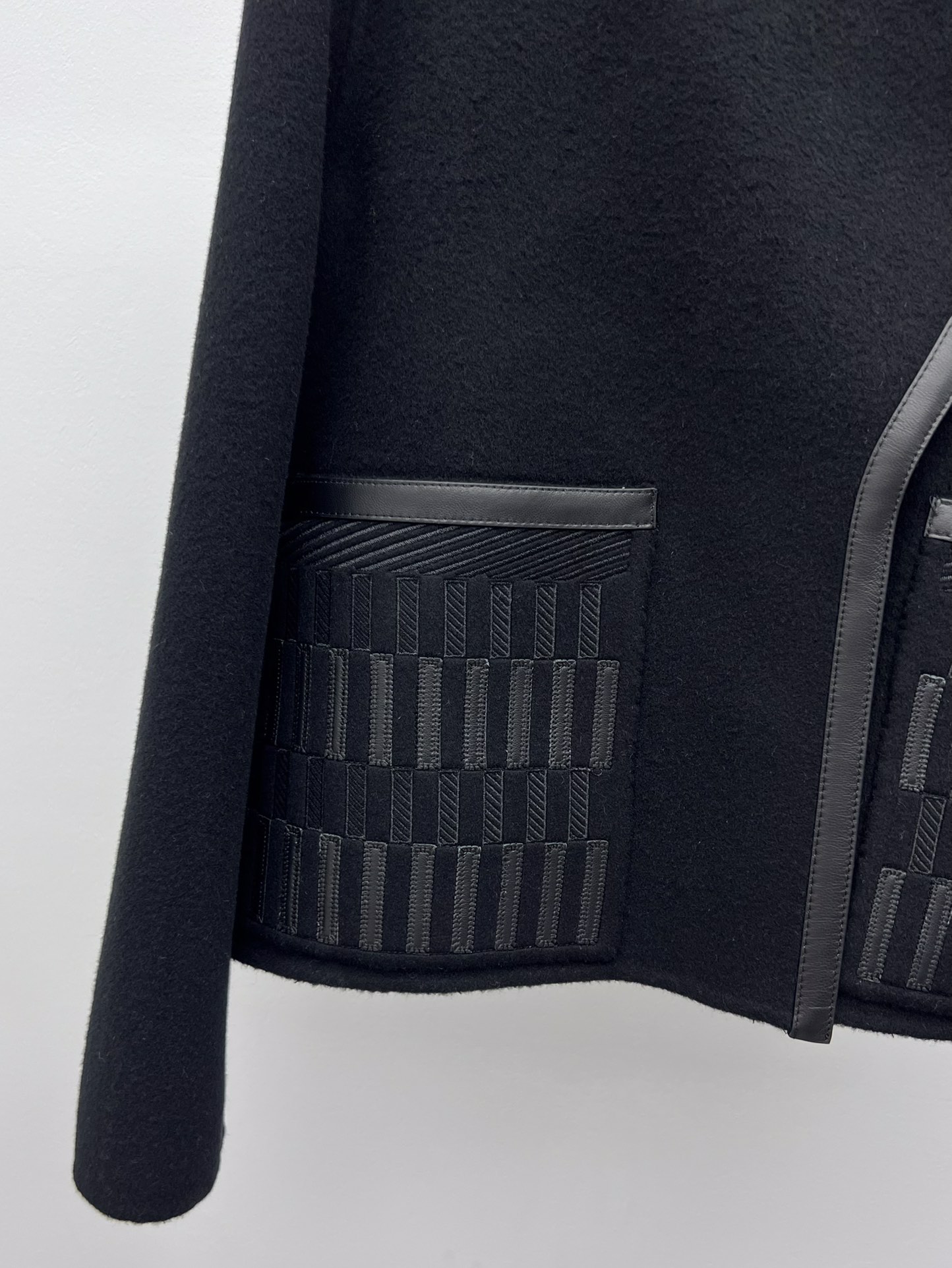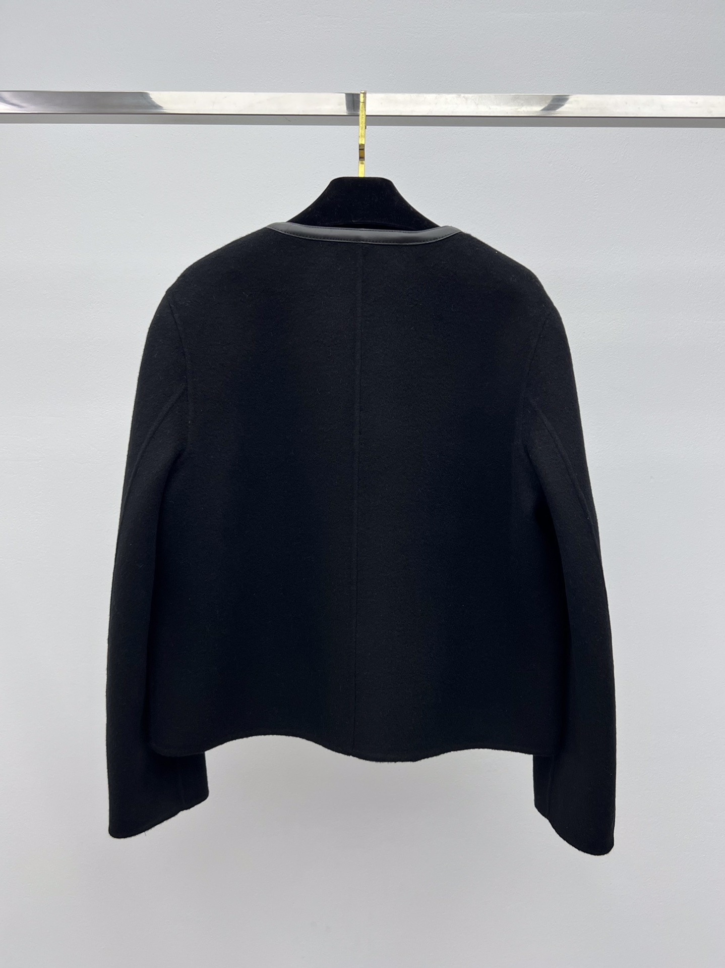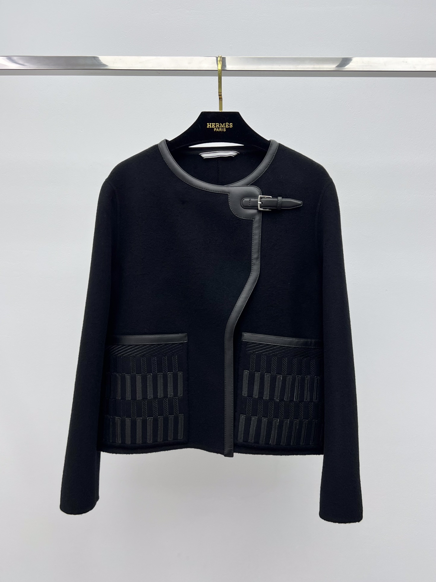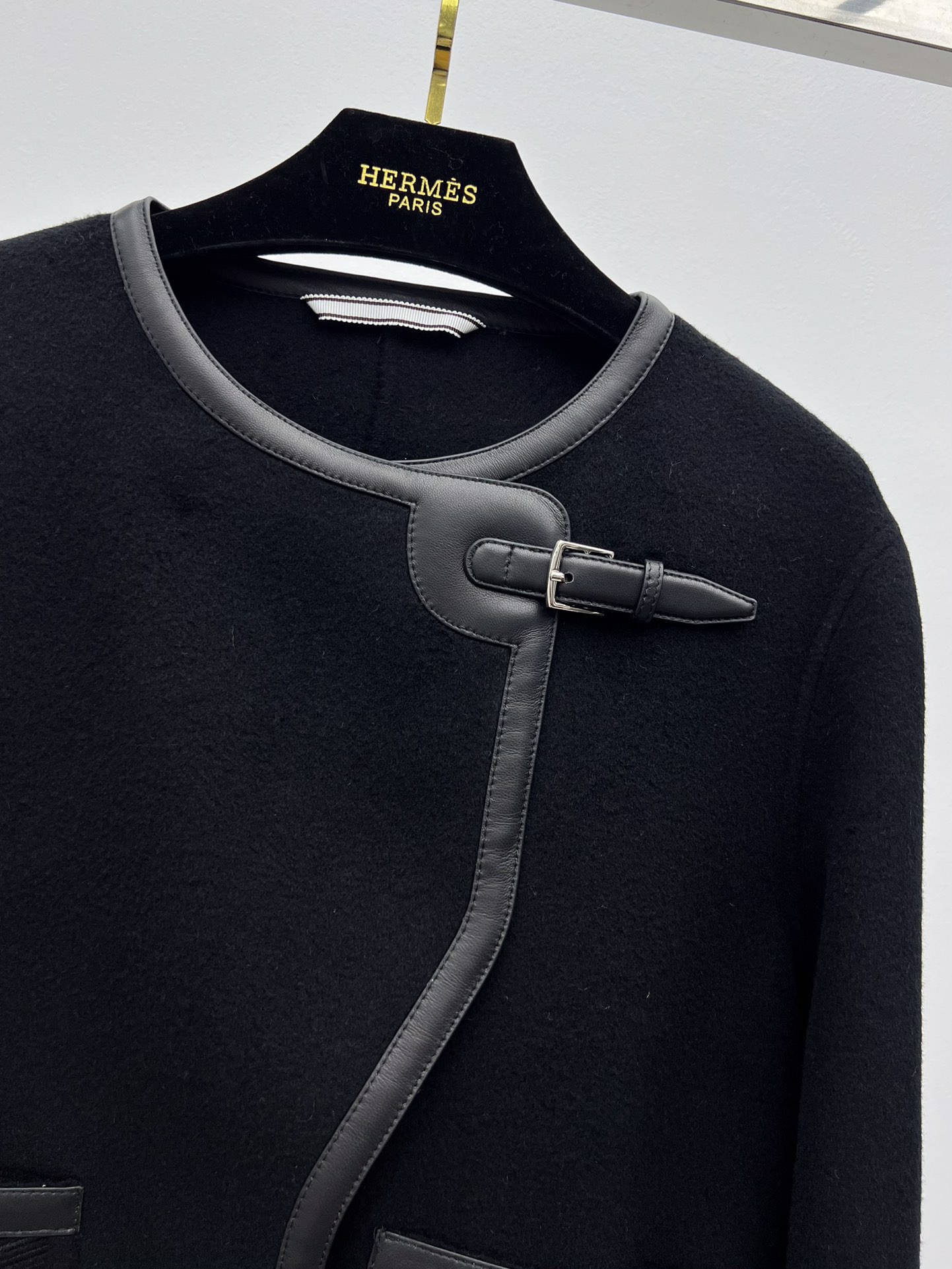 Original Title: Herme* Round Neck Leather Trimmed Jacket