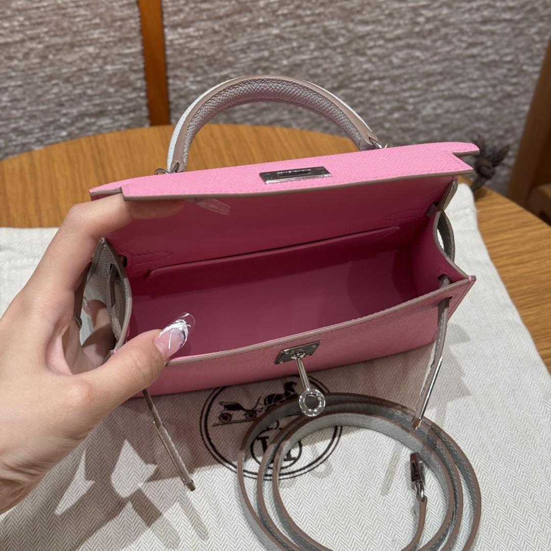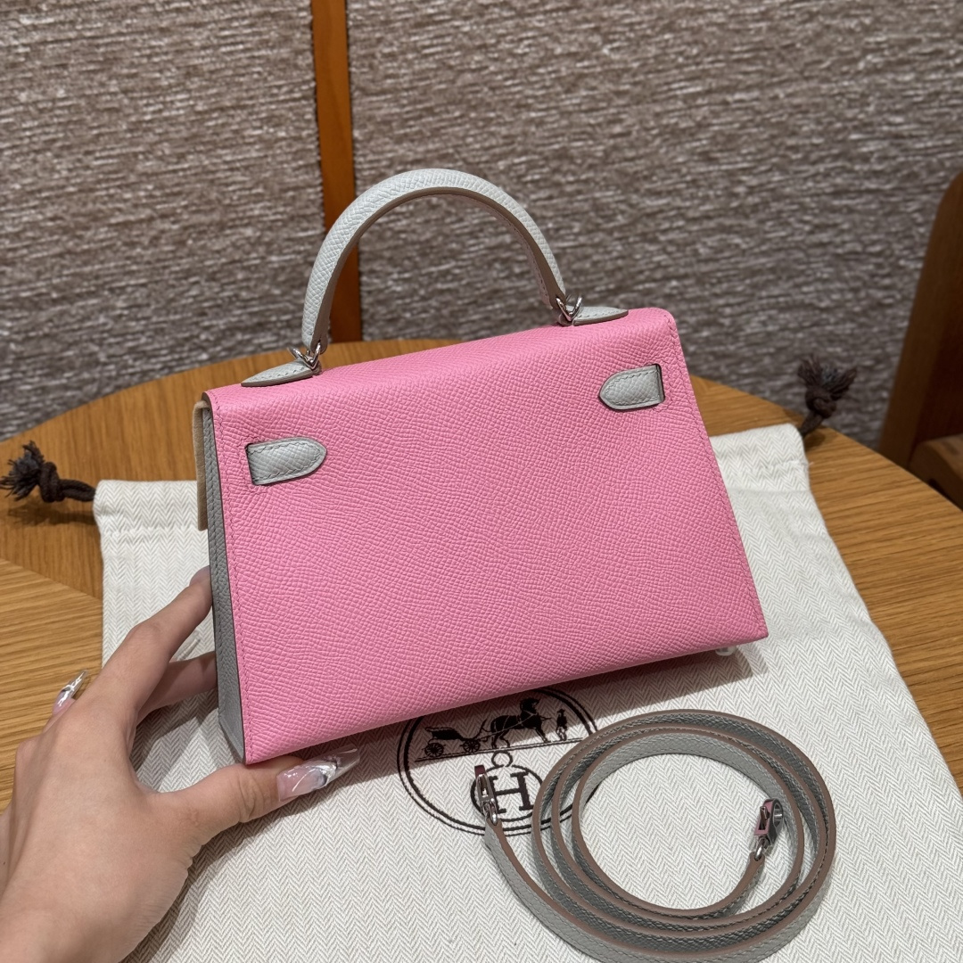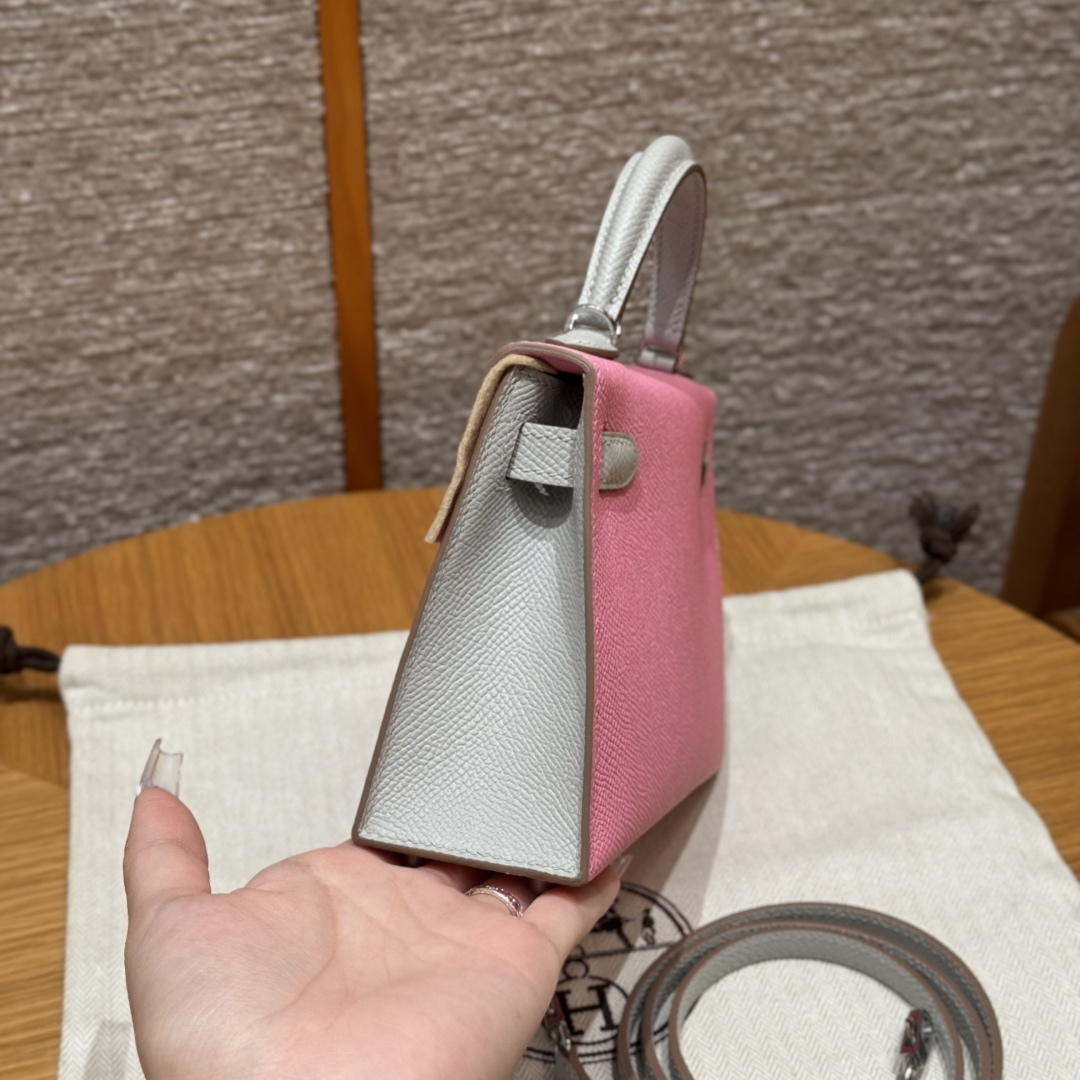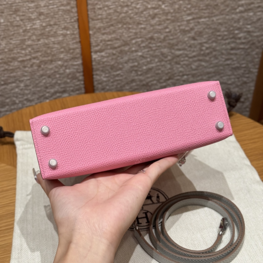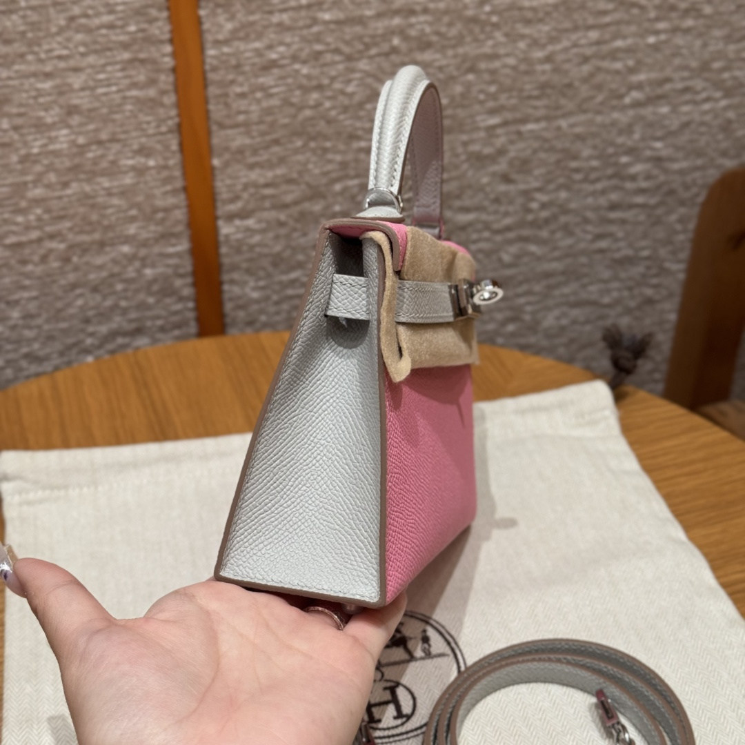 Mini Kelly 2nd generation, 3Q cherry blossom pink/pearl gray, palm-grained leather, original French imported cowhide, silver clasp, horseshoe engraving, high-end fully handcrafted exclusive customization.