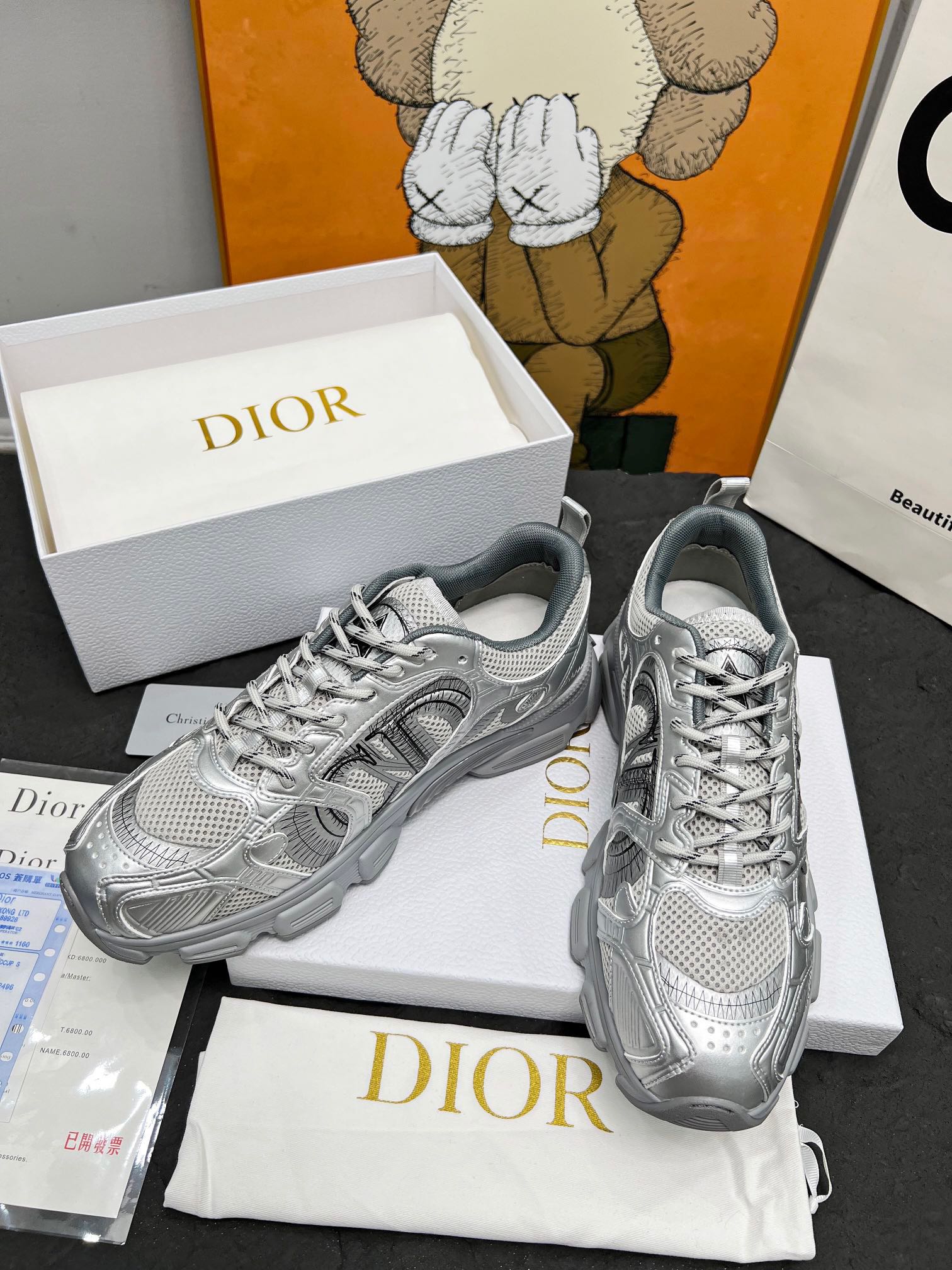 Home • Shoe • Dior Chrono sneakers from Fall 2024. Gray mesh with silver leather details, CD logo, and star patches. Comes in white, pink, gold, silver. Women's 35-41, Men's 40-46.