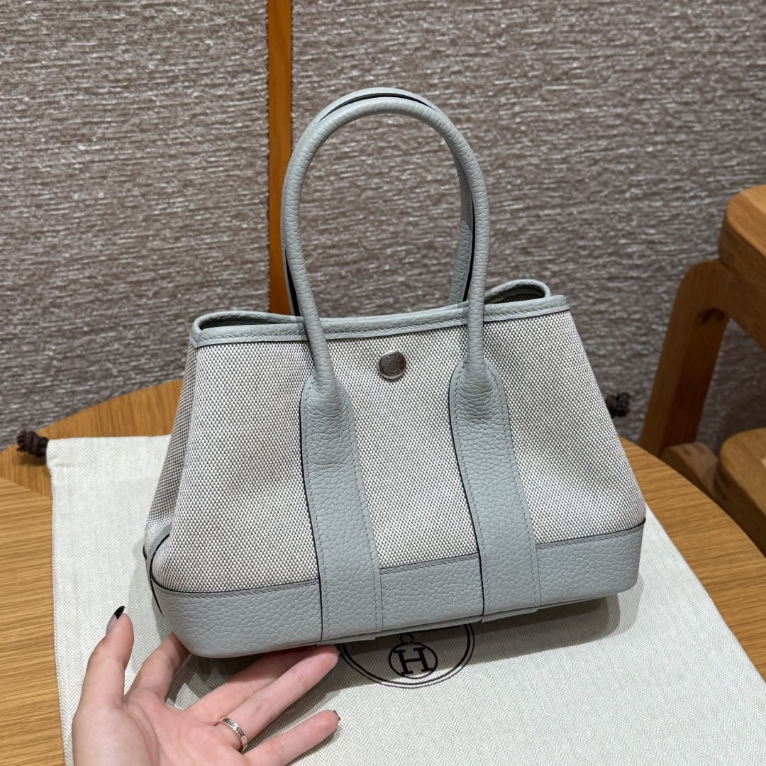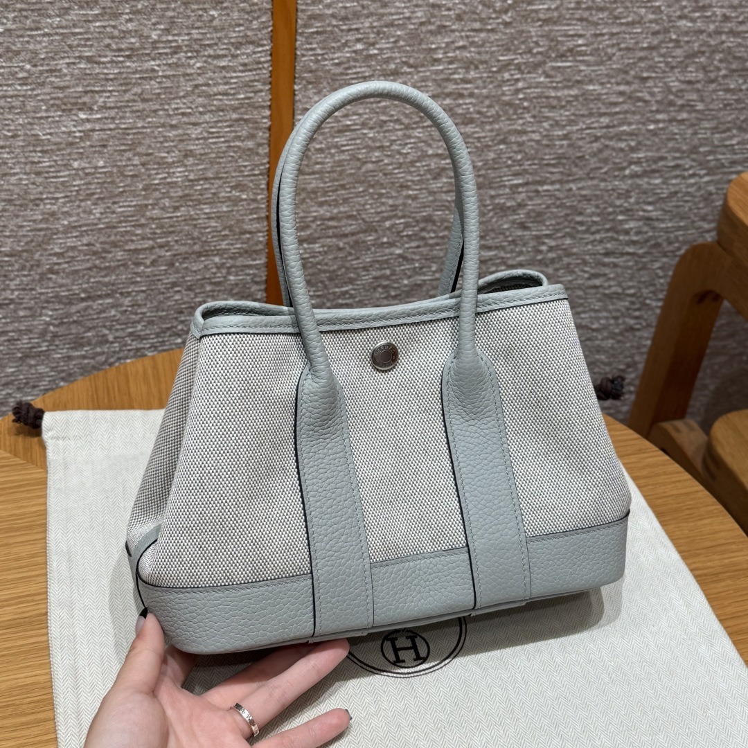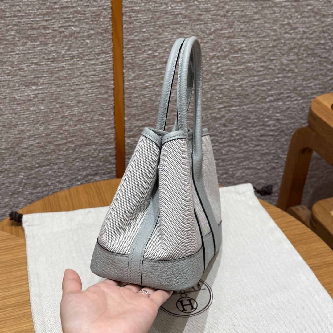 Garden bag 23cm, light beige/glacier blue/misty gray, canvas with NTOGO, French imported original cowhide, silver buckle, fully hand-stitched high-end custom made.