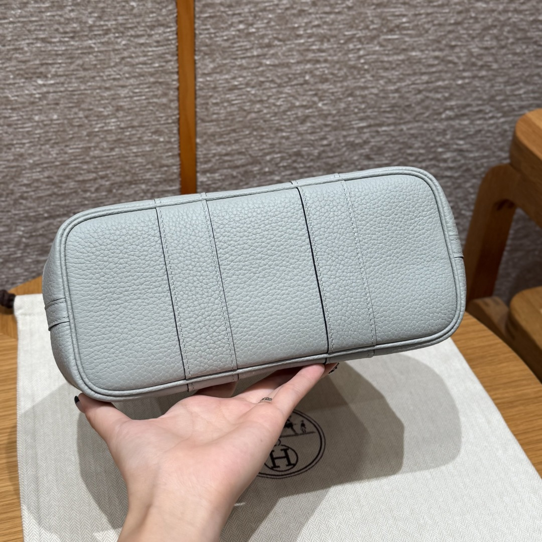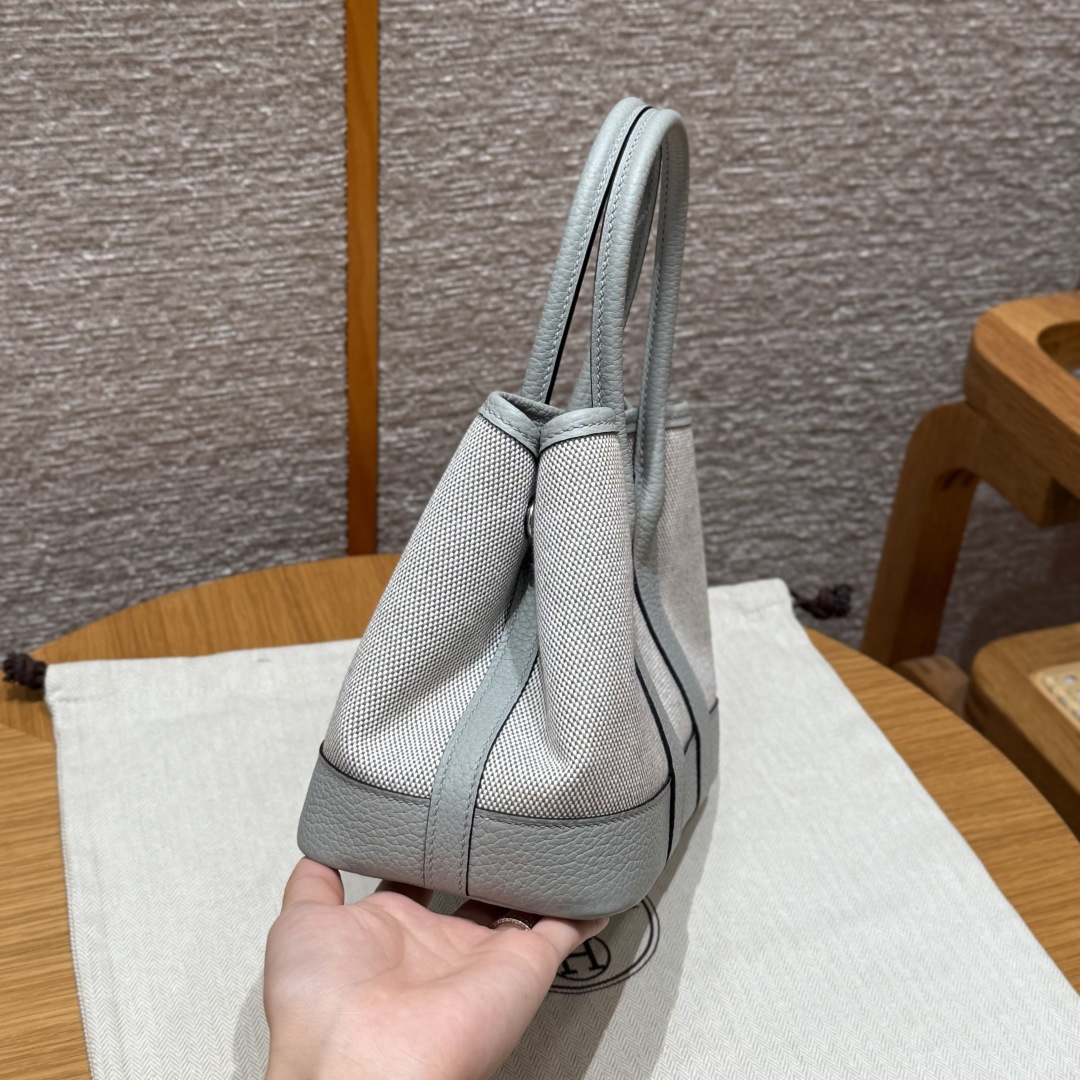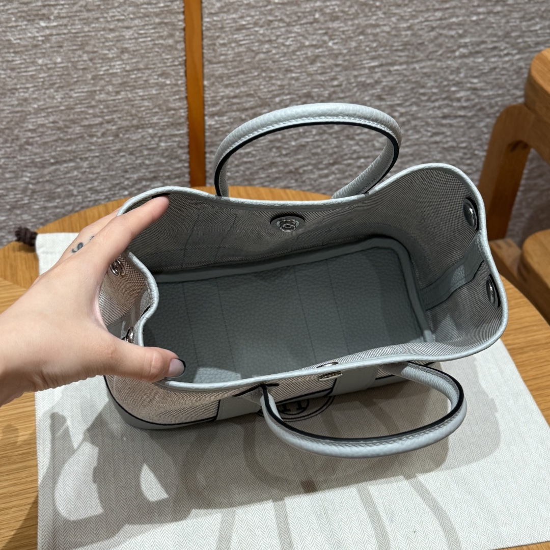 Garden bag 23cm, light beige/glacier blue/misty gray, canvas with NTOGO, French imported original cowhide, silver buckle, fully hand-stitched high-end custom made.