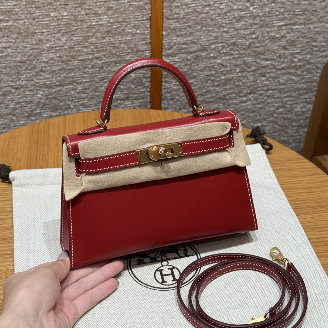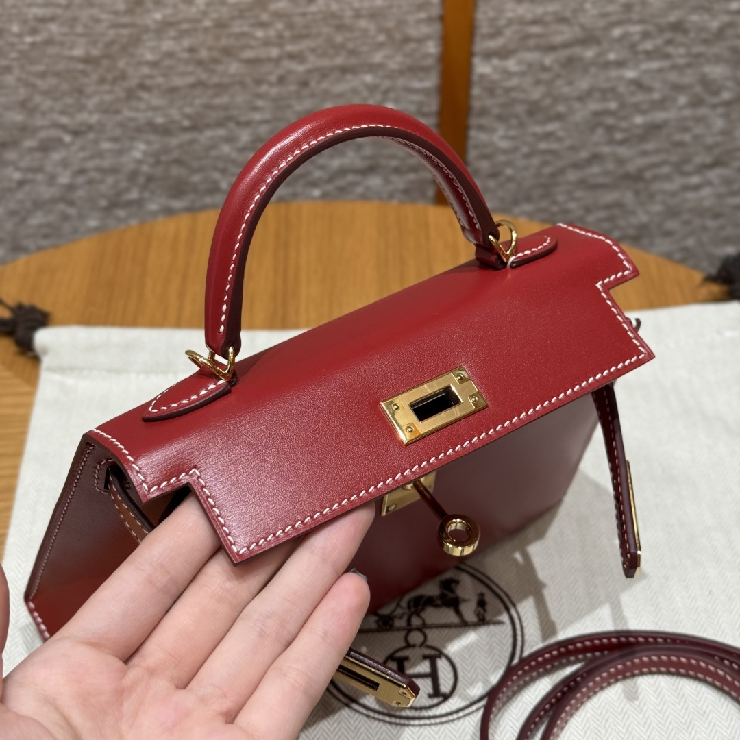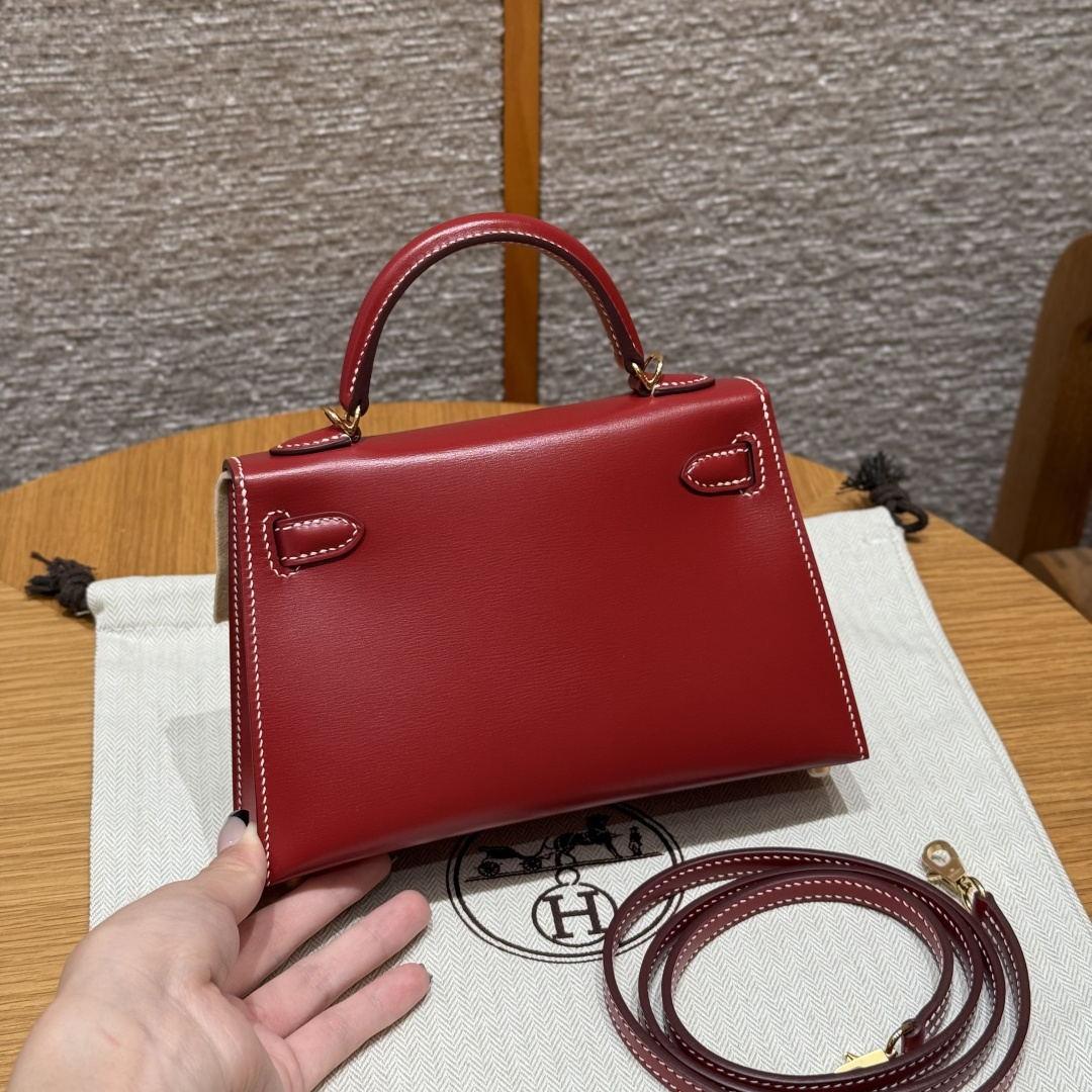 Mini Kelly second generation, chili red - white stitching, box leather, imported original French cowhide, gold clasp, high-end fully handcrafted exclusive customization.