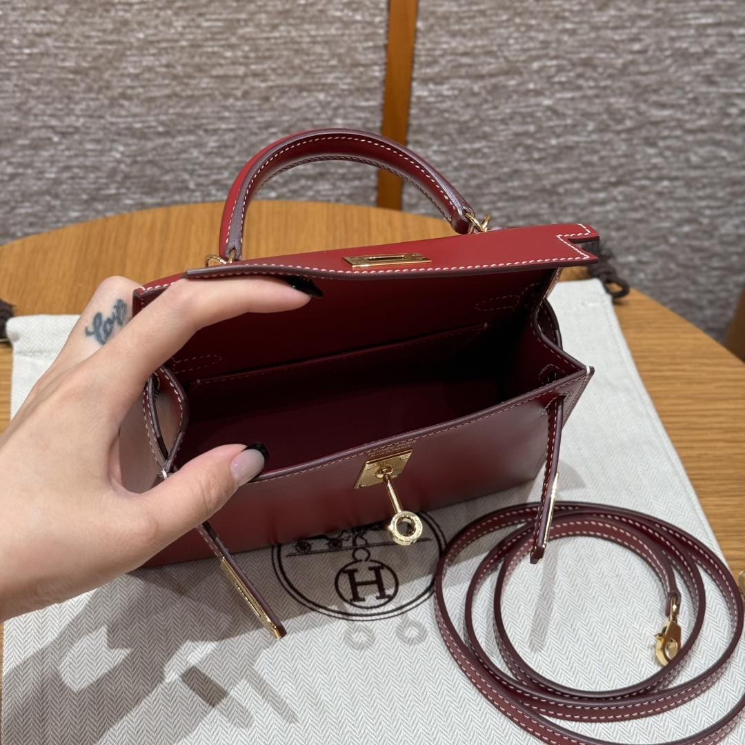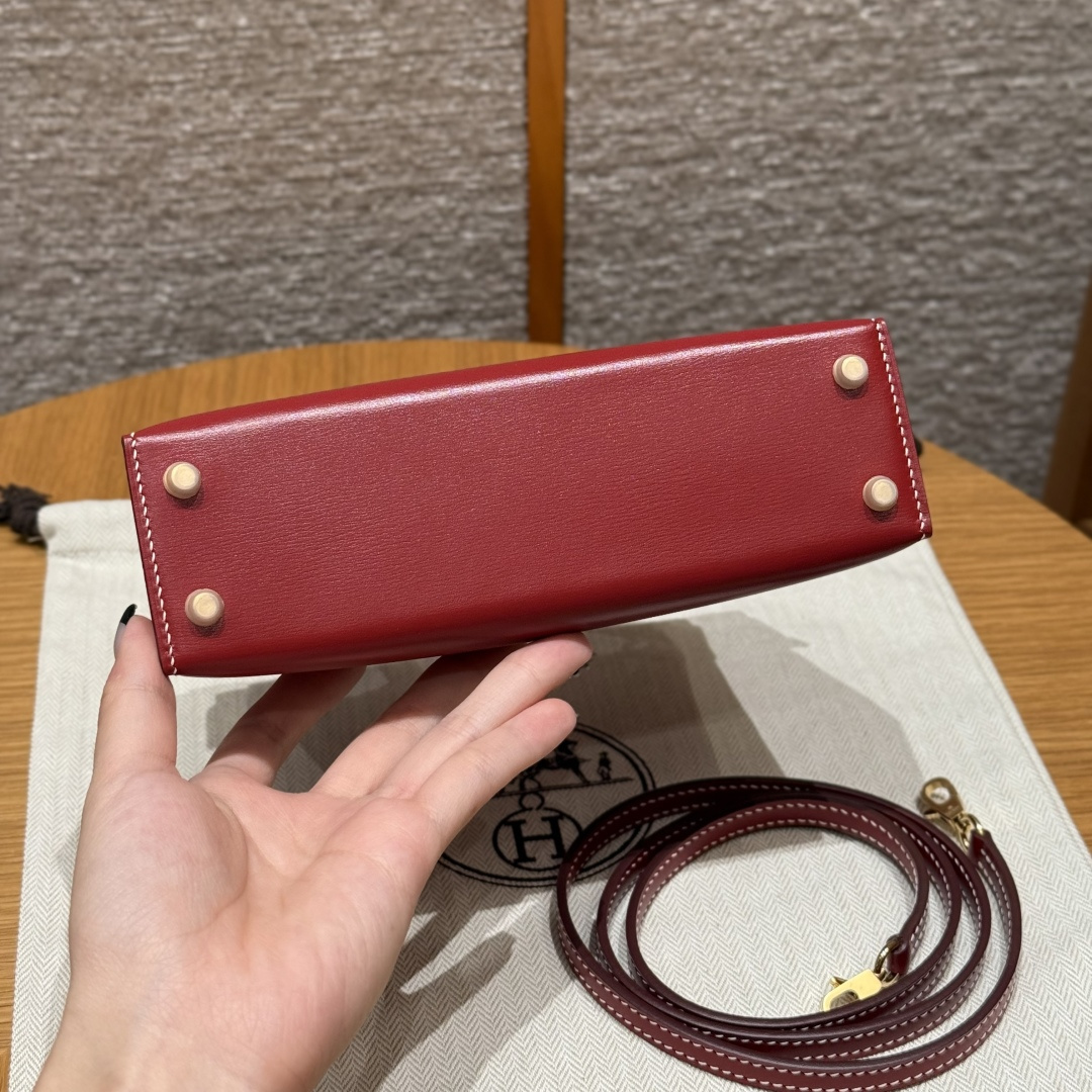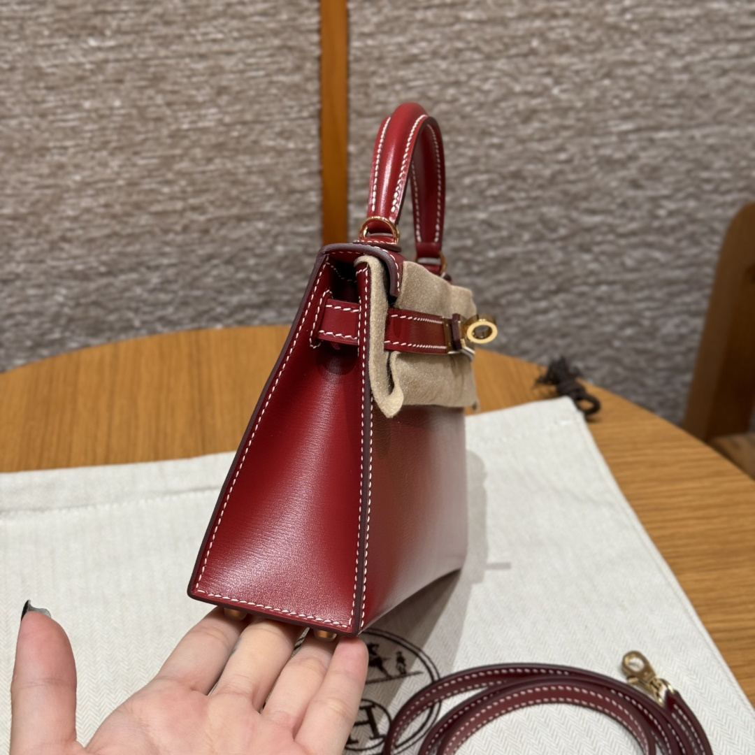 Mini Kelly second generation, chili red - white stitching, box leather, imported original French cowhide, gold clasp, high-end fully handcrafted exclusive customization.