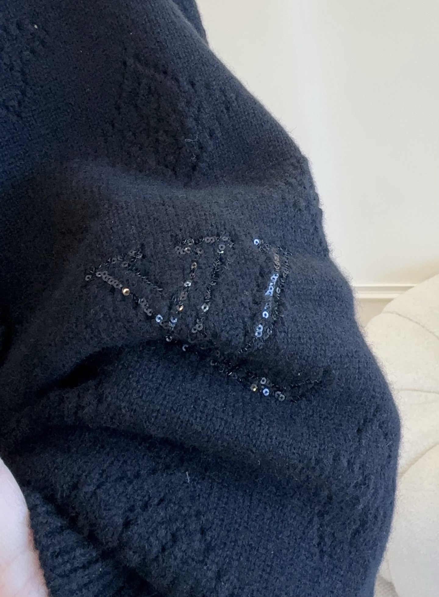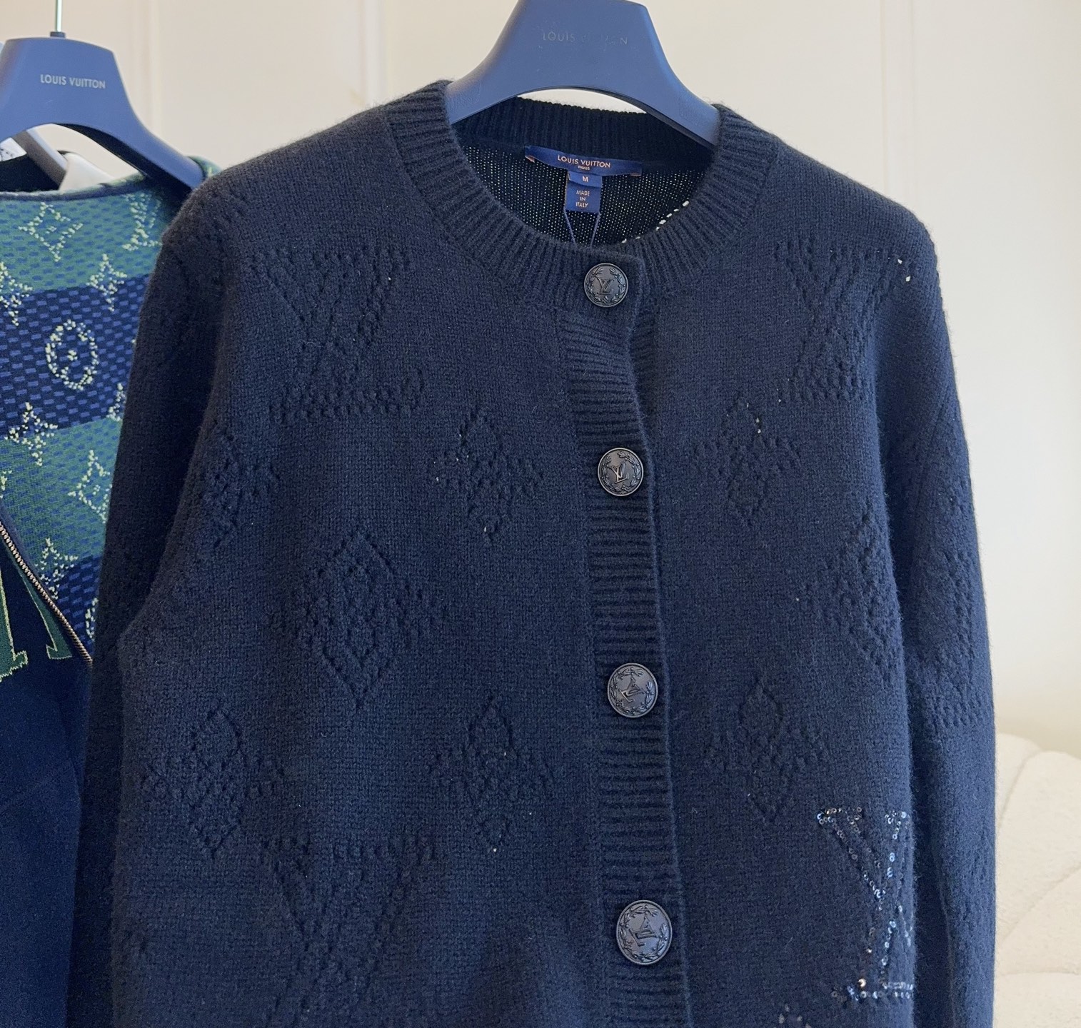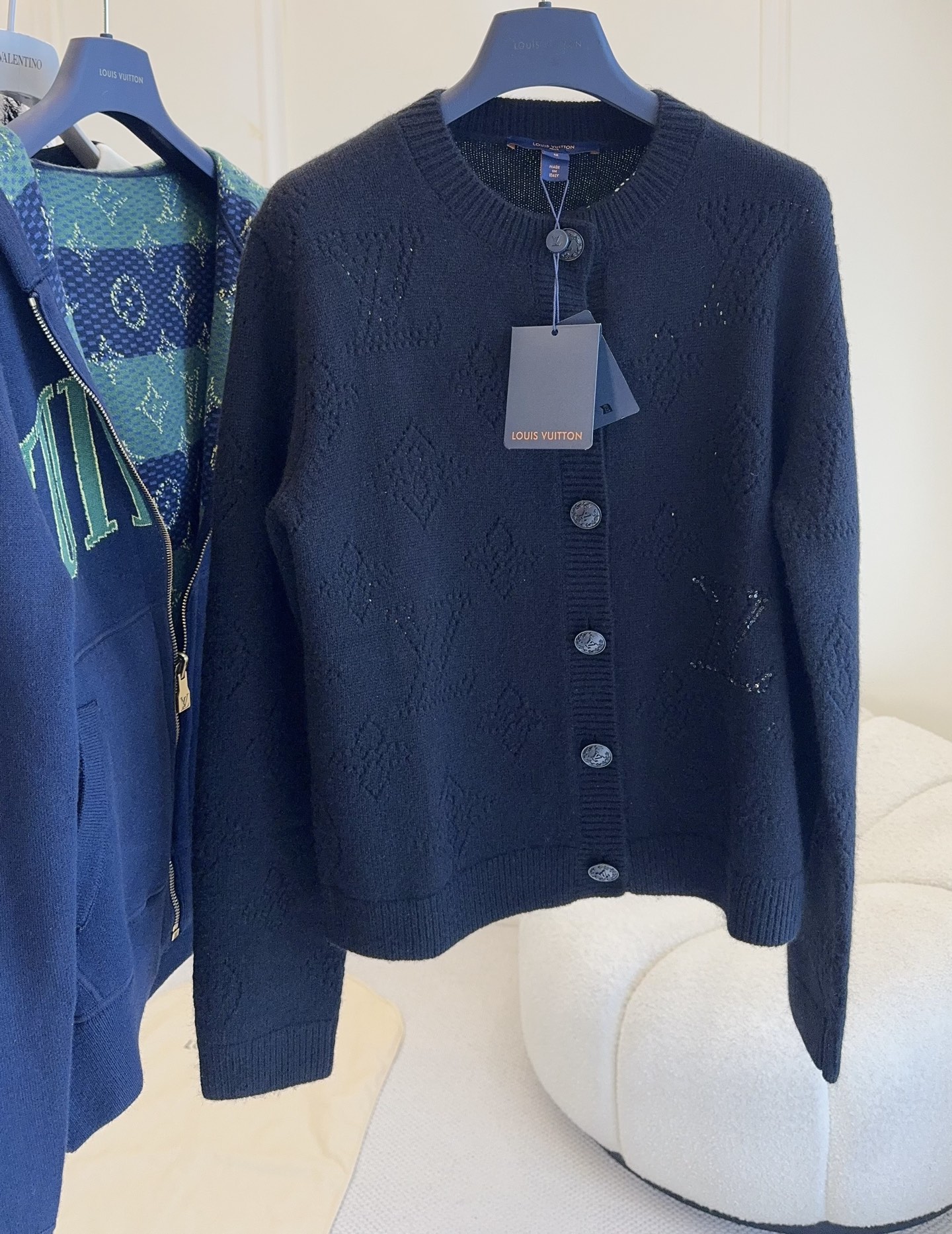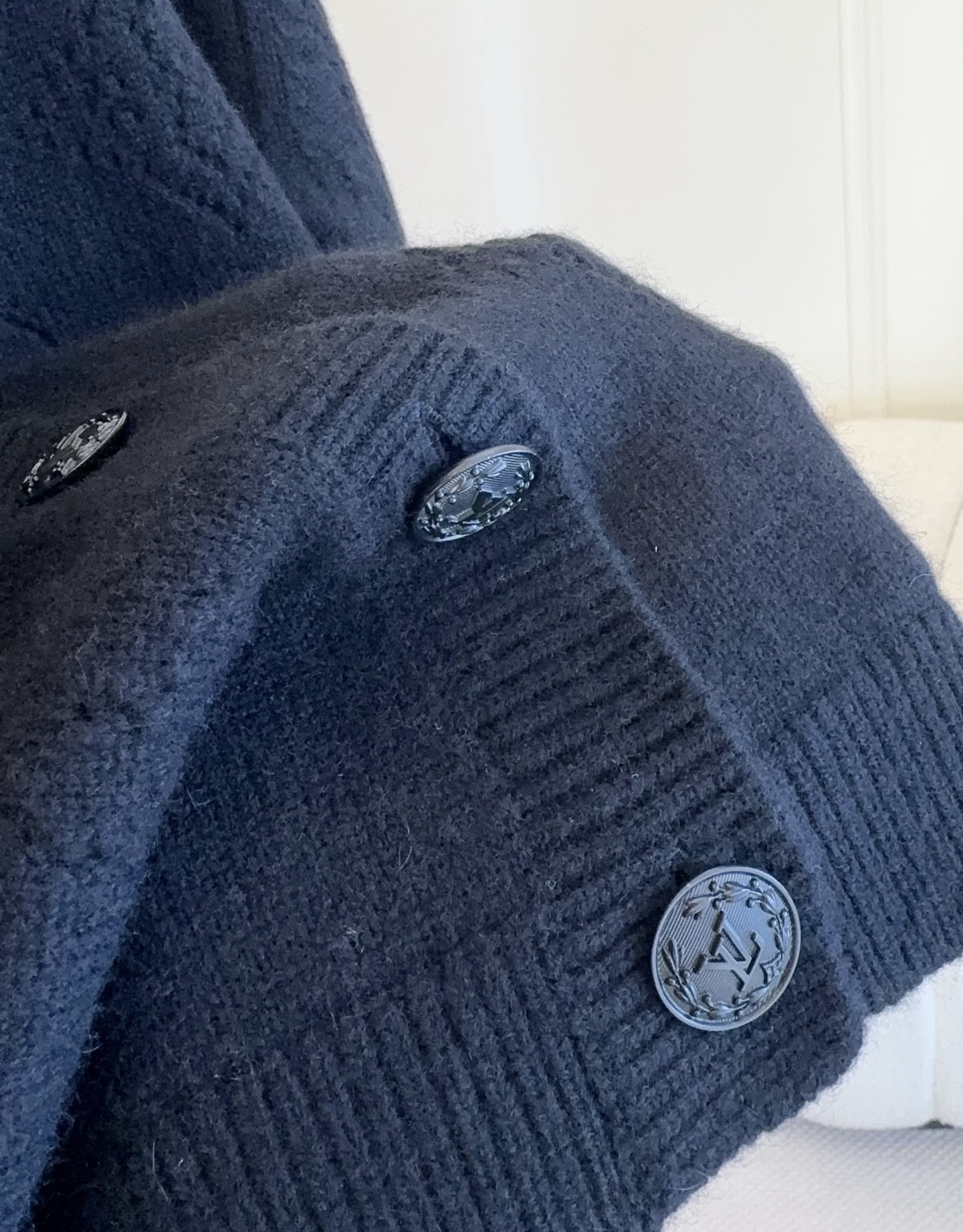 LV 2025 Autumn/Winter new black knitted cardigan, cashmere wool material soft and warm, perfect for autumn and winter wear! Classic round neck + retro buttons, hollowed-out LV logo, low-key and textured design, black versatile, pairs well with light or dark colors, suitable for both commuting and casual wear, daily outfits, comfortable and stylish!