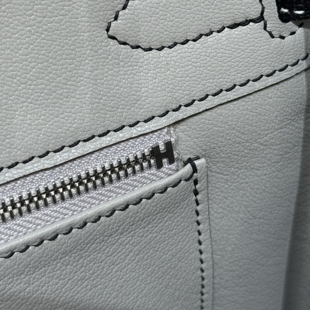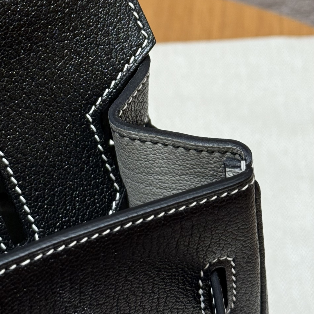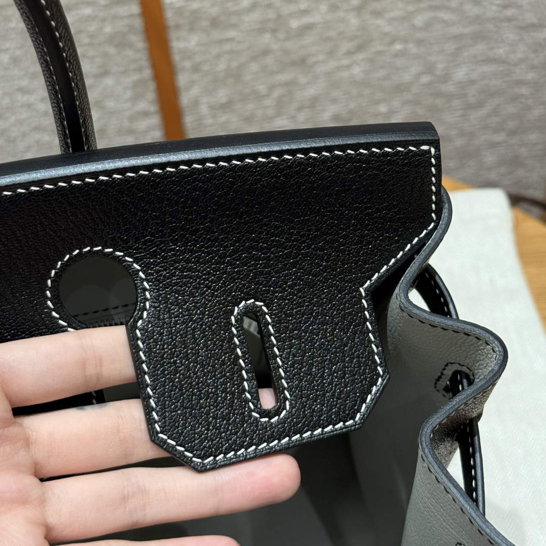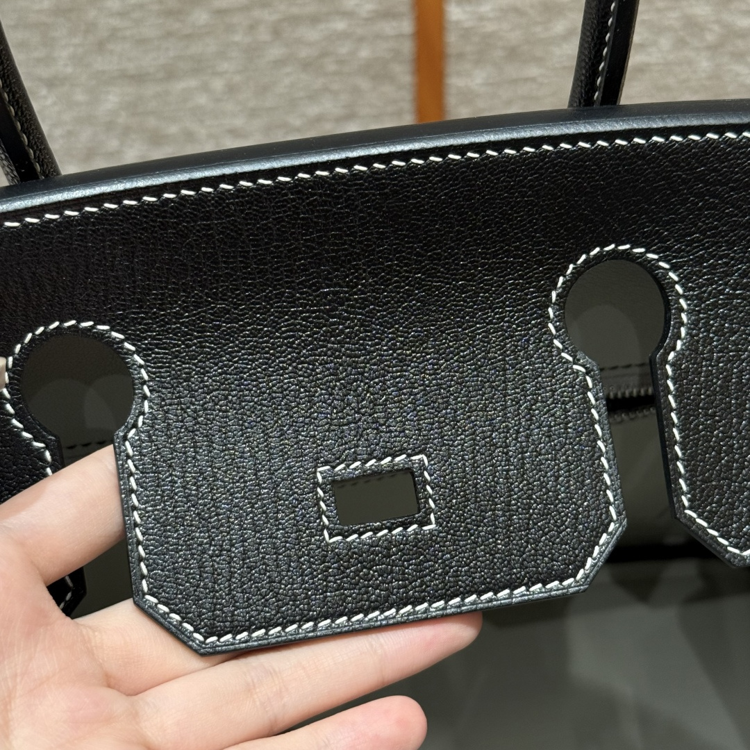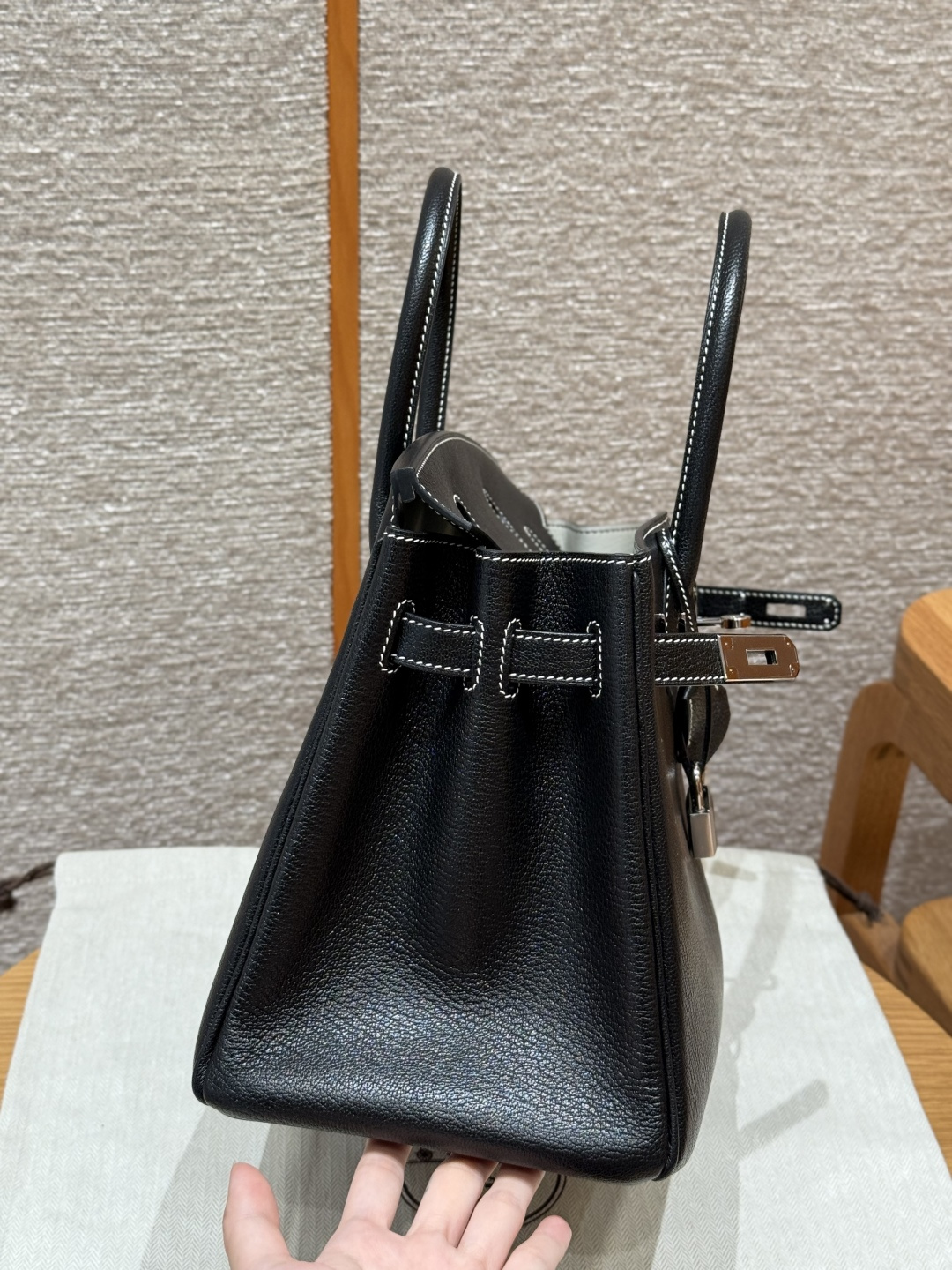 Birkin 30, black with white stitching, interior in pearl gray, imported French goat leather, silver hardware, high-end fully handcrafted exclusive custom-made.