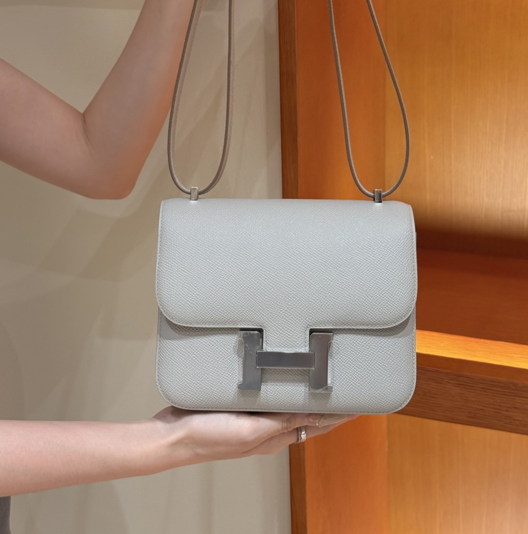 Constance 19cm - Mirror, Pearl Gray, Palm-grain leather, Imported original French cowhide, Silver clasp, High-end fully handcrafted exclusive customization.