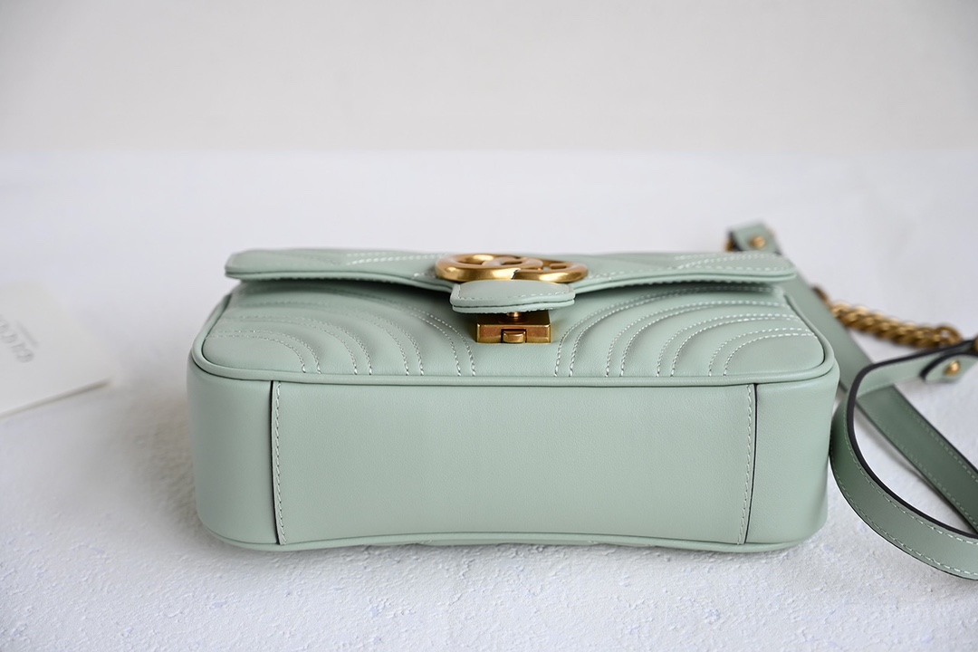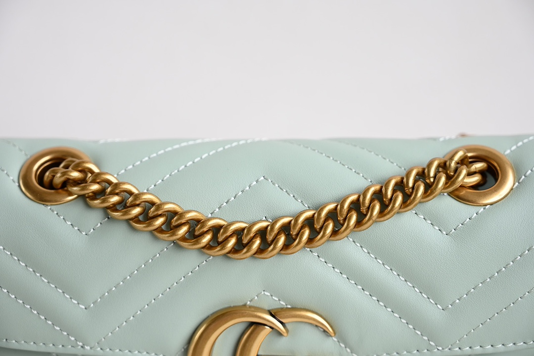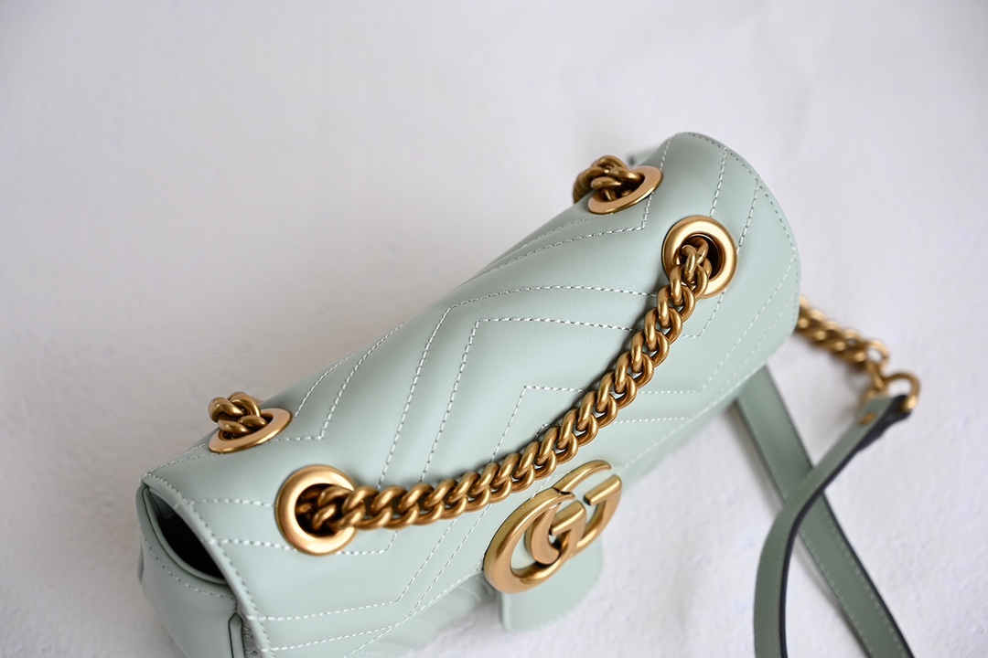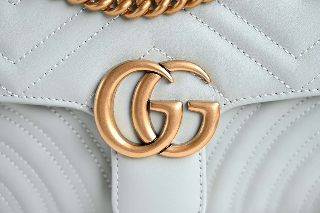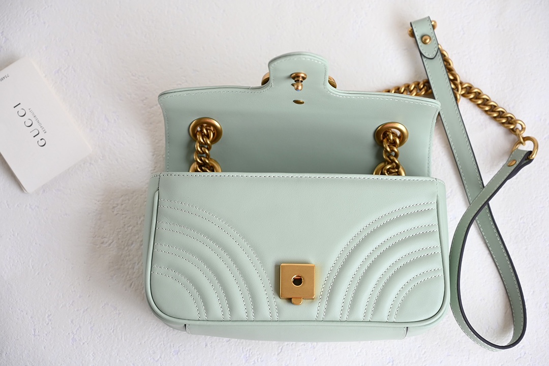 Original Leather [New Product] GG Marmont Series Quilted Mini Handbag. This GG Marmont series mini handbag features a highly recognizable design, a neutral light beige quilted V-shaped leather material, a slightly structured body, a flip-top closure, and is equipped with double G hardware. This handbag incorporates versatile carrying options; simply slide the metal chain to easily switch between a shoulder bag and a handbag. Light beige quilted V-shaped leather, antique gold-toned hardware, suede ultra-fine fiber lining with double G. The sliding chain strap can be used as a shoulder strap (55 cm drop) or a top handle (30 cm drop). It can also be worn as a crossbody bag. Spring buckle flip-top. Weight: approximately 0.6 kg.