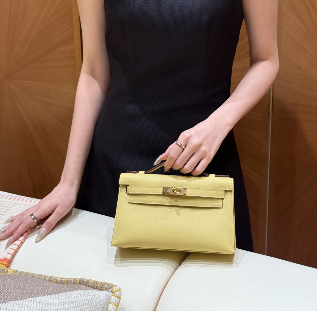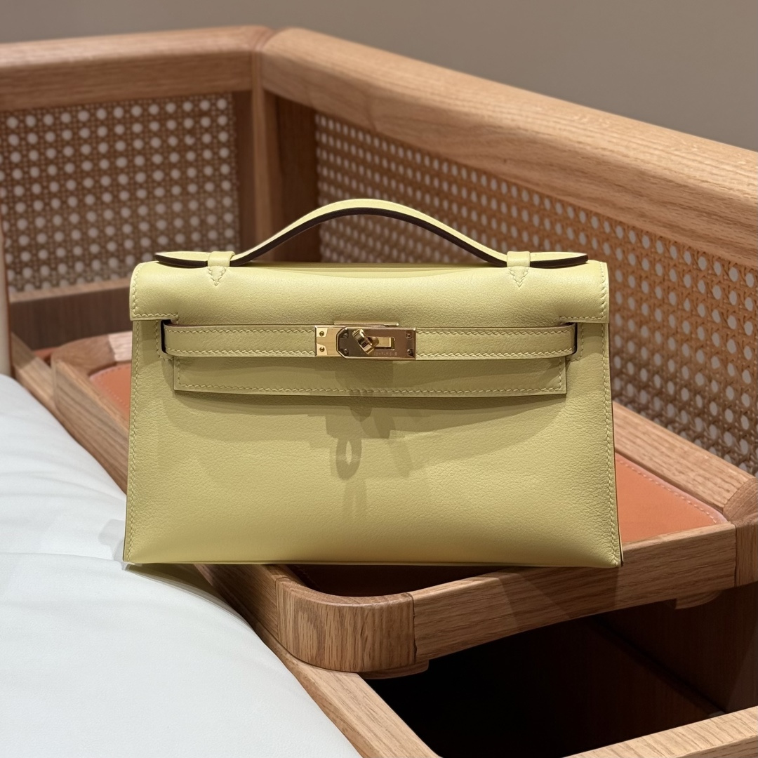 Mini Kelly first generation, chick yellow, plain grain leather, imported original French cowhide, gold clasp, high-end fully handcrafted exclusive customization.