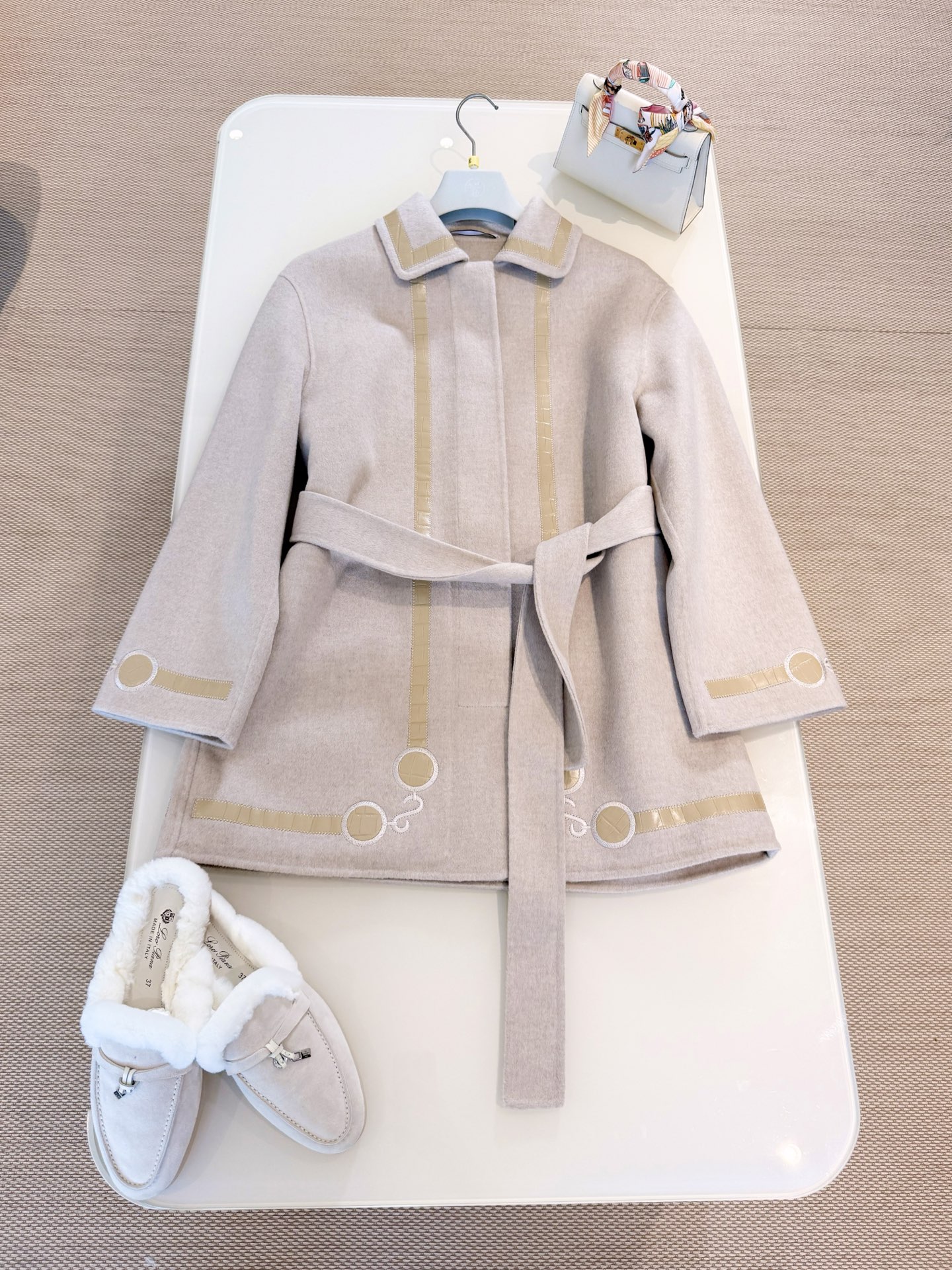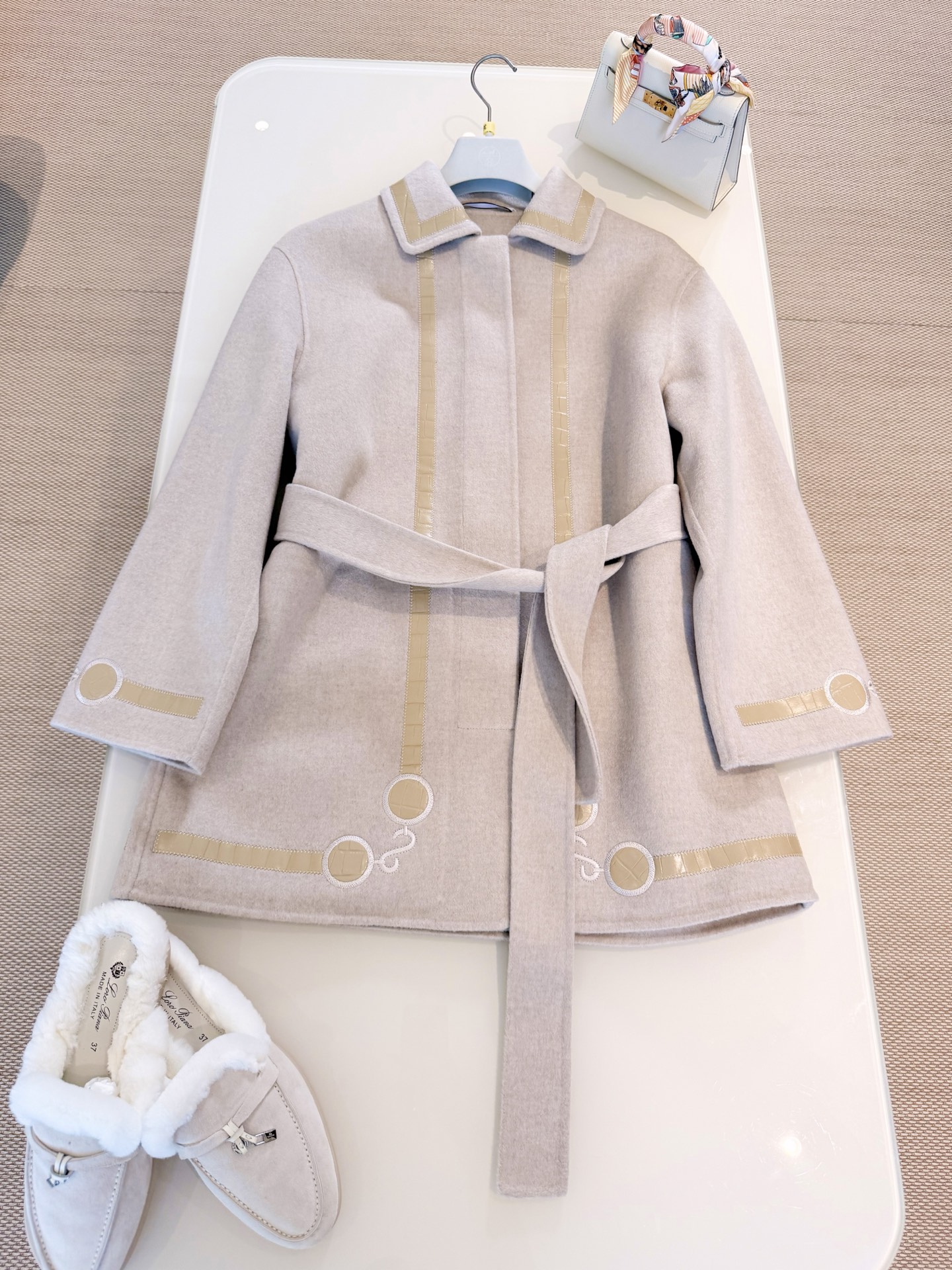 25S Oatmeal Color Crocodile Pattern Embroidered Belt Cashmere Coat
