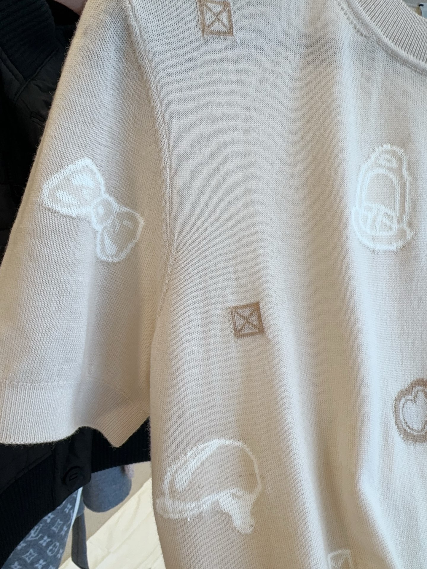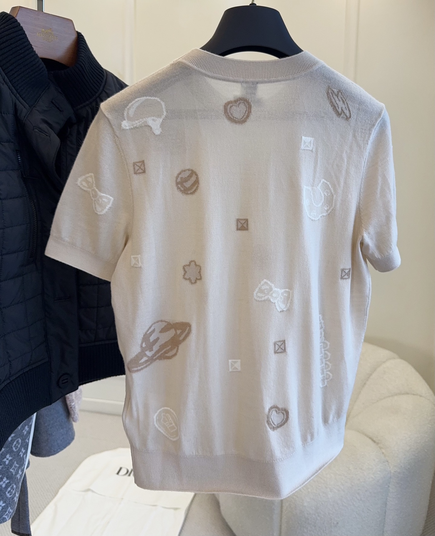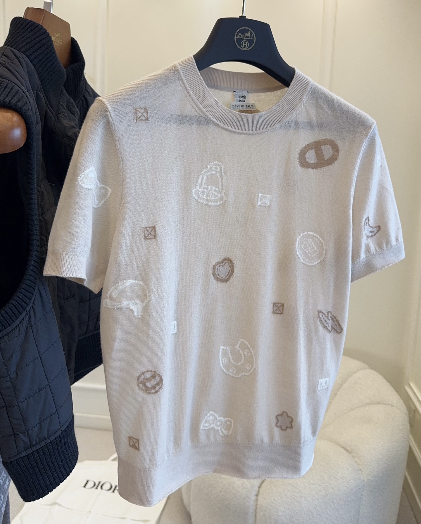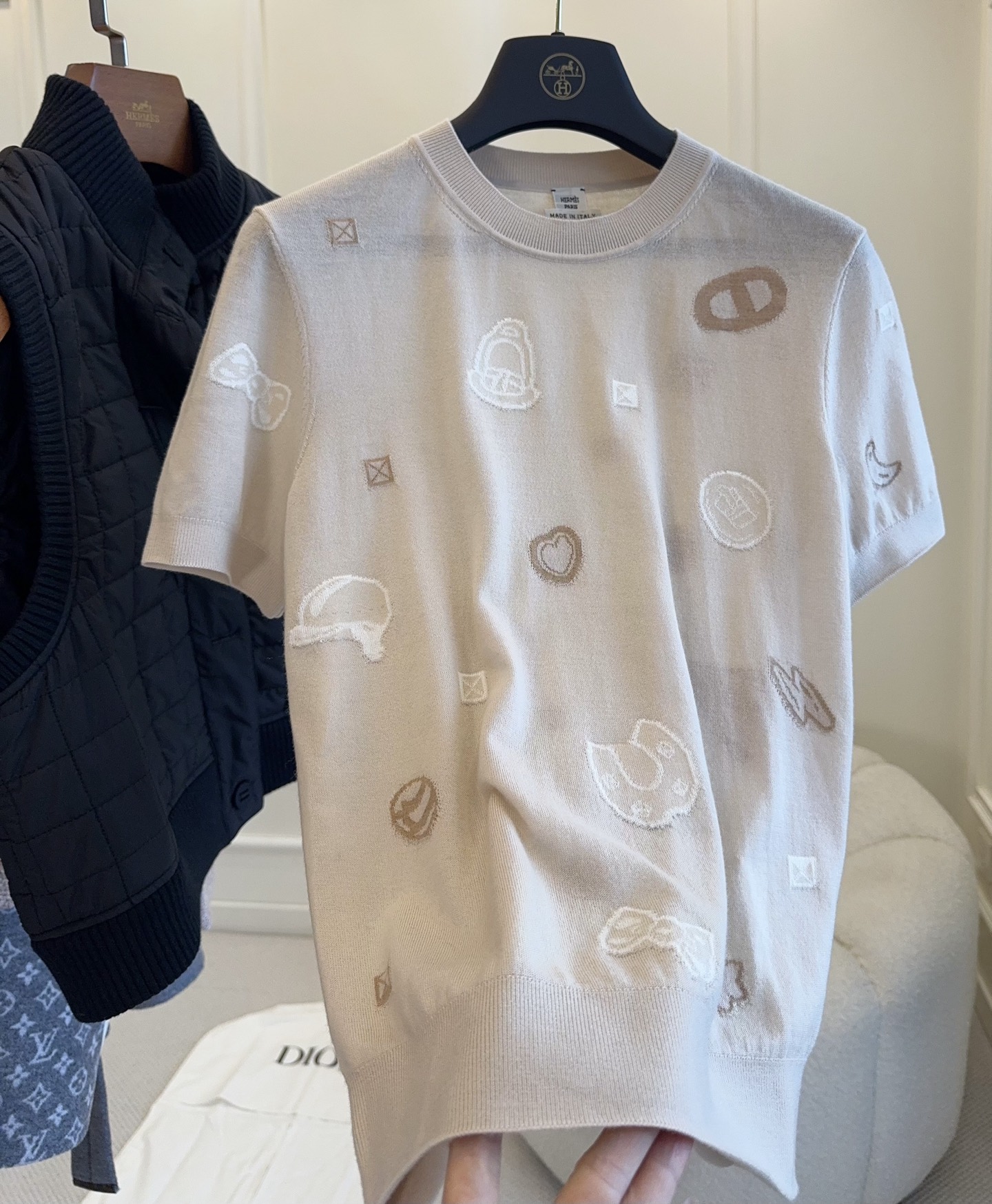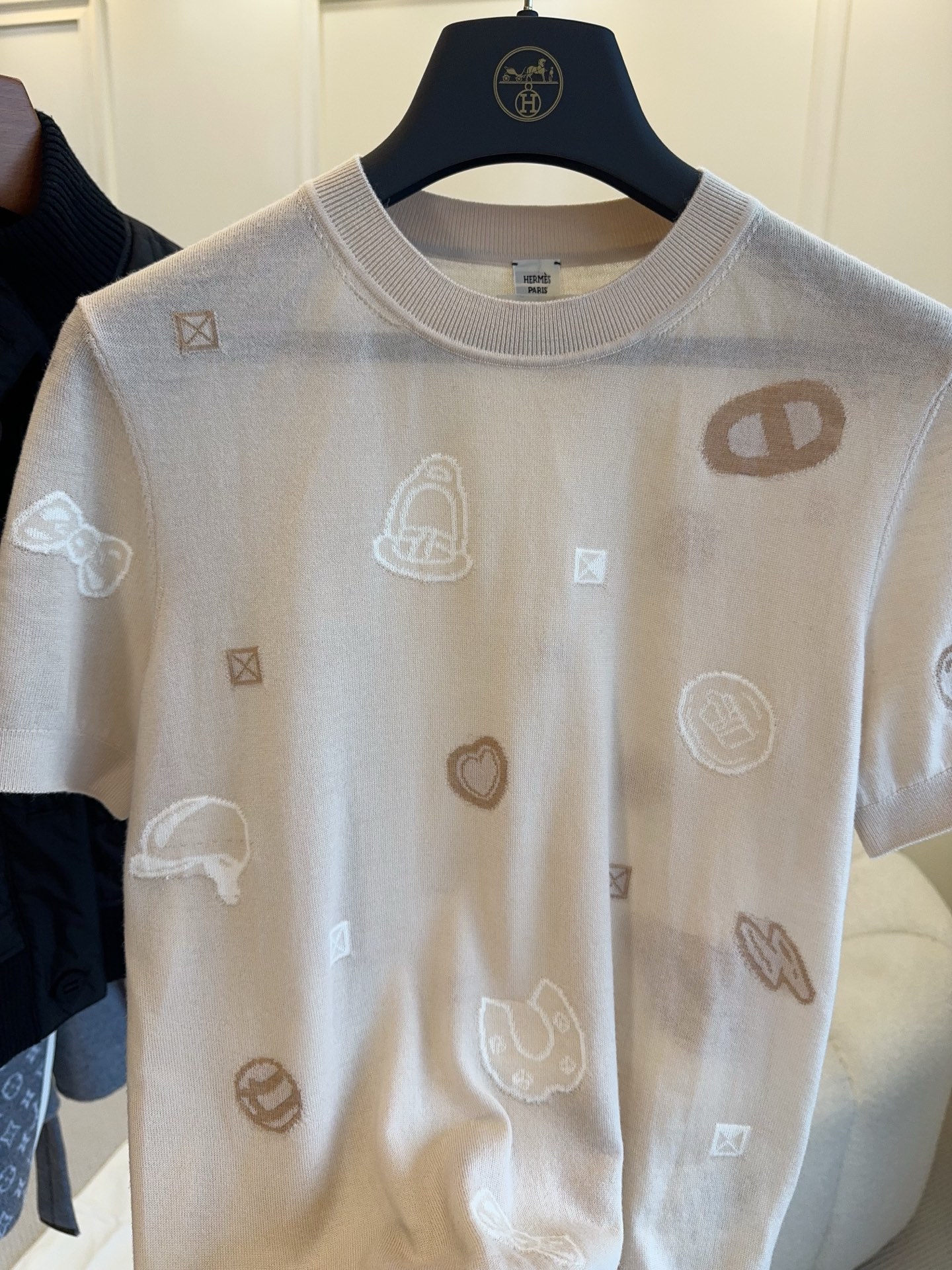 🆕🆕Hermes 2025 early autumn new cashmere jacquard knitted short sleeves, custom dyed ultra-soft fine knitting yarn, soft and smooth hand feel, imported machine jacquard craftsmanship, covered with pig noses, the Ma family's horse hooves, paired with bows, and crescent moons, all the patterns are so cute, instantly youthful, simple and elegant style, gentle milk tea color, looks classic and sophisticated when worn!