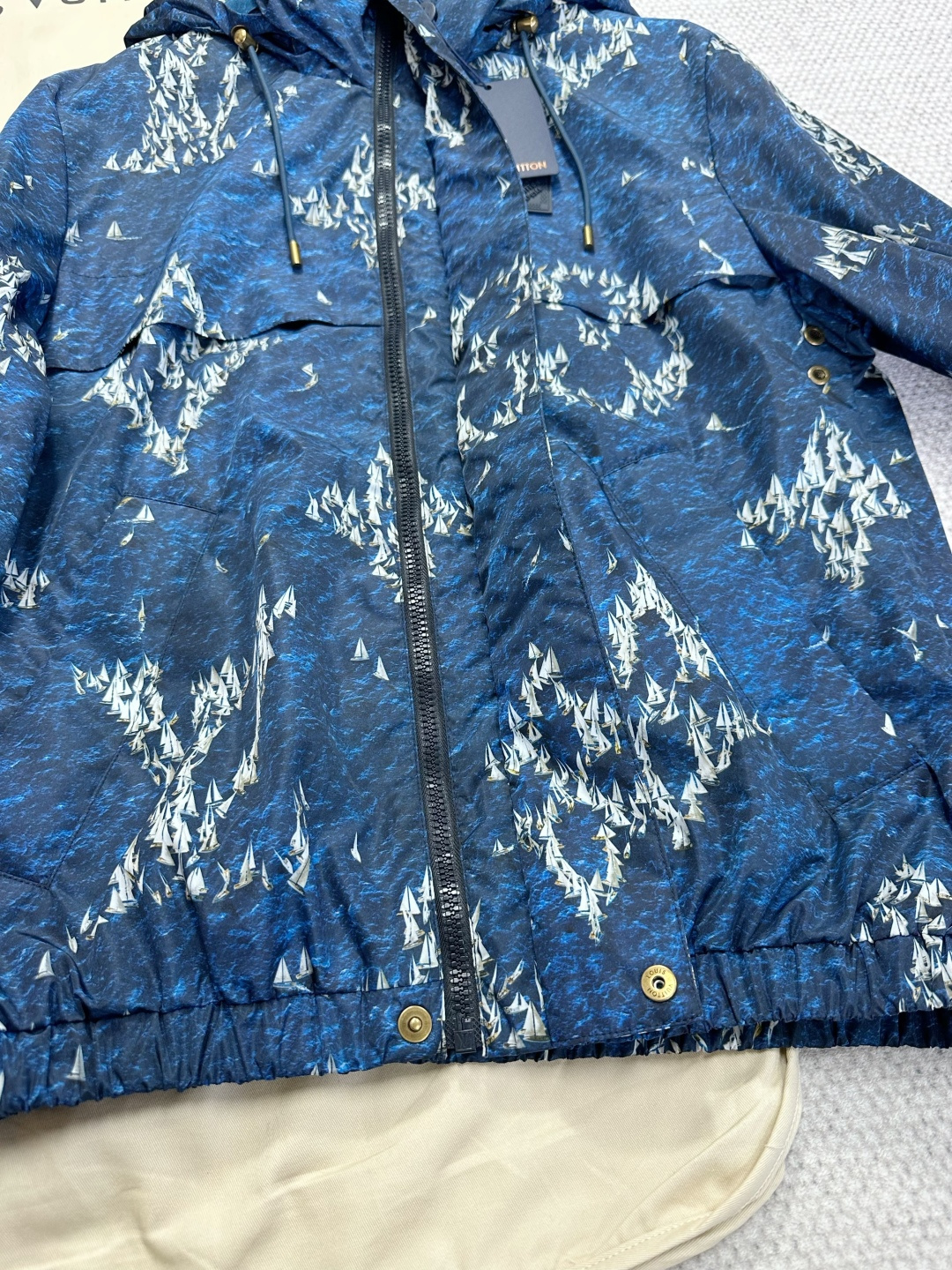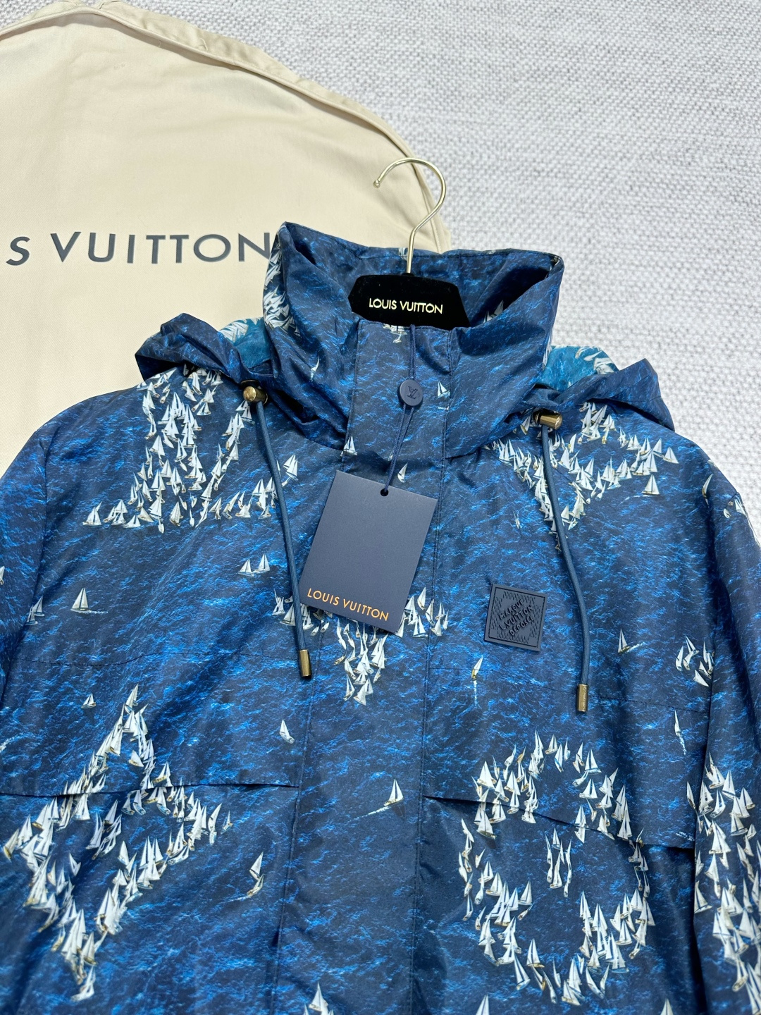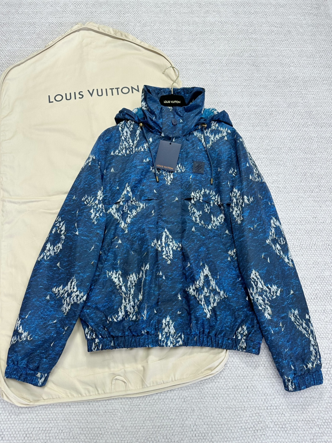 L*V printed windproof jacket. ZP adjustment print adjustment three months. Visible difficulty level. This windproof jacket is made of lightweight technical fabric with digital acid direct printing, the same print as the original, durable and will not fade. The market uses heat transfer printing; this kind of printing is fine when first worn but will fade after a while. Moreover, acid printing has extremely high requirements for the fabric; not all fabrics can be printed. So the fabric is different, and the details are even more different. Marque L.Vuitton Déposée rubber appliqué adorns the chest, adjustable hood can be conveniently tucked into the collar. Lightweight waterproof technical fabric conveys a dynamic style, paired with a hood; the hood can be folded into the collar. Zippered front, elastic cuffs and hem. 44 46 48