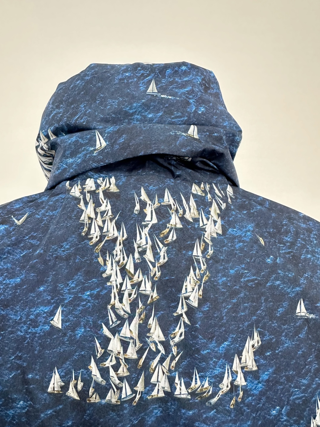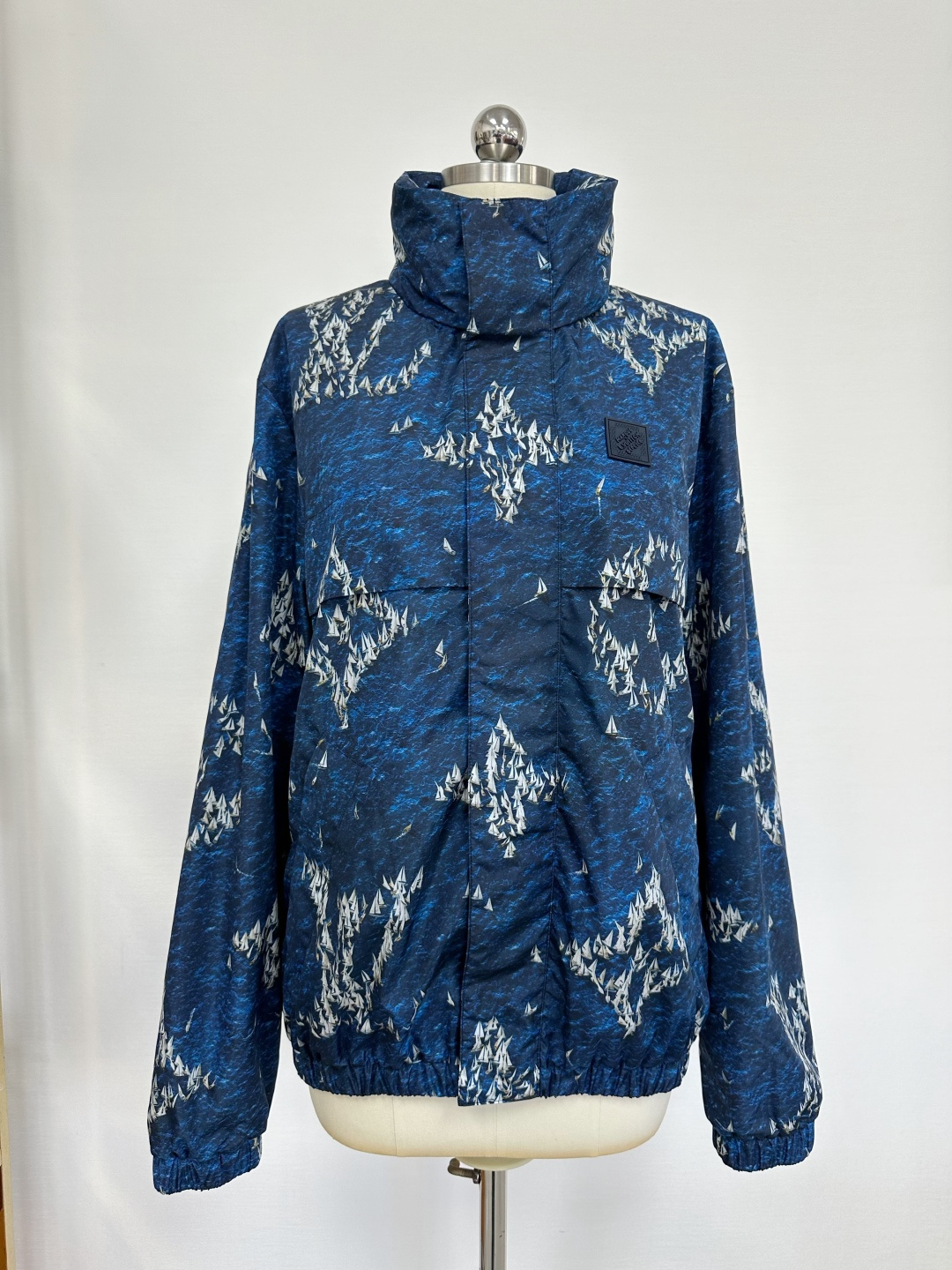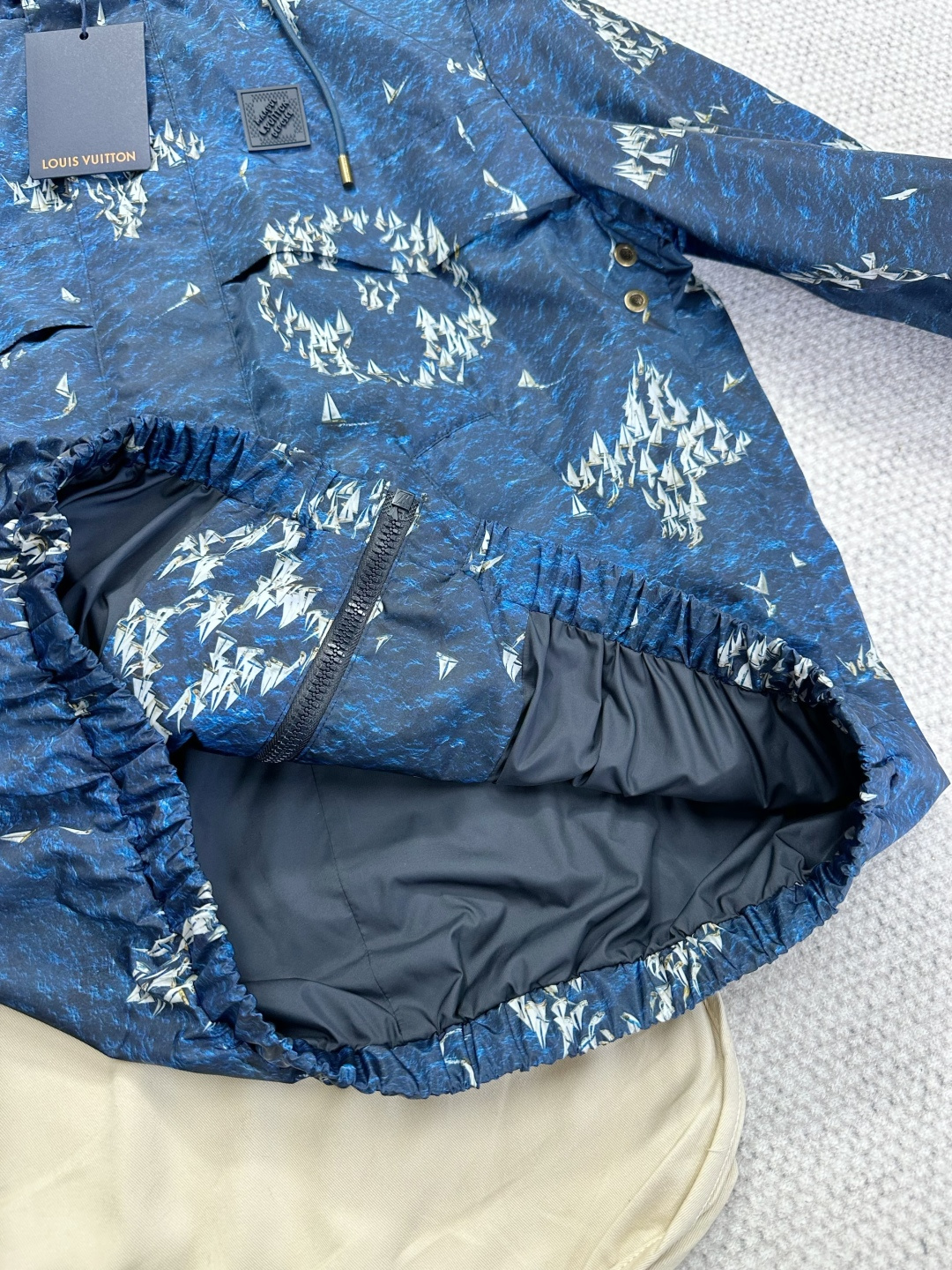 L*V printed windproof jacket. ZP adjustment print adjustment three months. Visible difficulty level. This windproof jacket is made of lightweight technical fabric with digital acid direct printing, the same print as the original, durable and will not fade. The market uses heat transfer printing; this kind of printing is fine when first worn but will fade after a while. Moreover, acid printing has extremely high requirements for the fabric; not all fabrics can be printed. So the fabric is different, and the details are even more different. Marque L.Vuitton Déposée rubber appliqué adorns the chest, adjustable hood can be conveniently tucked into the collar. Lightweight waterproof technical fabric conveys a dynamic style, paired with a hood; the hood can be folded into the collar. Zippered front, elastic cuffs and hem. 44 46 48