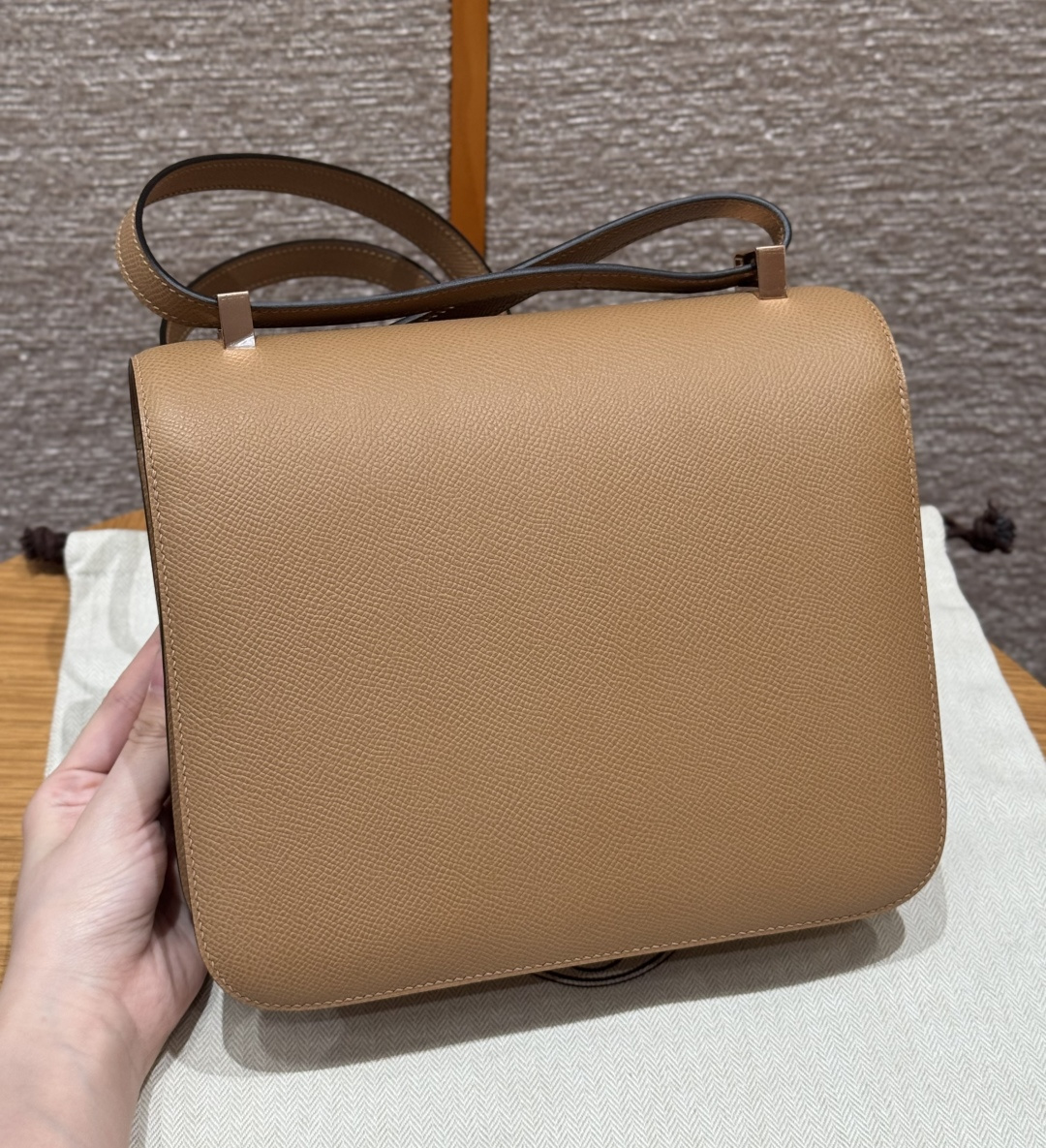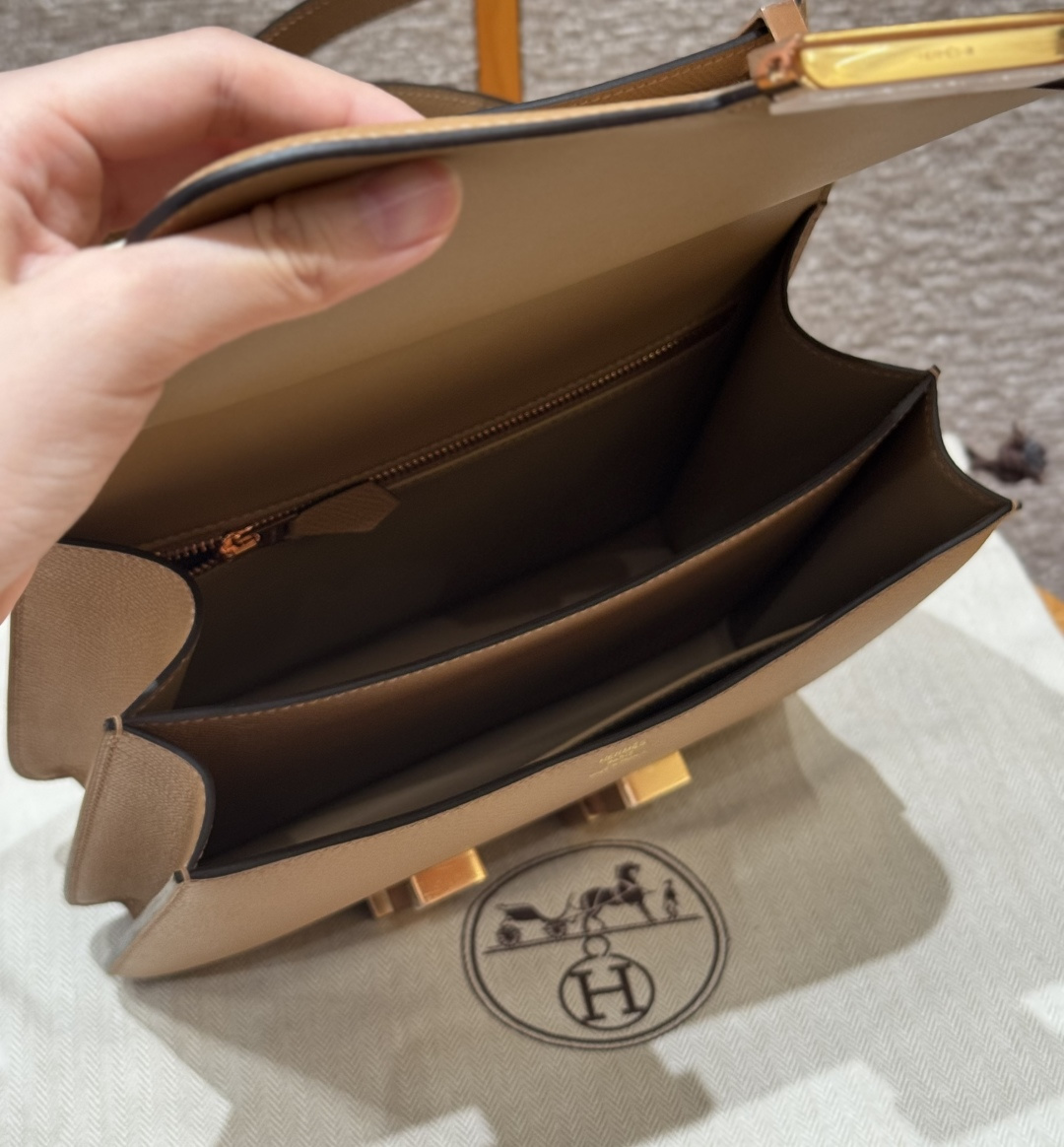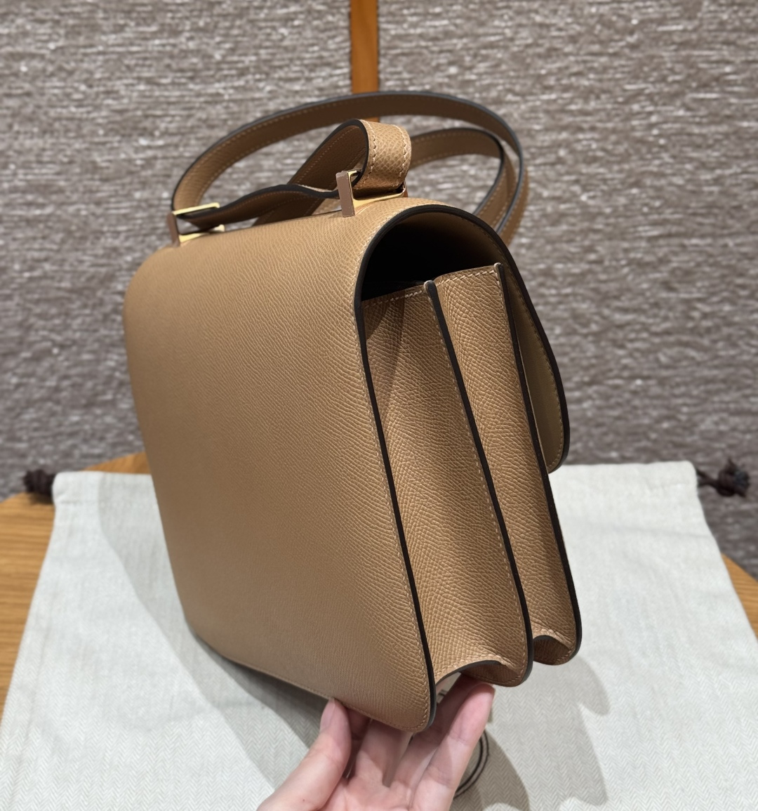 Constance 24cm, Chai color, French imported original factory vealer calfskin, rose gold buckle, high-end fully handcrafted exclusive custom.
