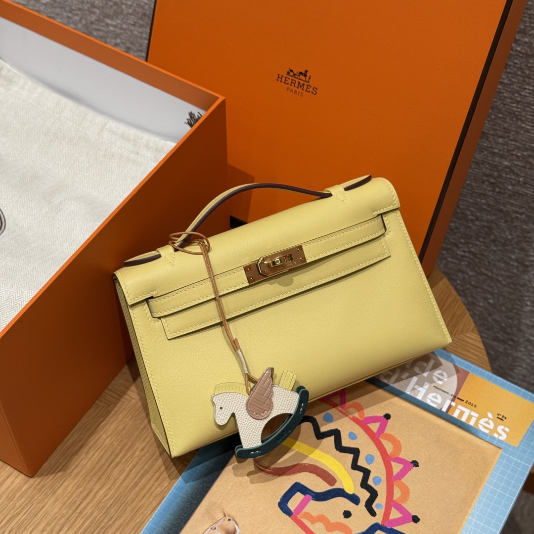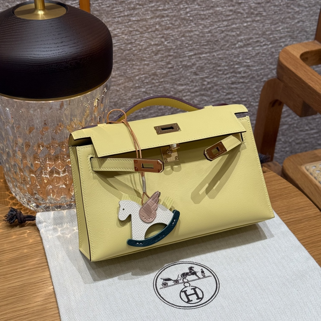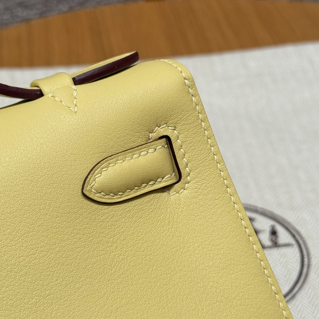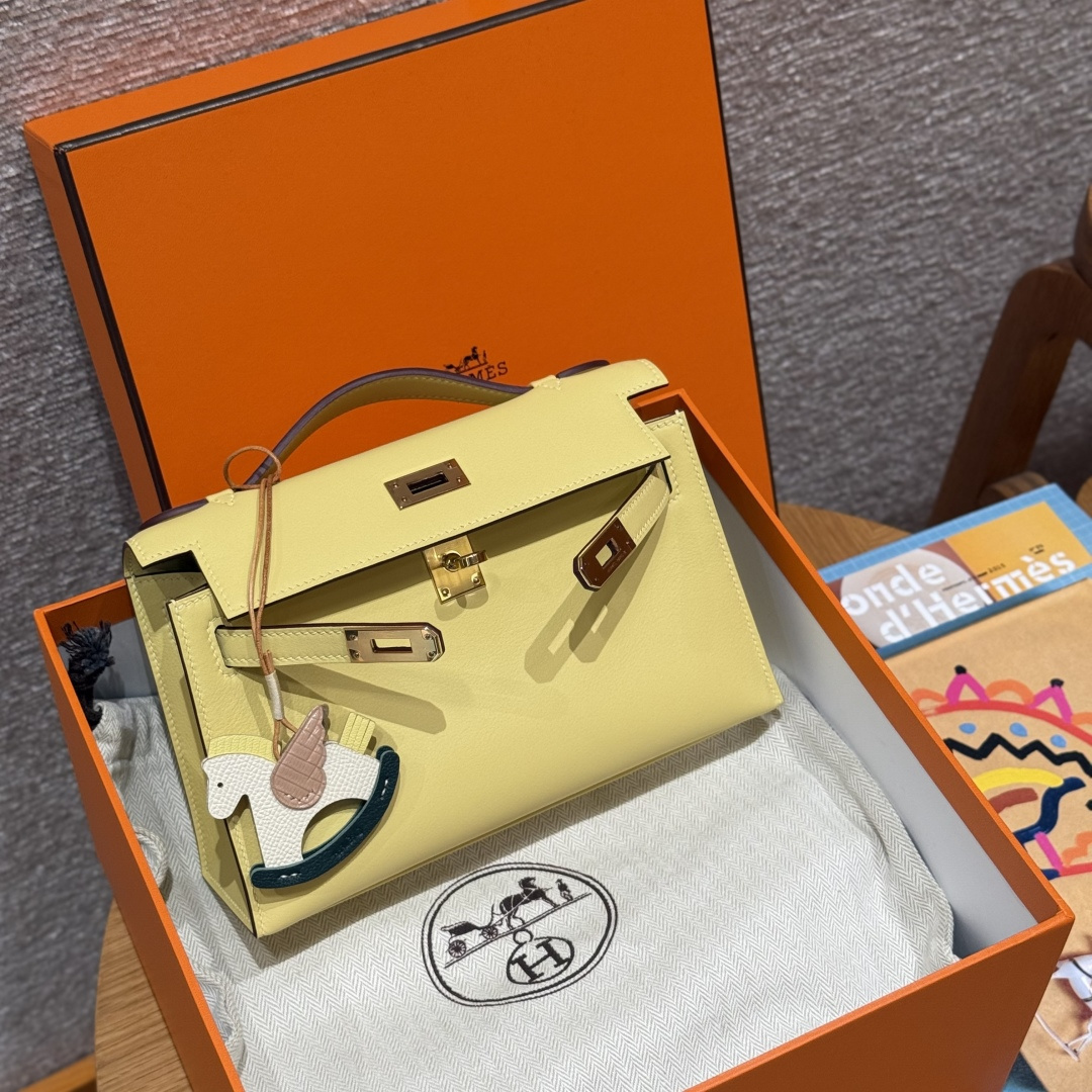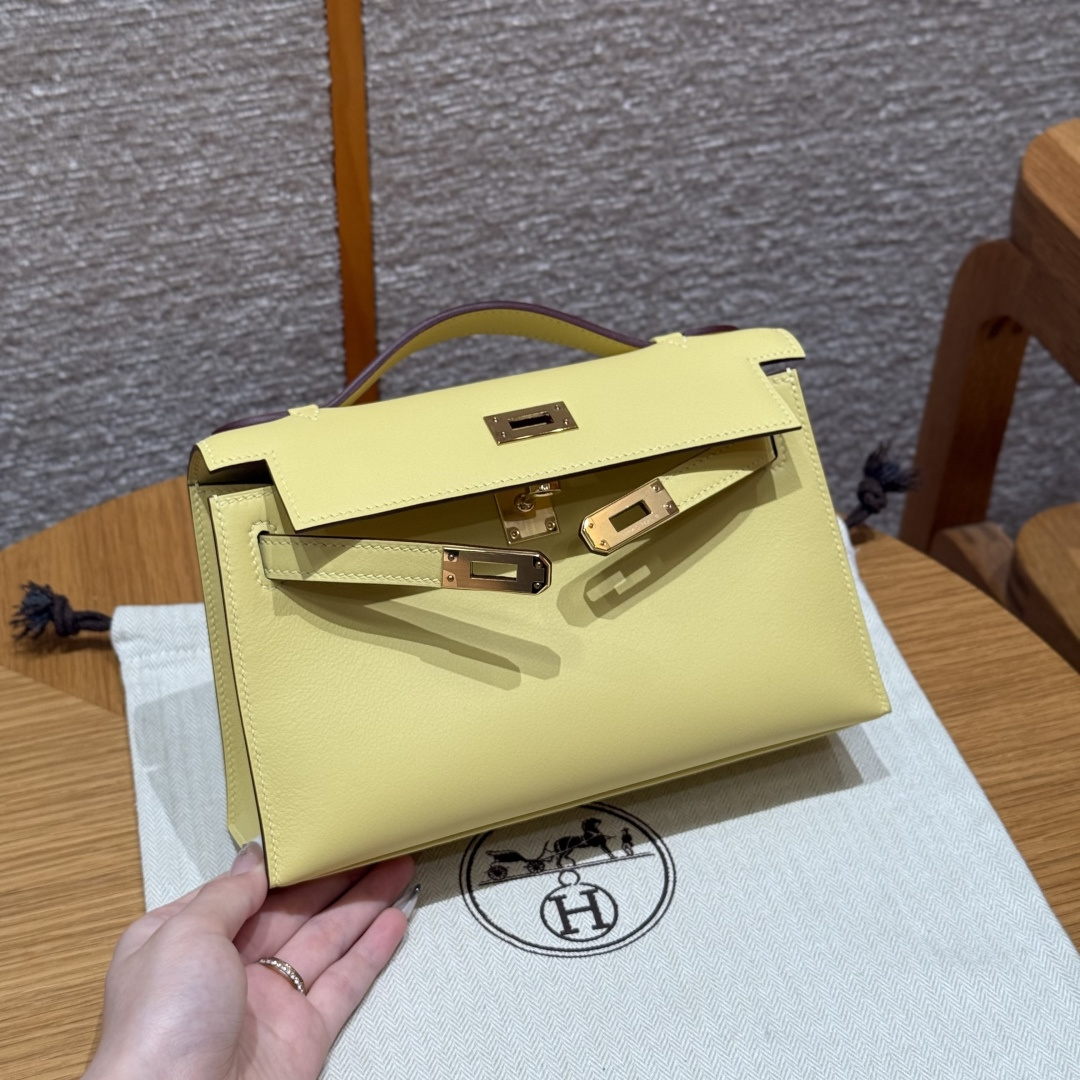 Mini Kelly first generation, chick yellow, plain grain leather, imported original French cowhide, gold clasp, high-end fully handcrafted exclusive customization.