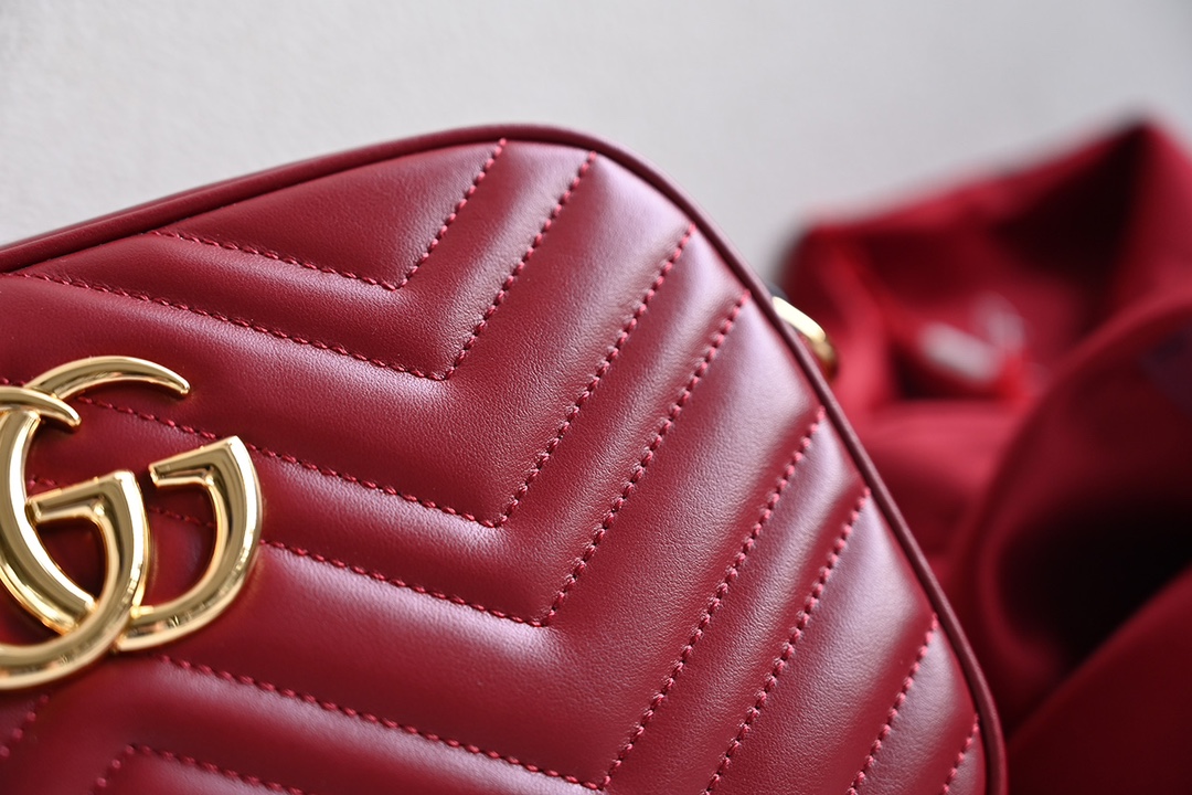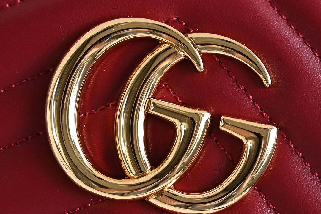 Original Leather [New Product] GG Marmont Small Quilted Shoulder Bag. The GG Marmont chain-strap mini shoulder bag features a structured yet soft shape with an oversized flap closure and double G metal hardware. The sliding chain shoulder strap allows for versatile wearing styles, easily switching between shoulder carry and handheld. It is crafted from chevron-quilted leather with a GG logo on the back. Burgundy chevron-quilted V-shaped leather, vintage gold-tone metal double G hardware, open interior pocket, adjustable chain shoulder strap (60 cm drop). Can also be worn as a crossbody bag. Zipper closure with an extended zipper pull. Weight: approx. 0.394 kg.
