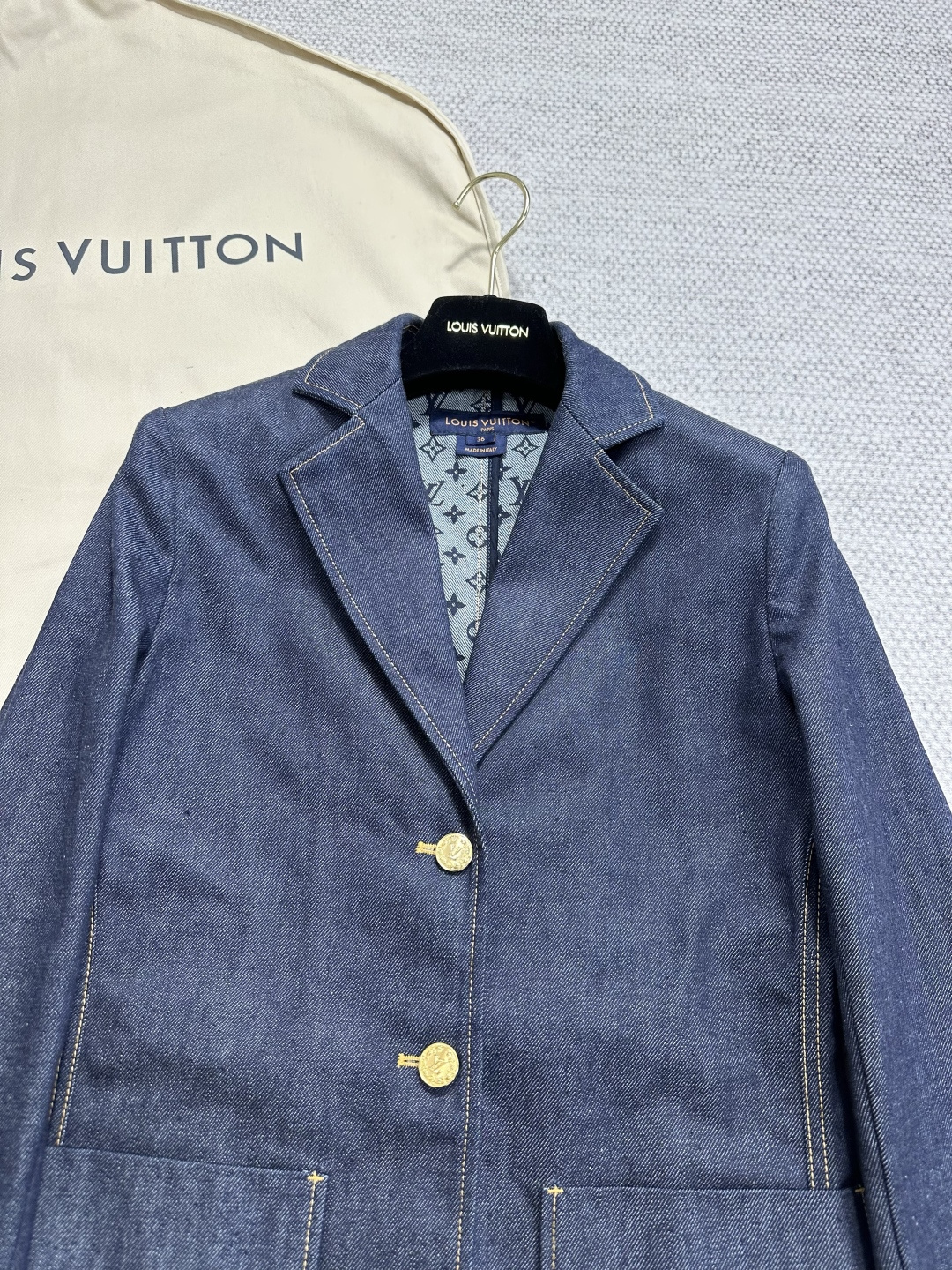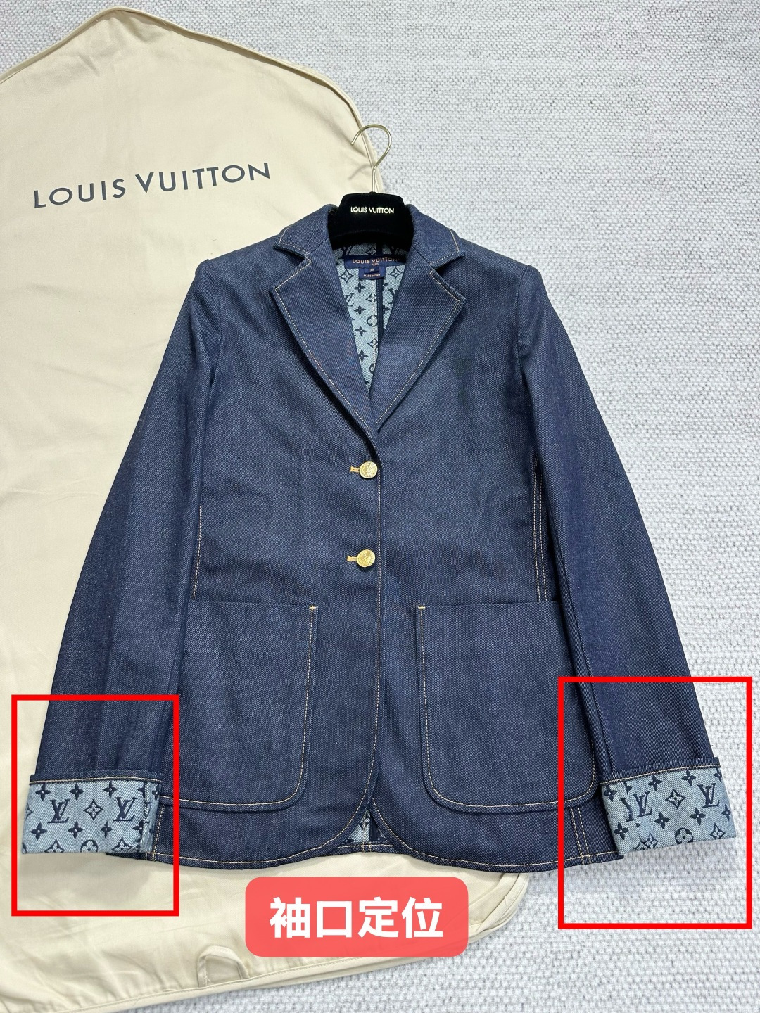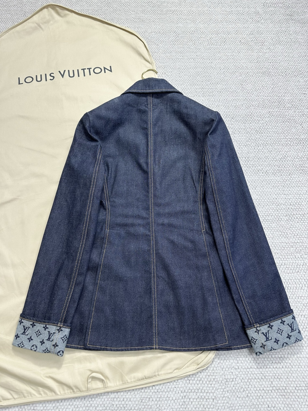 LL Turn-up Hem Denim Jacket, ZP. This collegiate-style blazer jacket exudes a relaxed vibe. It is tailored from seasonally deep-washed denim into a sharp silhouette, featuring a notch lapel, large patch pockets, and eye-catching buttons. Flipping up the cuffs reveals the classic Monogram pattern. Moreover, this style does not require washing, and the customized color is almost identical to the authentic one. Check the comparison images. Can be paired with matching denim jeans. 36 38 40