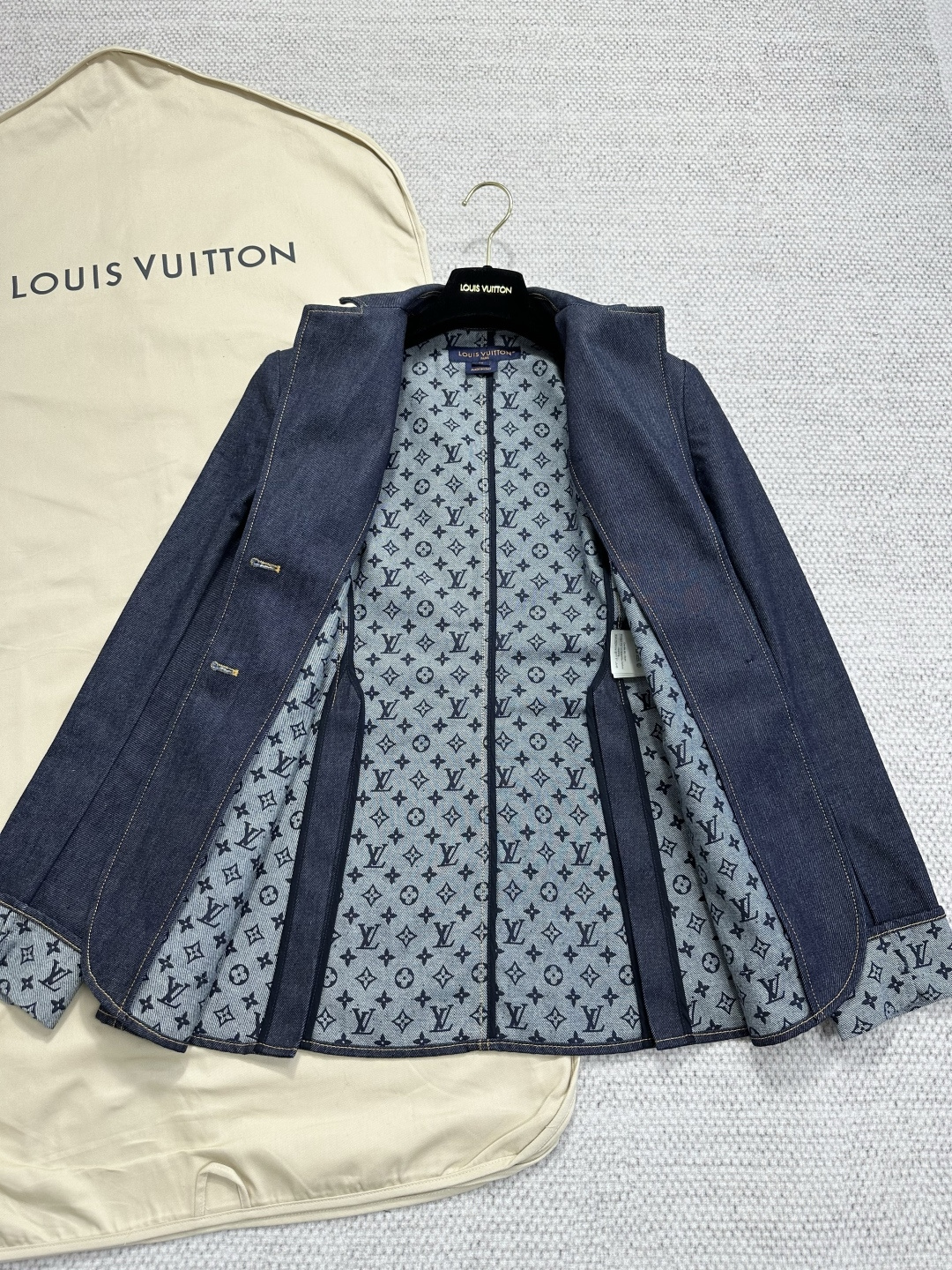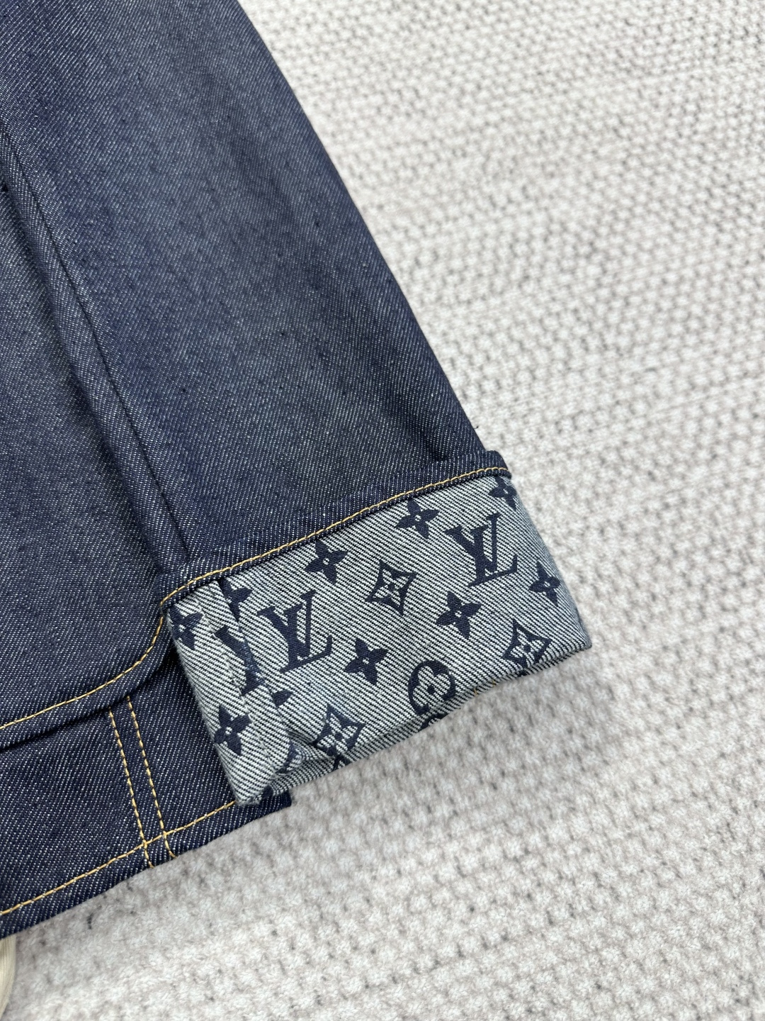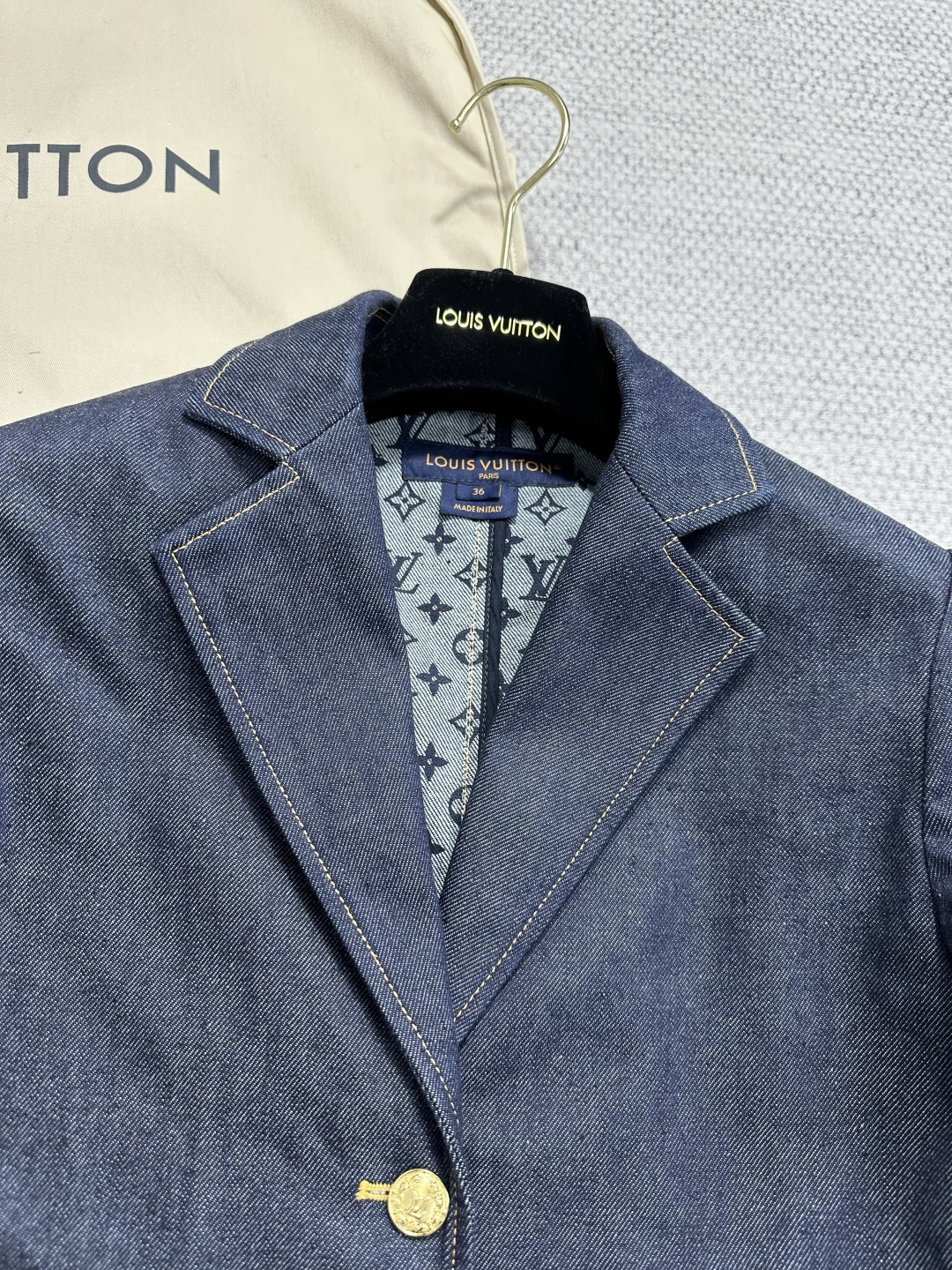 LL Turn-up Hem Denim Jacket, ZP. This collegiate-style blazer jacket exudes a relaxed vibe. It is tailored from seasonally deep-washed denim into a sharp silhouette, featuring a notch lapel, large patch pockets, and eye-catching buttons. Flipping up the cuffs reveals the classic Monogram pattern. Moreover, this style does not require washing, and the customized color is almost identical to the authentic one. Check the comparison images. Can be paired with matching denim jeans. 36 38 40
