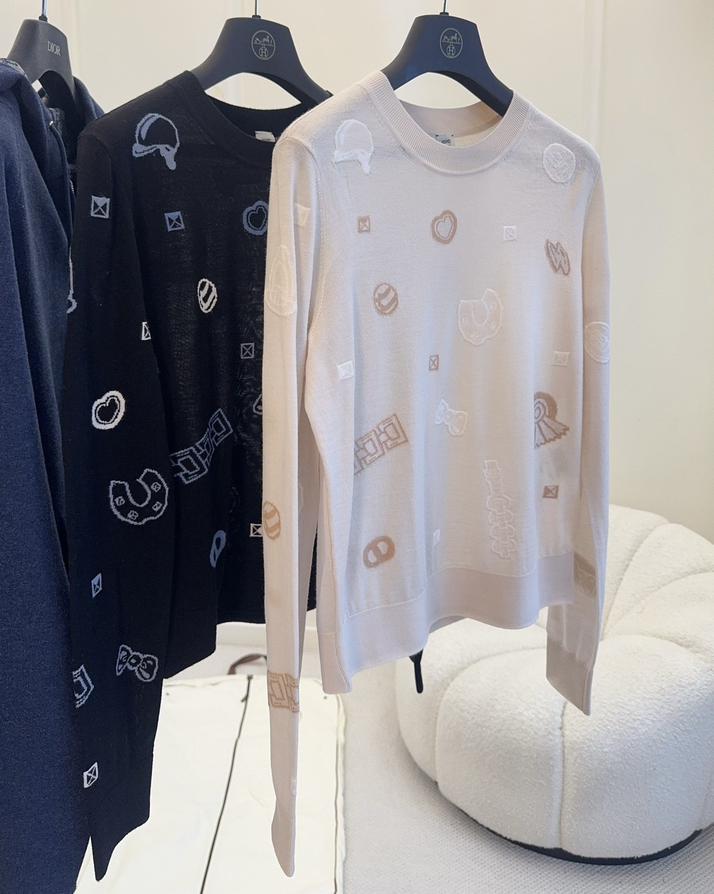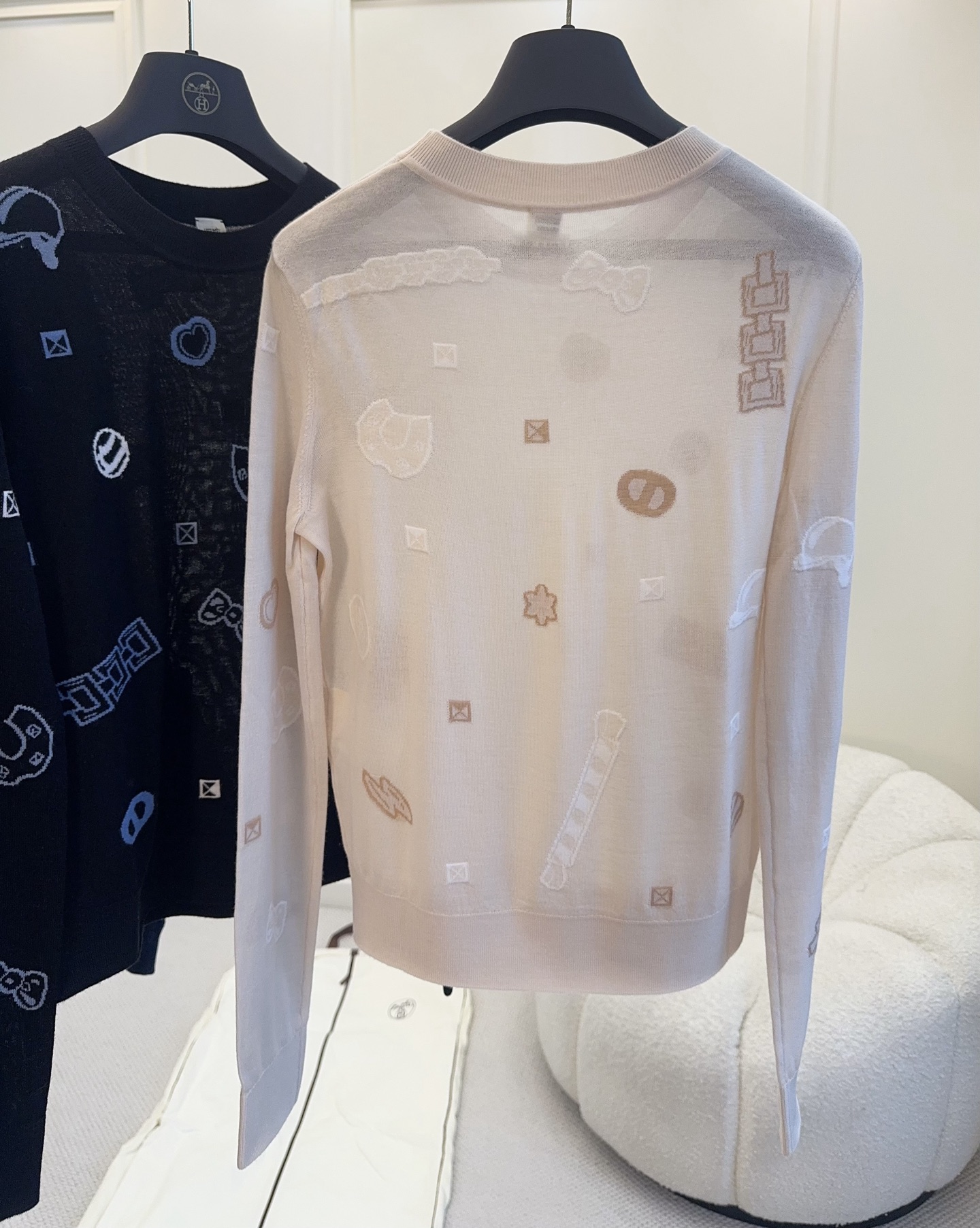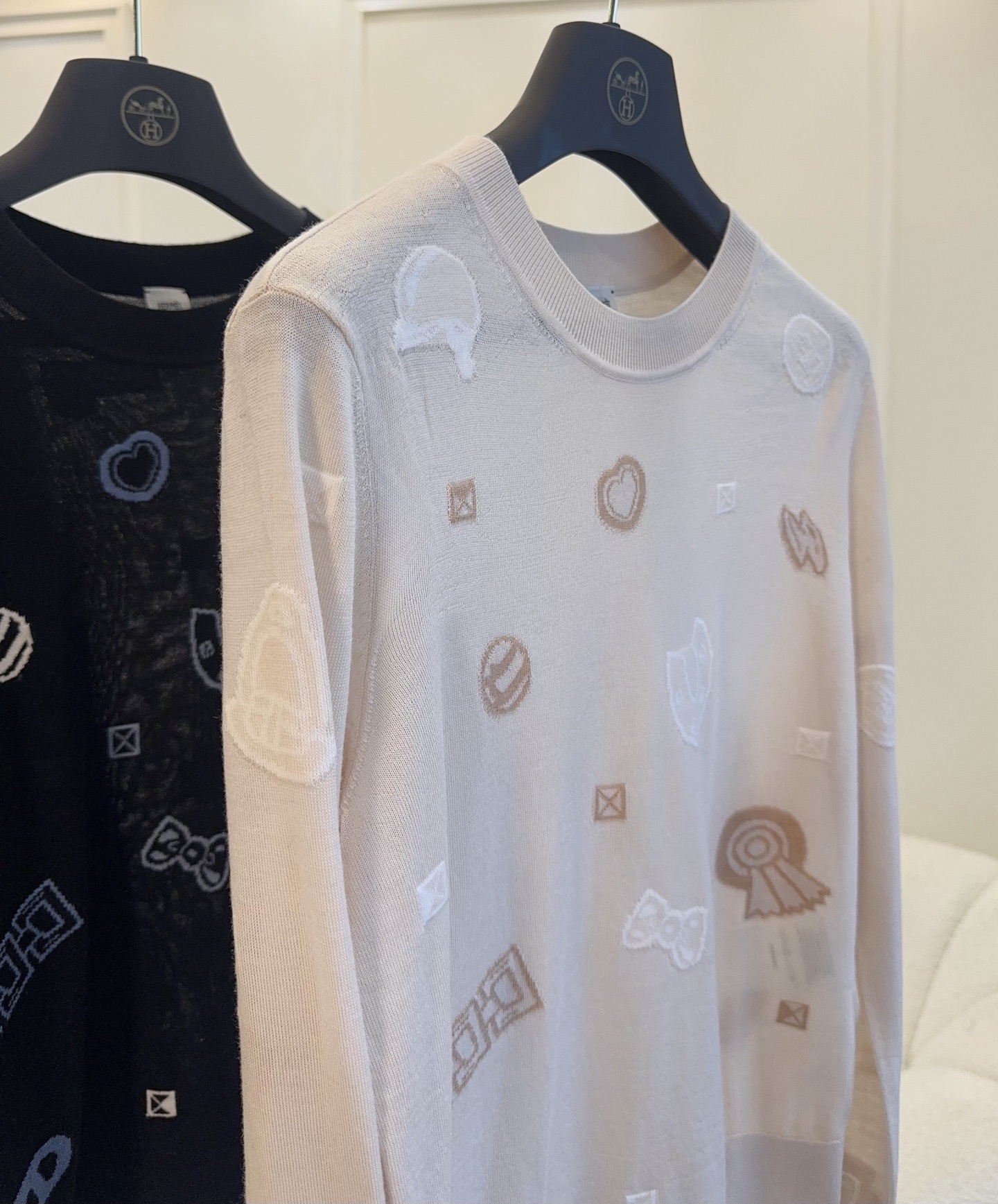 Hermes 2025 early autumn new jacquard knit sweater, 100% ultra-fine first-cut wool, fine knitting, soft and smooth texture, full of small patterns like pig nose and others, double-sided jacquard embroidery, three-dimensional jacquard, lightweight and not bulky, simple and elegant style, looks sophisticated and classy when worn!